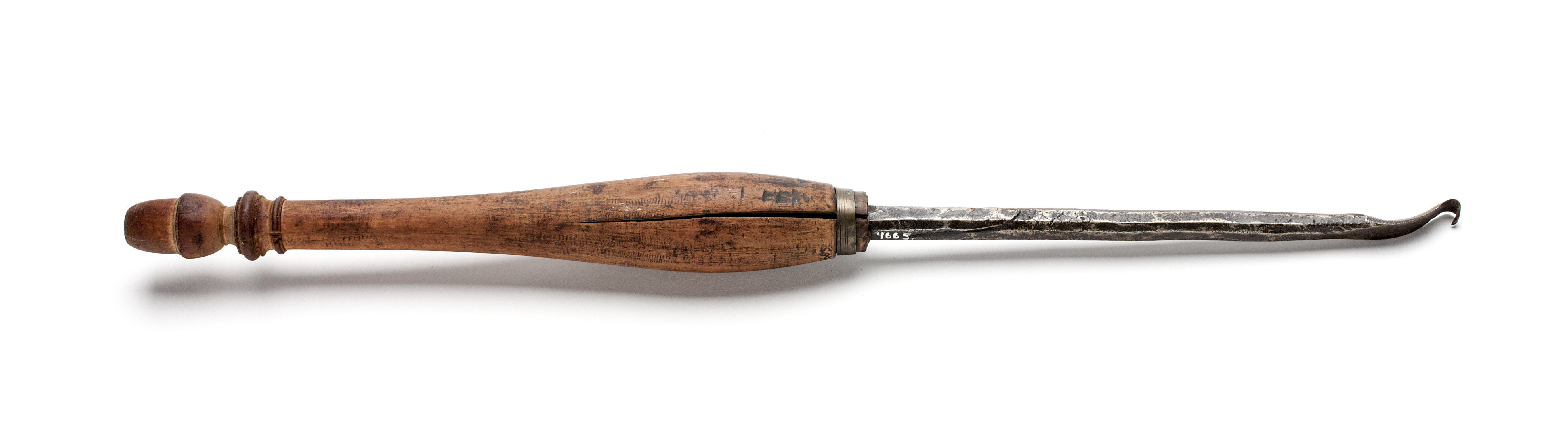 Grovt smidd, rund klinga. Tillplattat och rundat stål med egg efter två sidor. Svarvat skaft med ekollonsliknande knopp av björk, mässingsring.