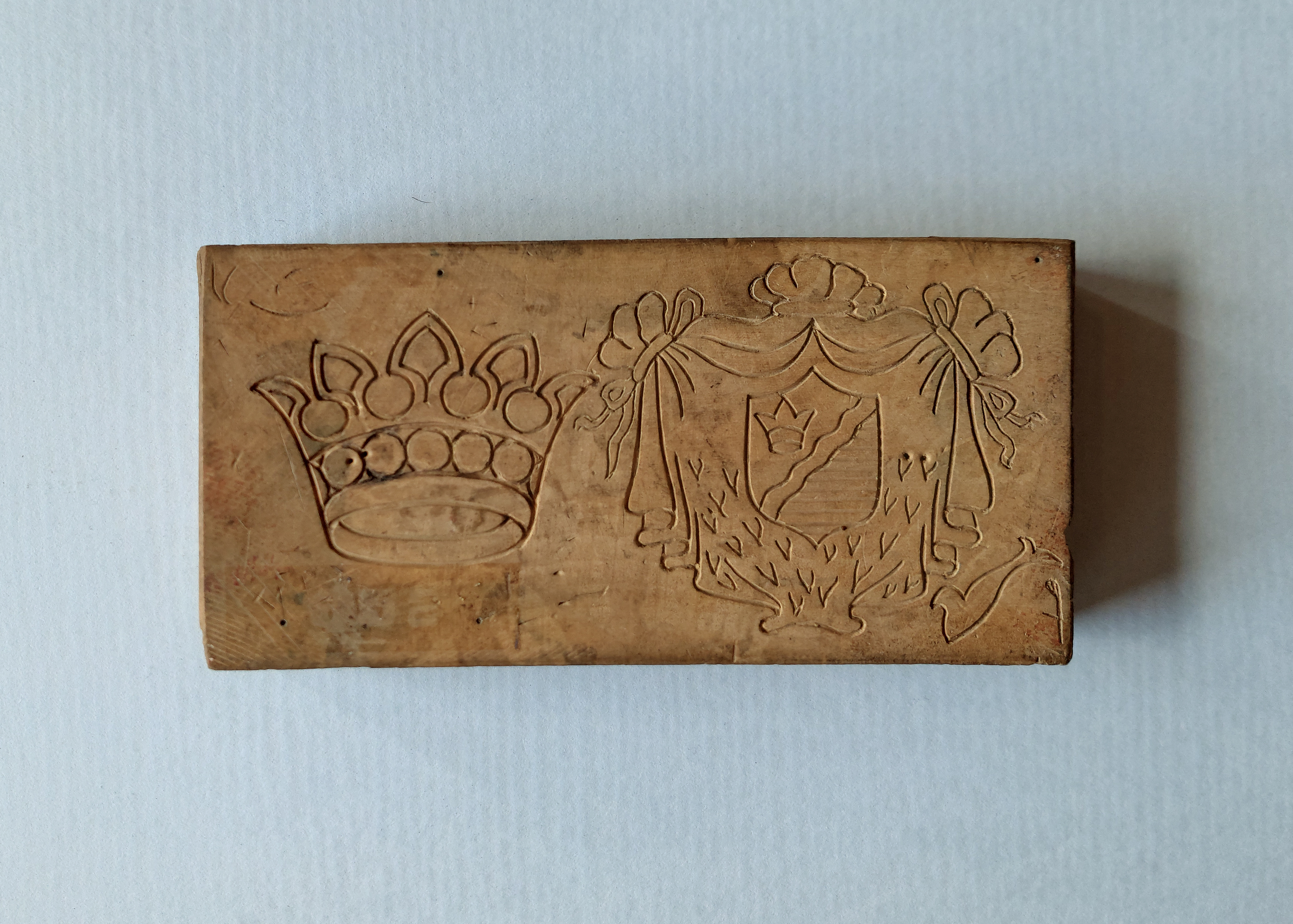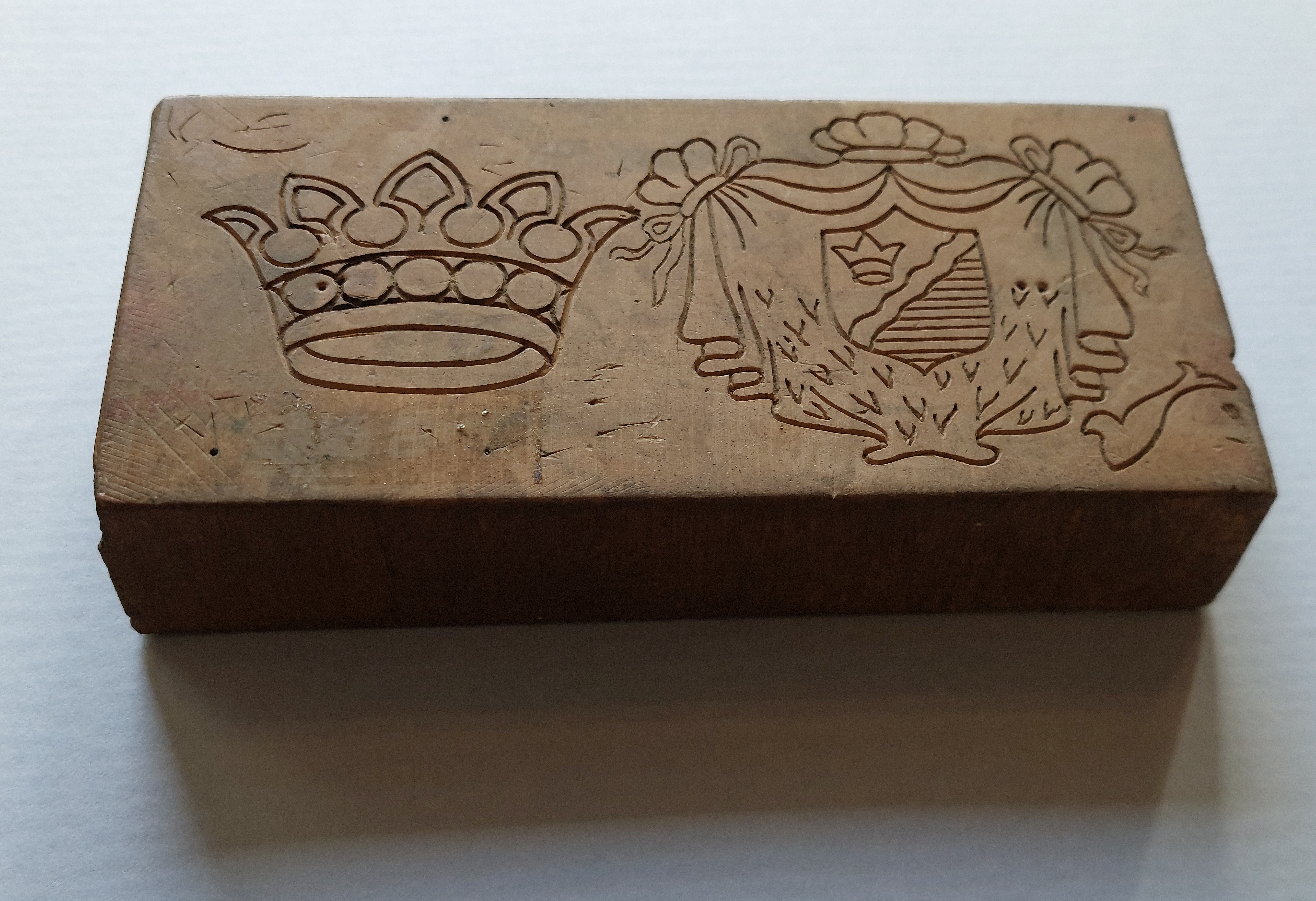Gravyrplatta av trä för enkelverkande vattenmärke. På ena sidan texten "SSSSSSSSSS TUMBA" i två rader. På andra sidan en krona till vänster, till höger en vapensköld inom draperi.