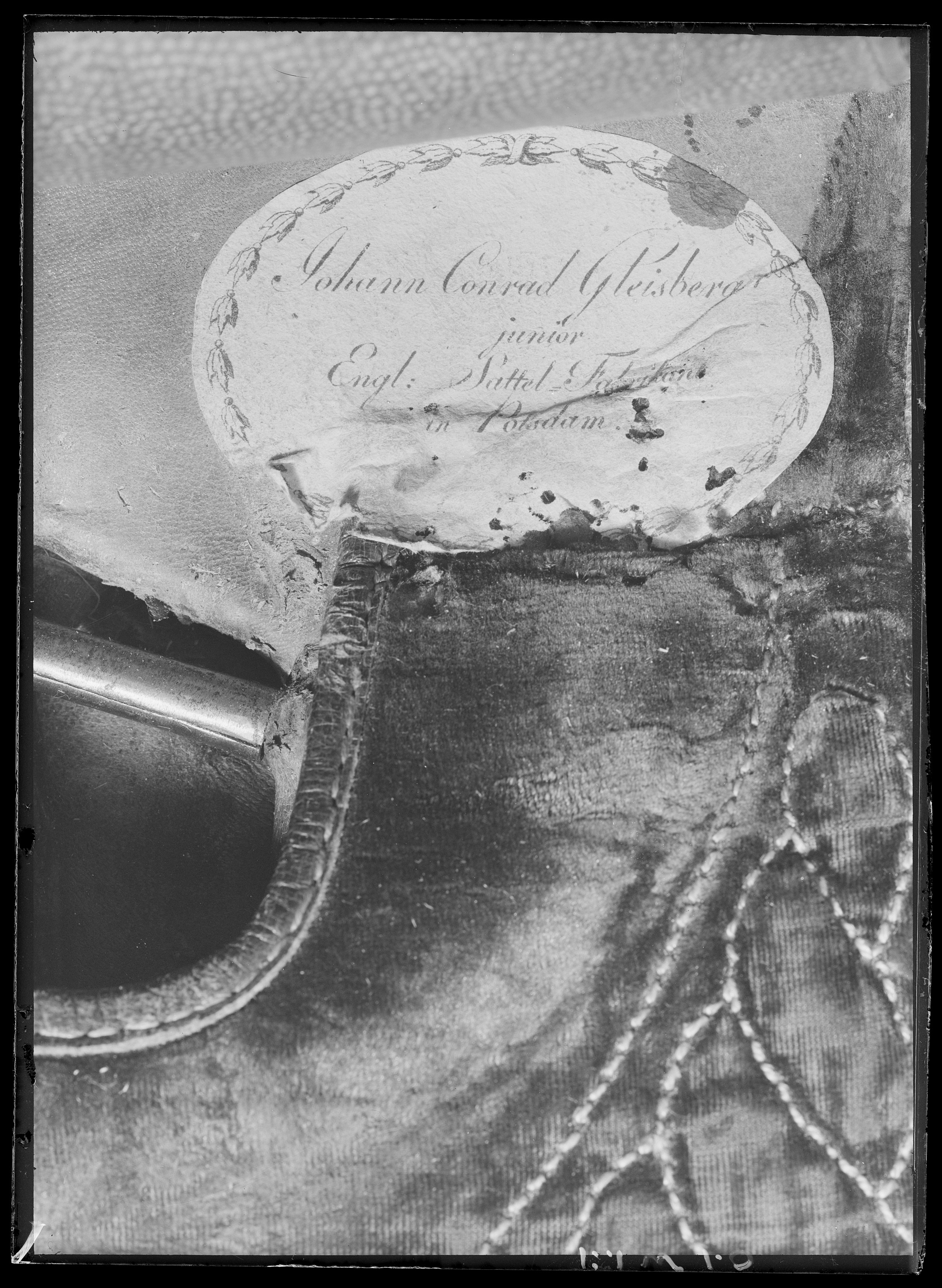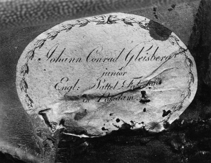 Signatur/Påskrift: Johann Conrad Gleisberg:r // junior // Engl: Sattel Fabrik... // in Potsdam
