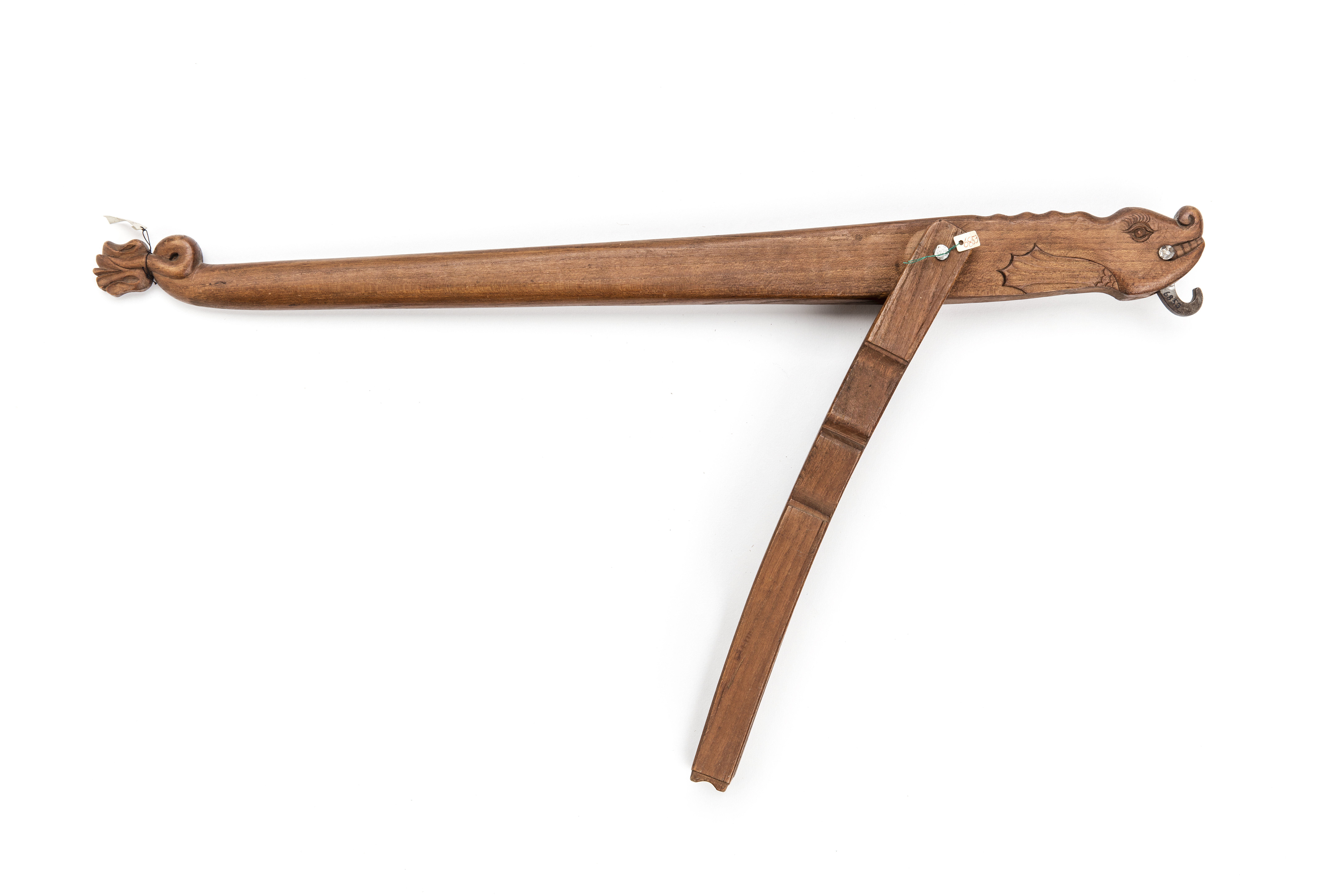 Stång av trä med rektangulärt tvärsnitt baktill snidad i en volut med palmettliknande utskott (fiskstjärt) framtill som ett delfinhuvud med krok av stål i munnen. Arm av trä med profilerade sidor.