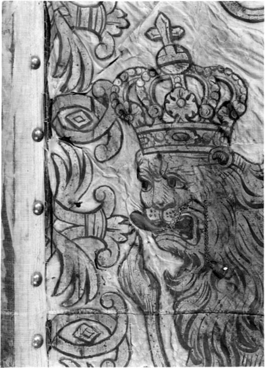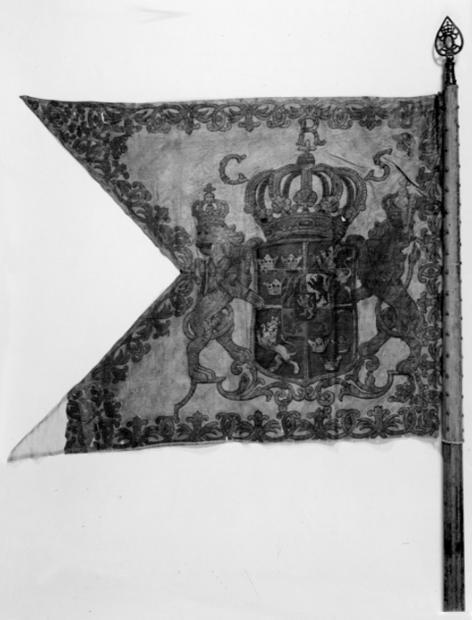 För något dragonregemente under Carl XII. Duk av enkel vit sidendamast. 2 våder horisontellt sammansydda. Liten smal kantfåll. Dekor: målad lika på båda sidor, utom CRS som är felvänt på dukens insida. Svenskariksvapnet under pfalziska huset i guld, silver och färger(rött och blått). Skölden ochde ensvansade sköldhållande lejonen vilar på ett postament av guldarabesker. I båge överkronan CRS. Längs kanten bård i guld bildad av palmkvistar och ornament liknande dubbla C samt i hörnen små, öppna kronor. Konturer i brunt. Fäst med 3 rader tennlickor på vita band. Tarlatan lagd på dukens utsida. Stång av trä, gråvitmålad. Kannelerad. Järnbeslagen. Klack av järn. Löpande bärring.