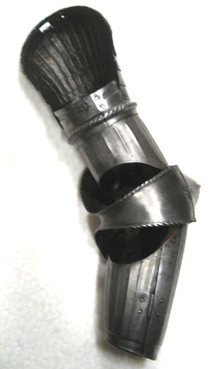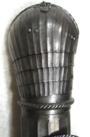 Driven räfflad stålplåt, sammanlagt sex delar. Axelstycke välvt, nedåt avsmalnande. Av fyra skenor, översta störst L 125 mm, med upptill rektangulärt remhål och sölja av stål. Övre kant omvikt och repstavsfilad, därefter slät bård, B 17 mm. På samtliga skenor vertikal räffling och släta sidor. Överarmsskena, rörformig med urtagningar mot armvecket. Av två delar varav den övre slät med driven horisontell ås med snedställda linjer. Mot insidan nitad söm, vid denna utstående nit med ciselerad skalle, diam 10 mm, av stjärna omgärdad av prickar. Nedre delen med vertikal räffling. Delarna sammanfogade med drivna åsar till en i sidled rörlig led. Anmärkning: Spridd svart korrosion. Axelstyckets övre kant skadad. I armskenan både upp- och nertill sprickor. Märkt i rött 2615 g och vitt Lrk 20236. Etiketter axel 2615 k, arm 2615 g. Tidigare upptagen under Magnus Ladulås rustning och under 1800-talet utställd i Riddarholmskyrkan i den sk kungalängden med rustningar som påstods ha tillhört regenter från Birger Jarl till Gustav II Adolf.