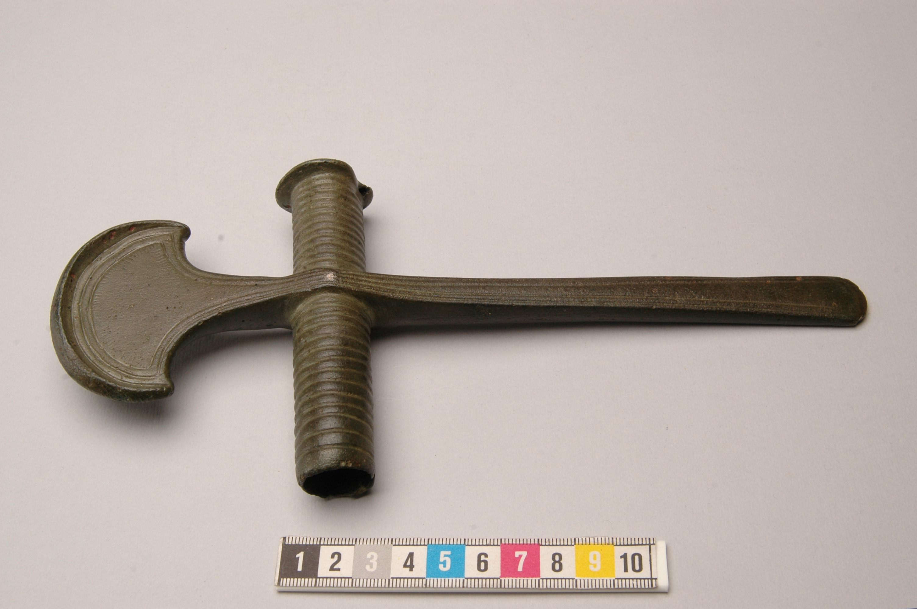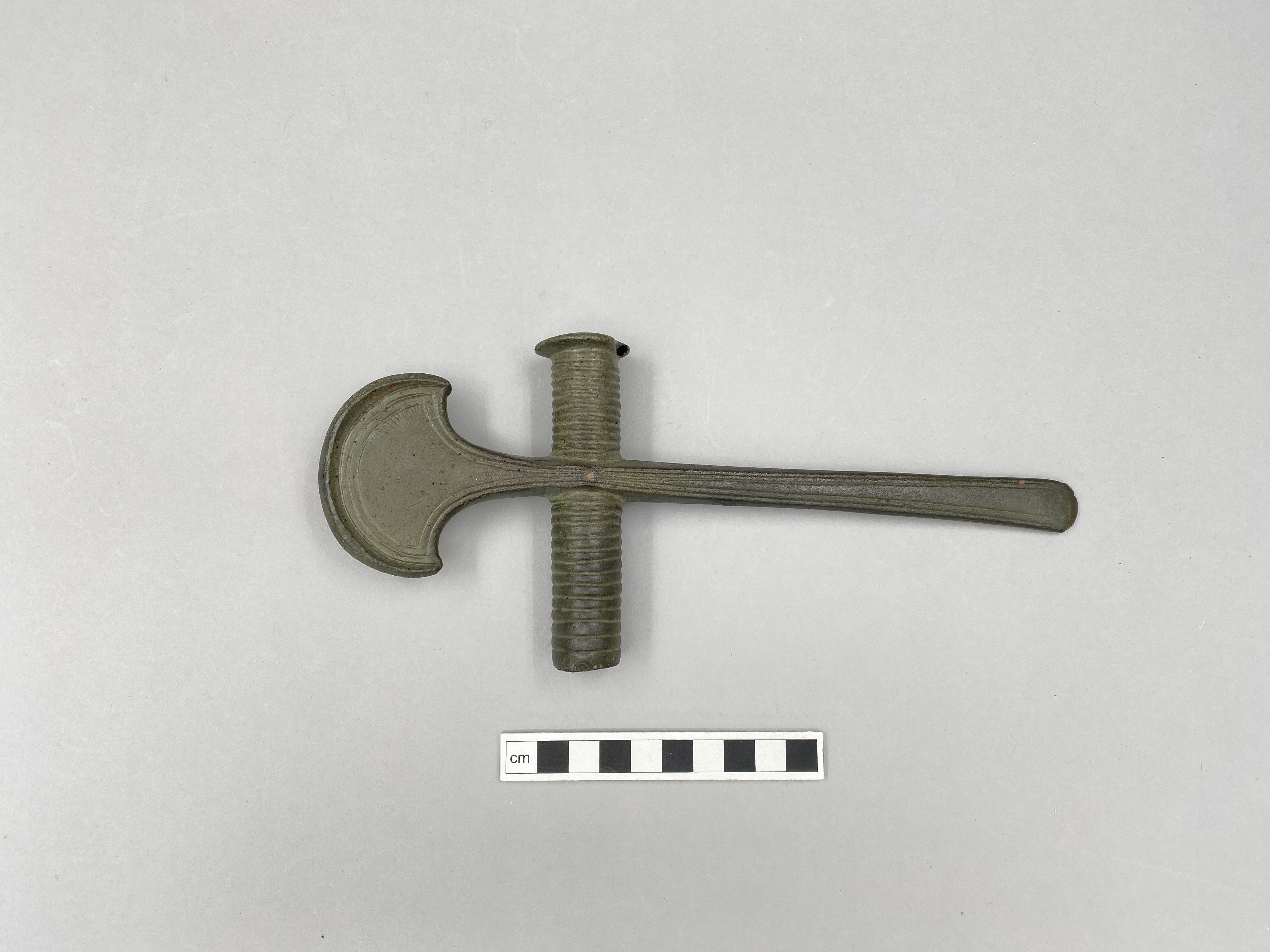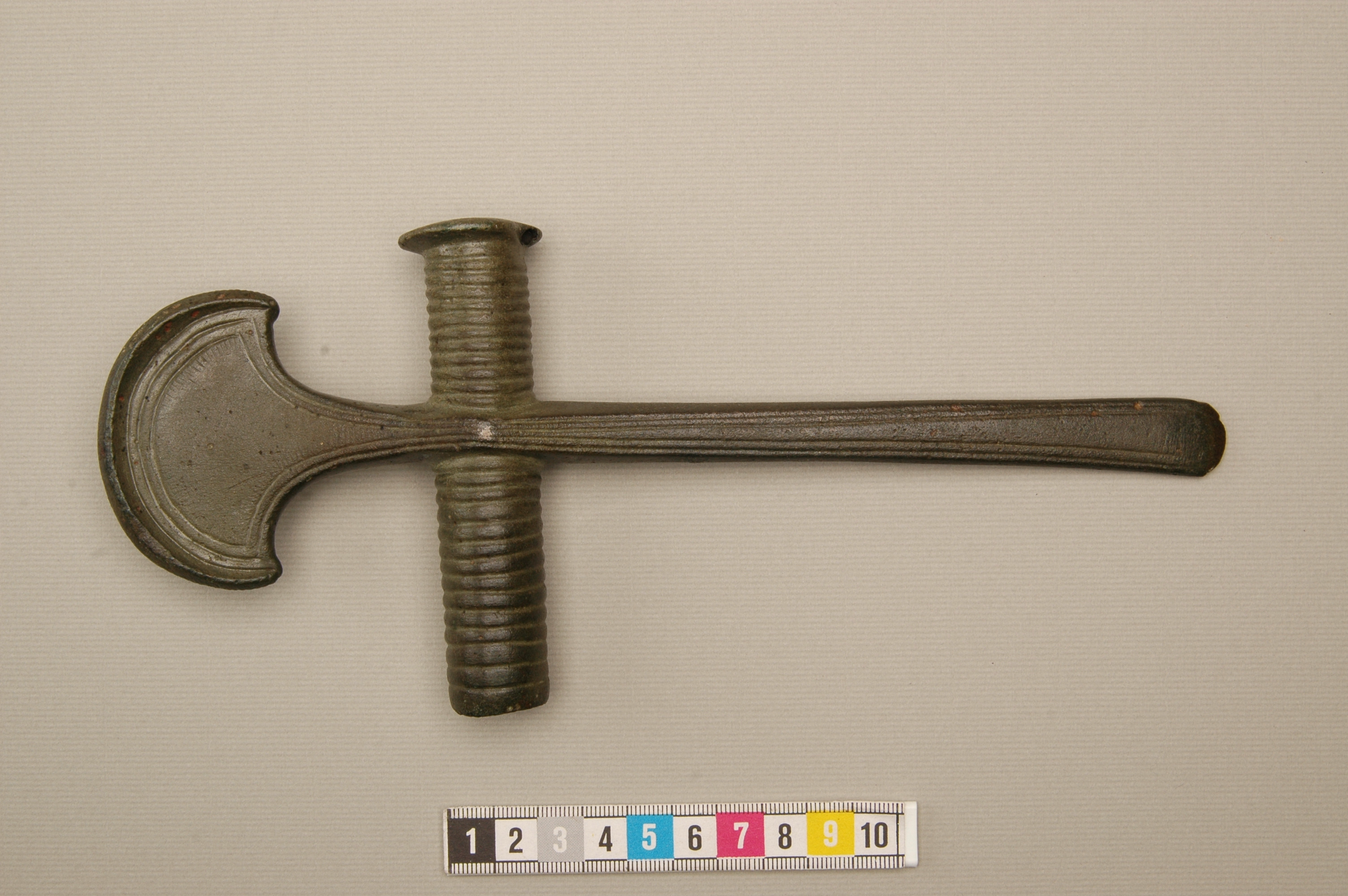 Mejselformig stridsyxa av brons med halvcirkelformigt utvidgat nackparti. Ungersk typ. Ornerad med kanten åtföljande dubbla fåror. På nackpartiet är den inre fårans kant inåt ornerad med vinkelrätt mot den ställda, fina streck. Nackpartiets överkant är likaså ornerad med en rad fina streck. Holken är ornerad med tättställda, runtomgående åsar. Holkens diameter vidgas nedåt, och dess överända är skidformigt avplanad och har ett genomgående, gjutet hål. Holkens nederkant är något skadad.
