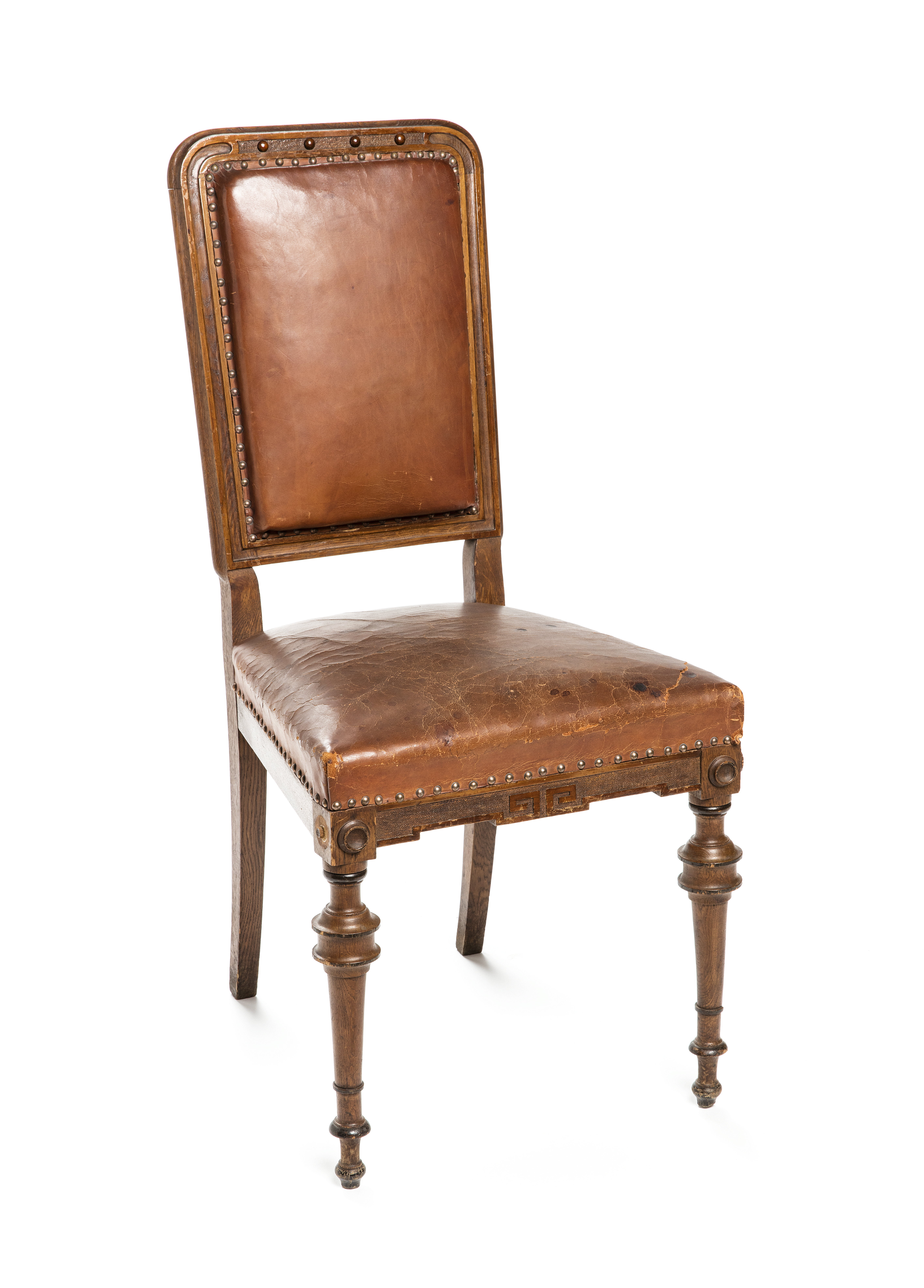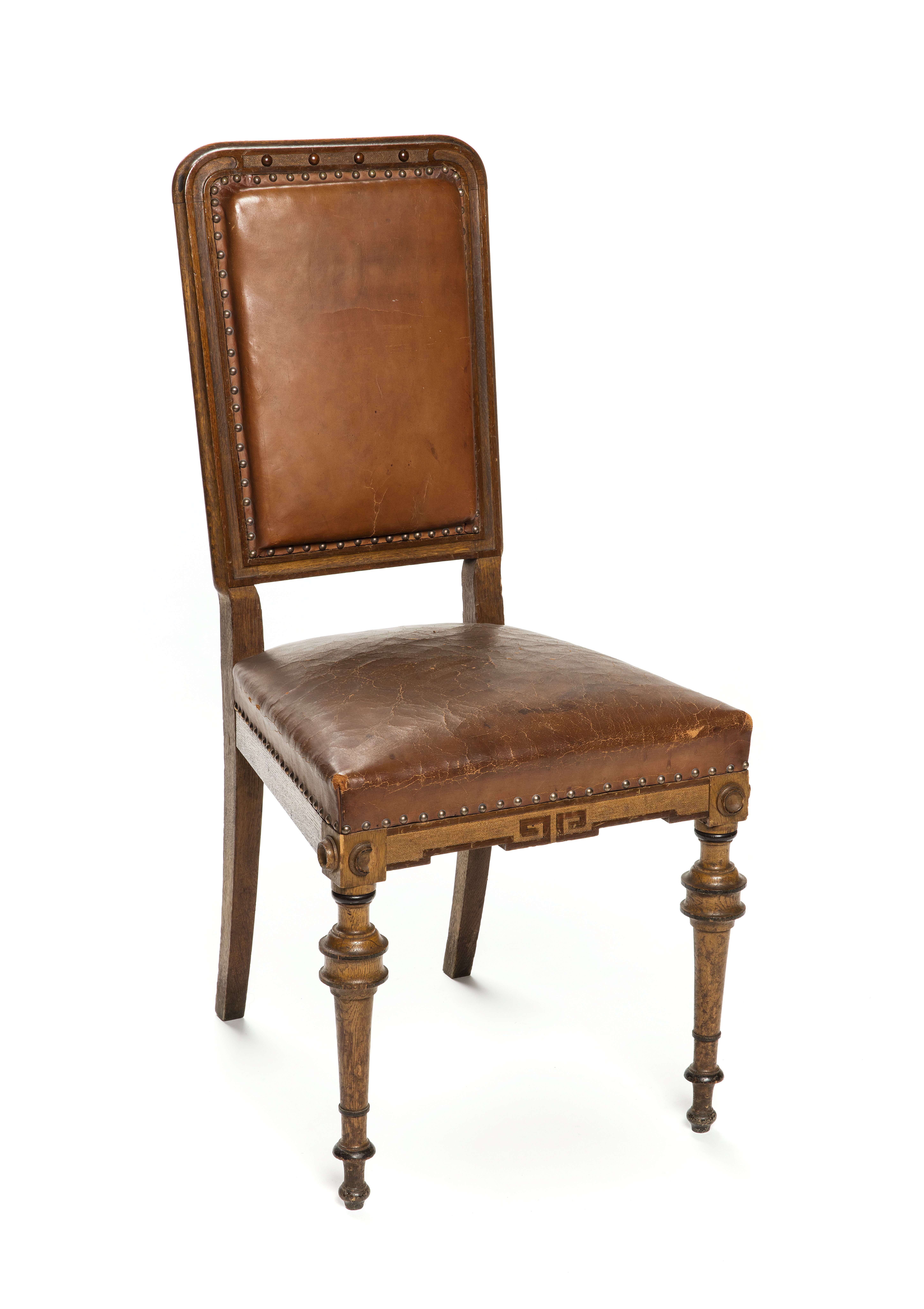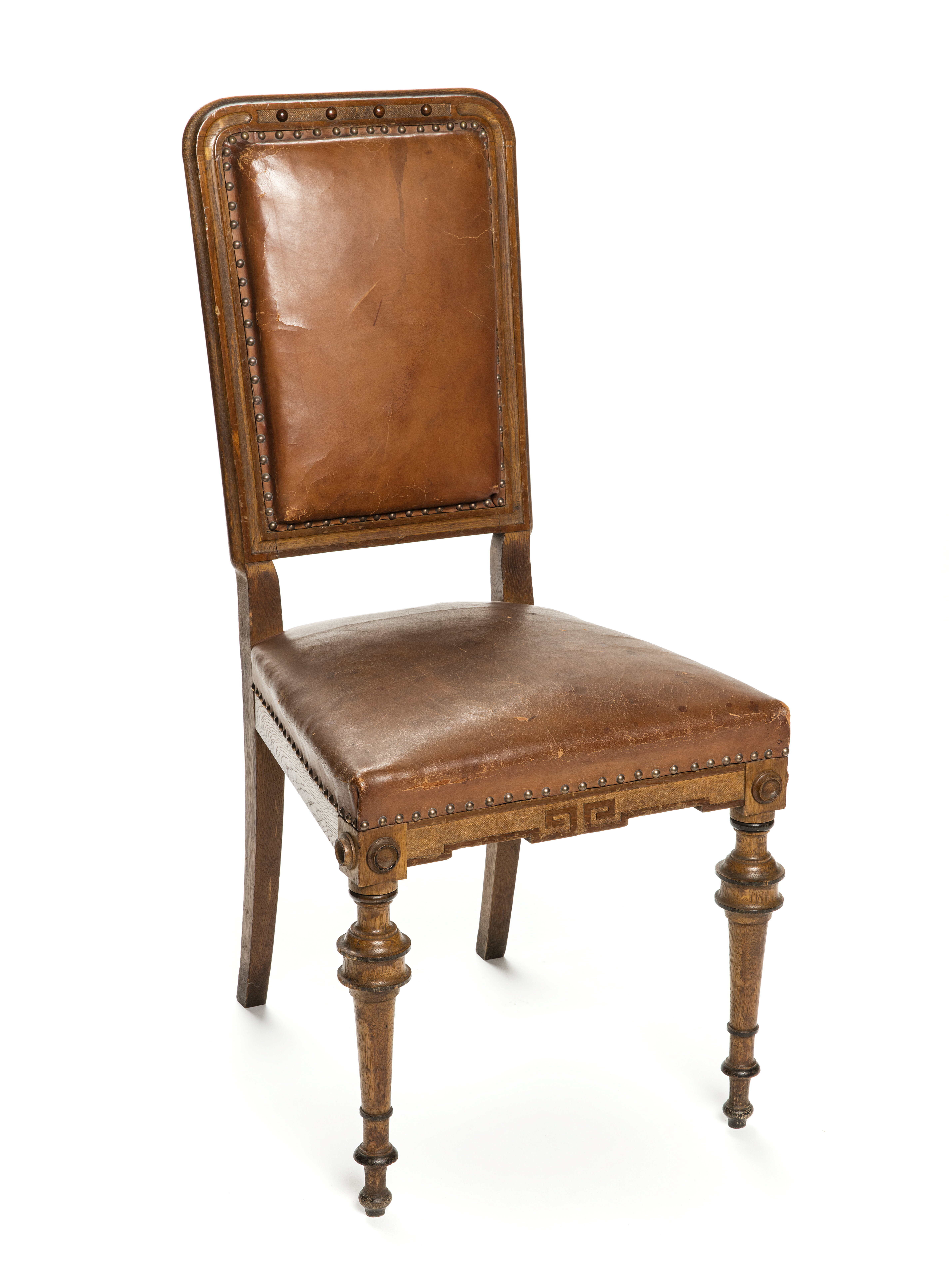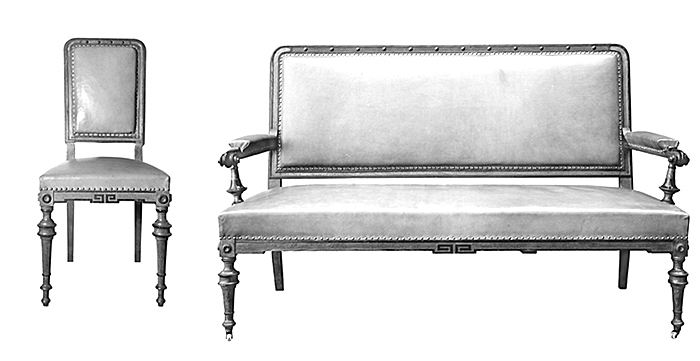 Soffa: Med fyra ben, sarg, sits, rygg och armstöd, stoppad samt klädd med läder. Främre benen svarvade, profilerade samt avsmalnande nedåt, de utstående stavarna och banden brunbetsade, överst en utsparad fyrsidig del för sargen; på vardera av dennas utsidor en pålagd svarvad rosett; bakre benen fyrsidiga, utsvängda bakåt och något avsmalnande nedåt. Stolar: Ben, sarg, sits och rygg som soffans; bakbenen något mindre utsvängda, i den insänkta bottnen på ryggen endast fyra knoppar. Sits och rygg stoppade och klädda som soffan. Tillhört inventarierna på firman Wilh. H. Kempes ( innehavare Walther von Hallwyl och Johanna Kempe, f. Wallis) kontor, inrymt i Blasieholmstorg 11, 1884 - 30 September 1896, och Hamngatan 4, 1 Oktober 1896 - 1909; sedermera på Walther von Hallwyls privata kontor 1909 - 1921 samt slutligen på Wilhelmina von Hallwyls f. Kempe, kontor där från sistnämnda år t.o.m. 1930.