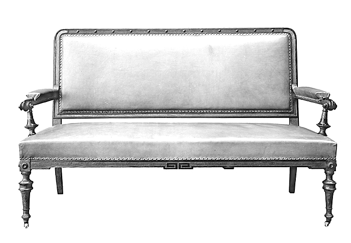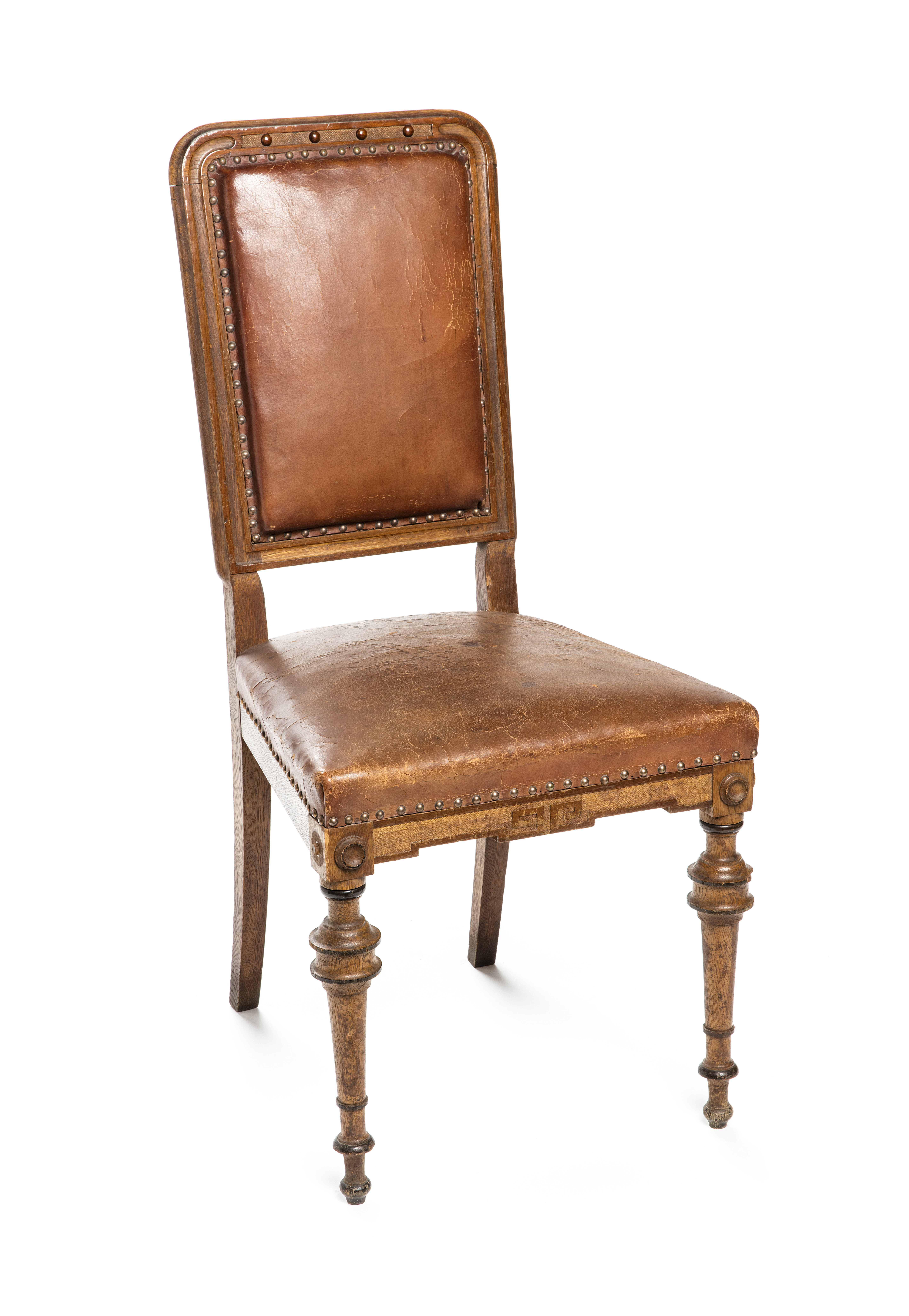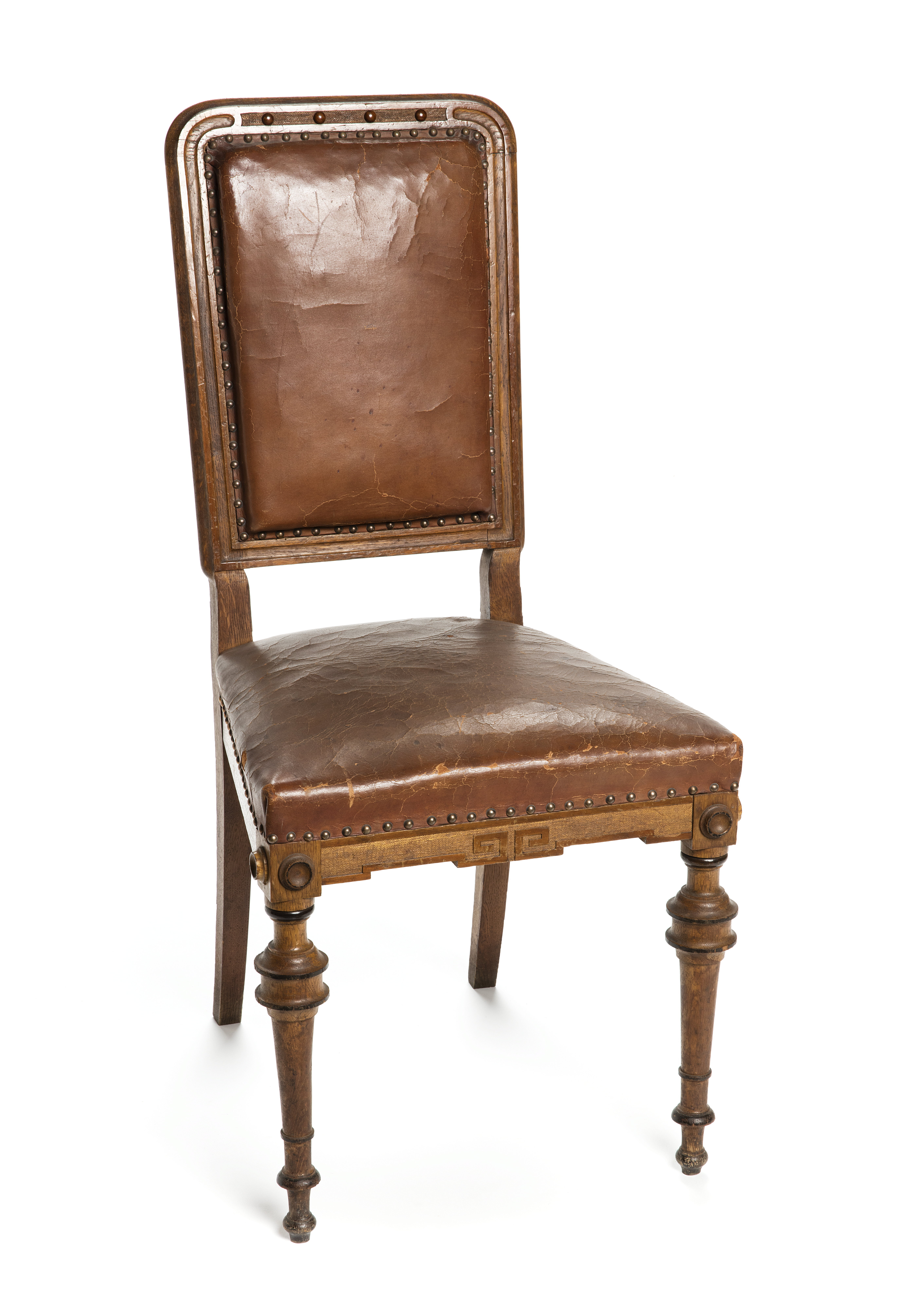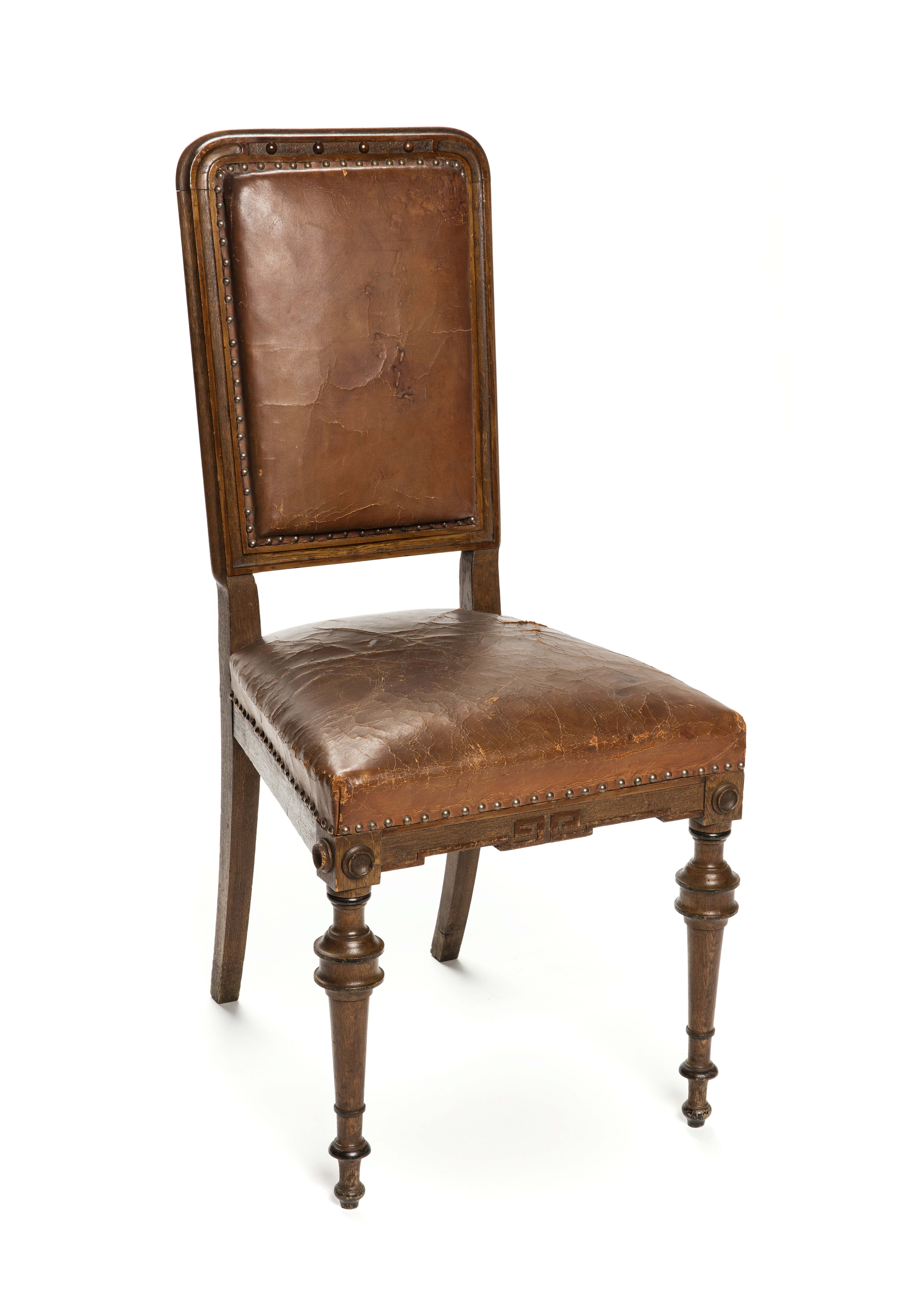 Soffa: Med fyra ben, sarg, sits, rygg och armstöd, stoppad samt klädd med läder. Främre benen svarvade, profilerade samt avsmalnande nedåt, de utstående stavarna och banden brunbetsade, överst en utsparad fyrsidig del för sargen; på vardera av dennas utsidor en pålagd svarvad rosett; bakre benen fyrsidiga, utsvängda bakåt och något avsmalnande nedåt. Stolar: Ben, sarg, sits och rygg som soffans; bakbenen något mindre utsvängda, i den insänkta bottnen på ryggen endast fyra knoppar. Sits och rygg stoppade och klädda som soffan. Tillhört inventarierna på firman Wilh. H. Kempes ( innehavare Walther von Hallwyl och Johanna Kempe, f. Wallis) kontor, inrymt i Blasieholmstorg 11, 1884 - 30 September 1896, och Hamngatan 4, 1 Oktober 1896 - 1909; sedermera på Walther von Hallwyls privata kontor 1909 - 1921 samt slutligen på Wilhelmina von Hallwyls f. Kempe, kontor där från sistnämnda år t.o.m. 1930.