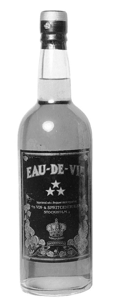 EAU-DE-VIE, 3-stjärnig, tre helbuteljer Buteljer av färglöst glas. Cylindriska, med kupigt indragen skuldra och svagt spolformig hals, kring vars mynning en bred bandliknande utsvällning (s. k. stärkring); nedanför denna en utstående skarp kant; bottnen svagt skålig. Etikett svart, på denna i guld: EAU-DE-VIE, tre stjärnor, text samt nederst varumärke (kunglig krona med årtalet 1917). Kapsyl av förtent bly, svart, kring övre änden en bård i guld, ovanpå Vin- & Spritcentralens varumärke i relief jämte omskrift. Höjd: 30 cm.; diameter: 8,2 cm. Inköpta av Walther von Hallwyl något av åren 1917-1921.