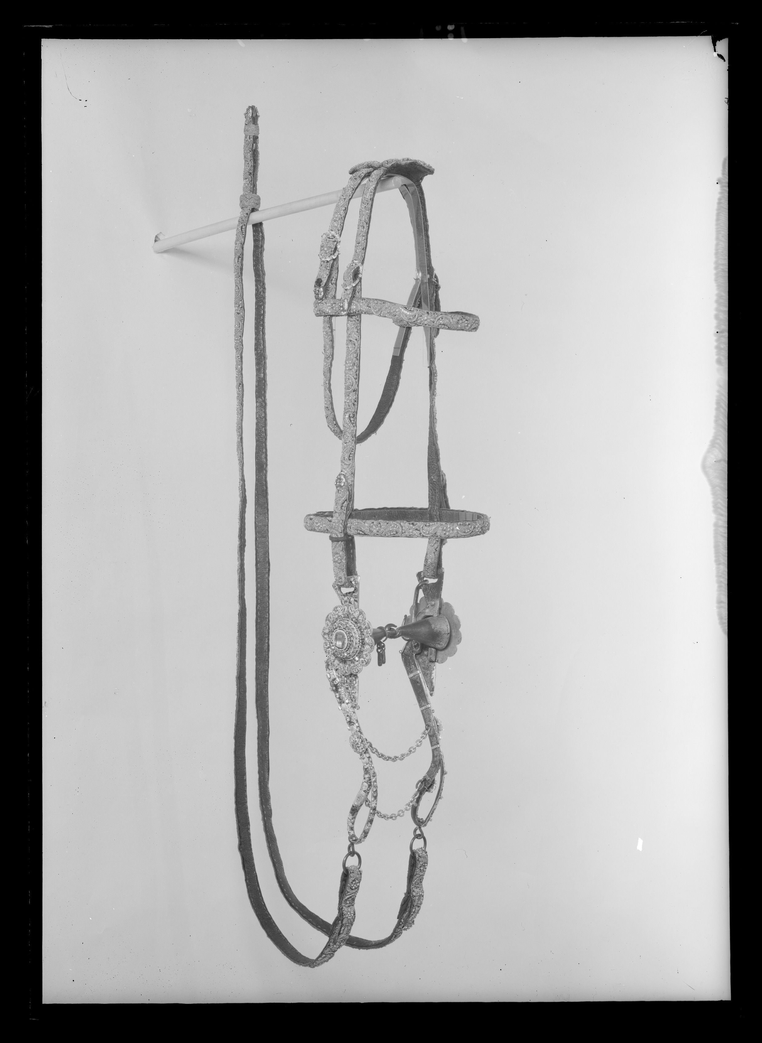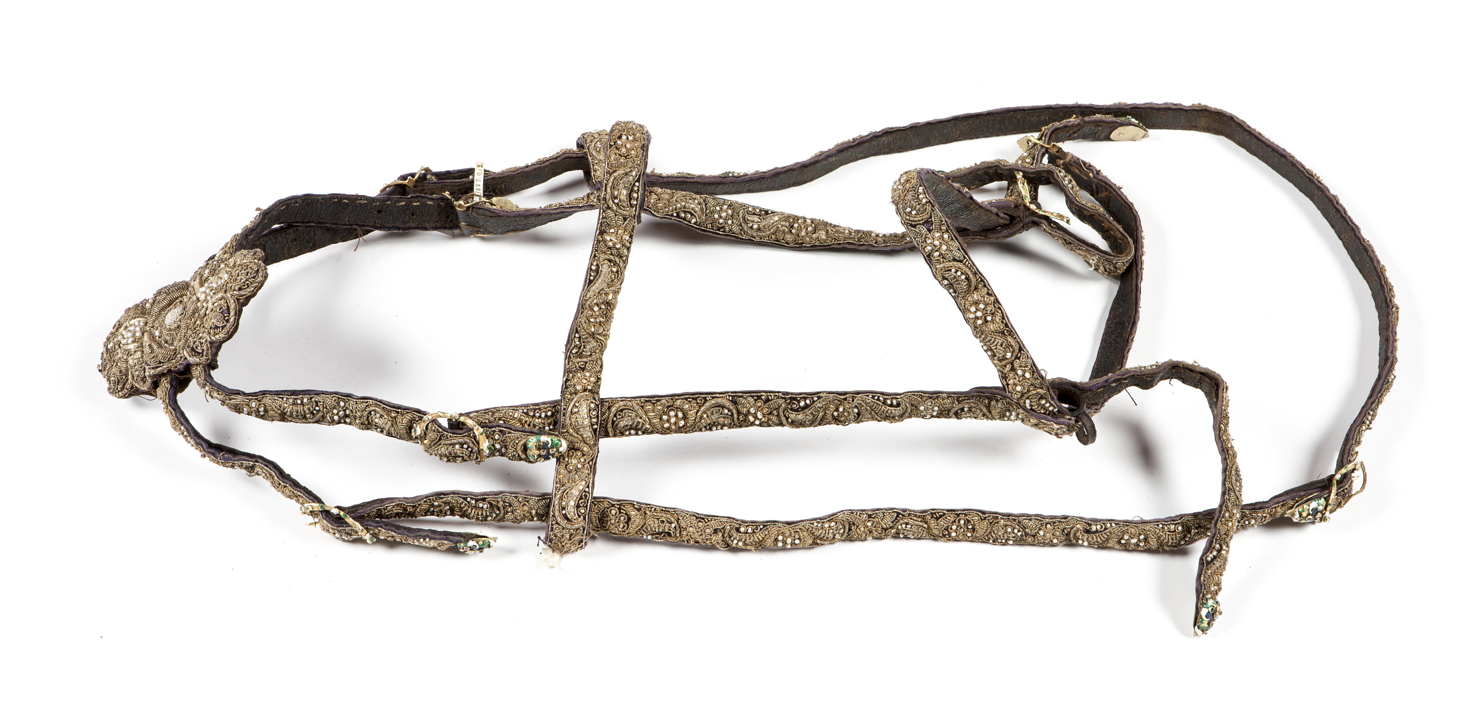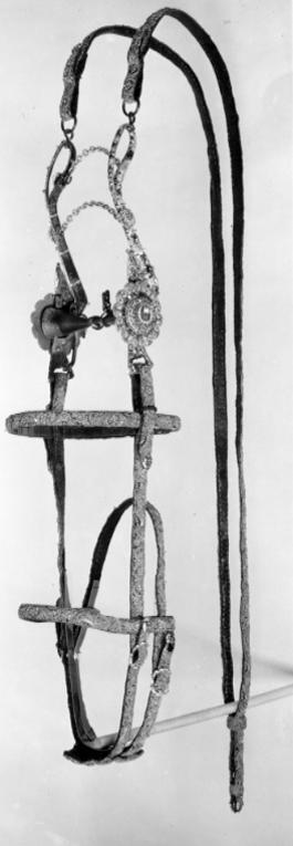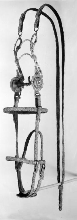Huvudlag av läder överklätt med lila sammet broderat med guldtråd, guldlan, kantiljer och pärlor i rankmönster. Sidostycken, pannrem, nackrem och nosrem, samtliga ca 18 mm breda. Dubbla nackremmar sammanhållna med ett ovalt konturerat läderstycke med lika broderi som huvudlaget i övrigt. Totalt sju ovala konturerade söljor av förgylld mässing samt nio ändbeslag av samma material med emaljdekor. Huvudlaget tillverkades till Karl X Gustavs kröning 1654. Vid tillfället flyttades då söljor och remändbeslag från det ursprungliga garnityr som burits av kröningshästen vid drottning Kristinas kröning 1650.