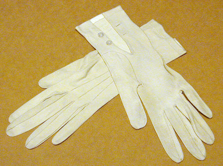 Vit sämskskinnshandske, lång, över handleden med två plana pärlemorknappar, d: 10 mm. Vändsydda knapphål. På ovansidan tre längsgående prydnadssömmar. Inuti kantad med ett band vitläder. Blekt stämpel med texten: "Gunterie de Luxe // J.LANG FAB. // - PARIS -".