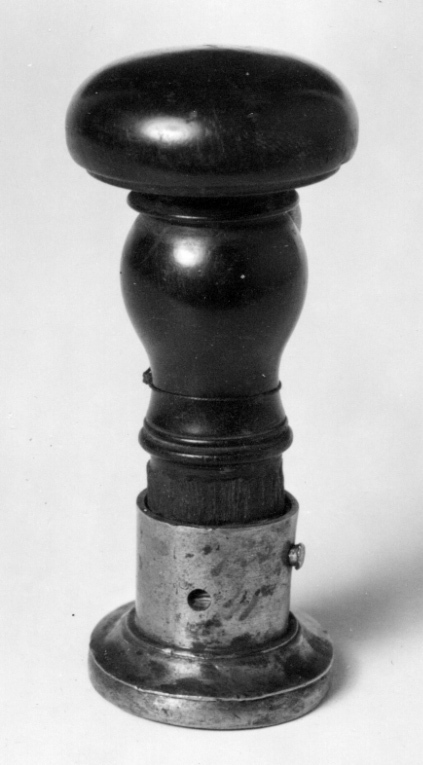 Oval platta av stål, däri graverat vapen, skrafferade färgangivelser. Sköld av fransk typ, kluven av tre kronor och folkungalejonet, på sänkt mantelsnitt Södermanlands grip, hjärtsköld krönt av kunglig krona, Holstein-Gottorp. Runt skölden hänger Nordstjärne-, Svärds- och Serafimerordens kedjor med tecken. Vapentält krönt av svensk hertigkrona, bakom tältet två korslagda ankare. Slät kantring. Plattans rand svagt rundad, ovansidan konisk och något skålad, cylindrisk holk, h: 18mm, d: ca 22 mm. Svarvat skaft av ebenholts, balusterformig nedre del, upptill rund skiva med välvd ovansida och rak undersida, d: 40 mm.