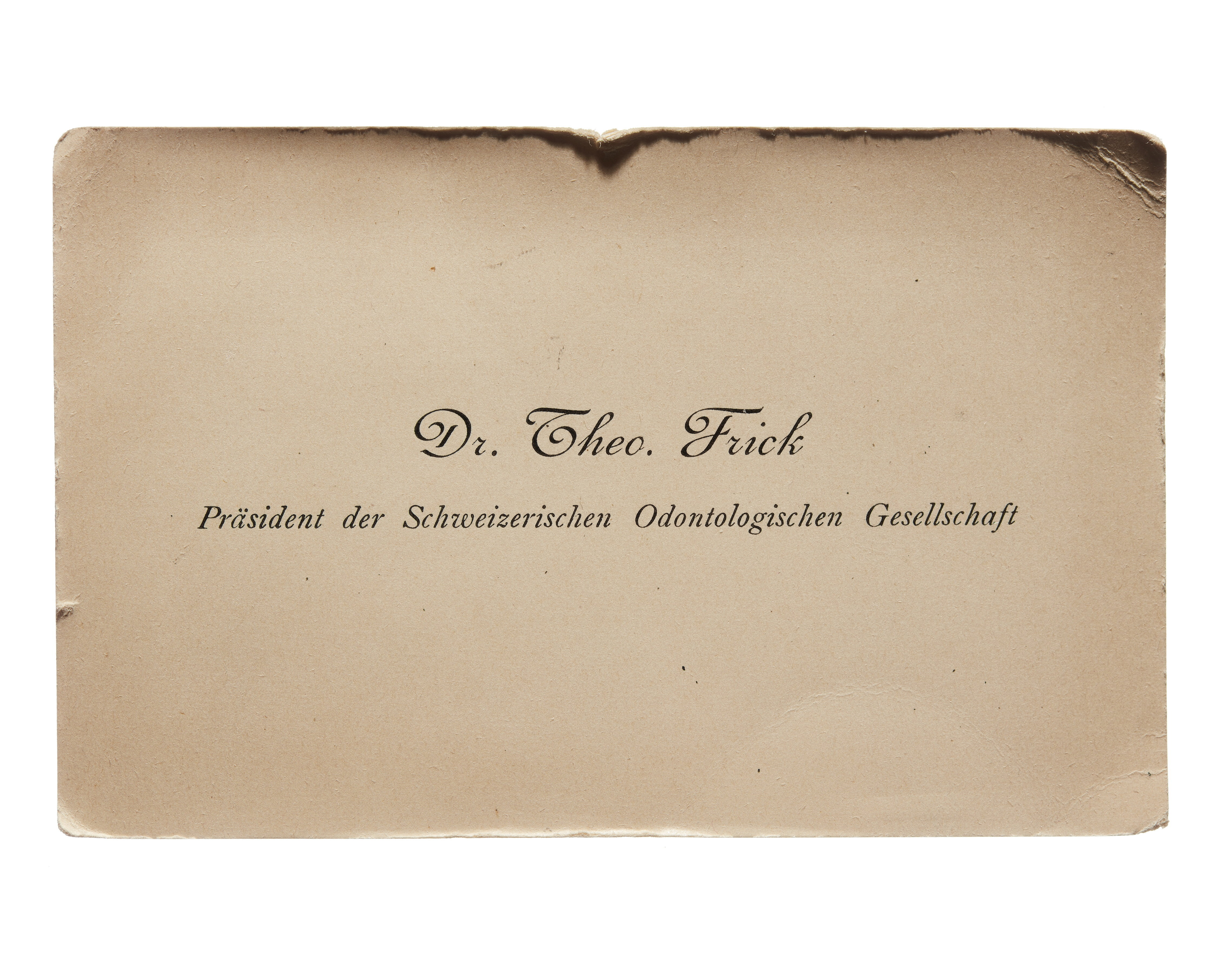 Ett visitkort från Dr. Theo. Frick, Präsident der Schweizerischen Odontologischen Gesellschaft.