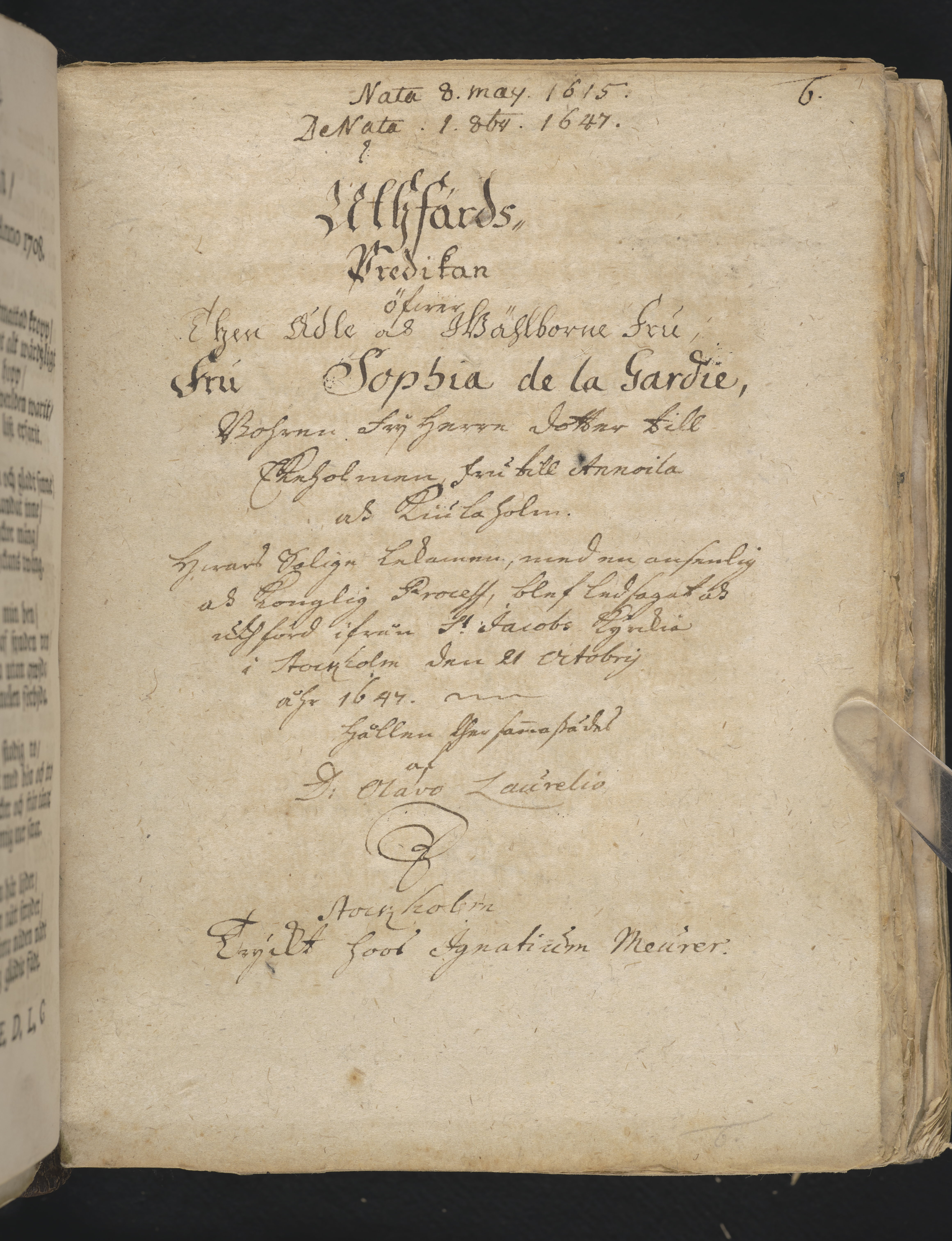 Uthfärds-predikan öfwer Sophia de la Gardie, bohren frijherre dotter till Ekeholmen... hwars salige lekamen... blef... ledsagad och utförd ifrån St. Jacobs kyrckia i Stockholm den 21 octobrij åhr 1647. Hållen... af D. Olavo Laurelio. Stockholm tryckt hoos Ignatium Meurer.