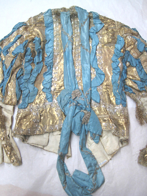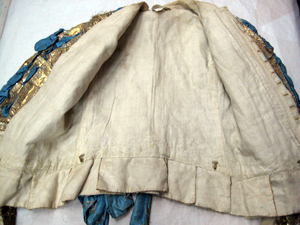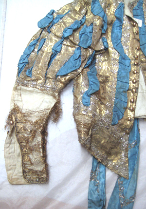 Jacka med kort flikigt skört bestående av tio, trapetsformade skörtkappor. Jackan är av guldtyg med slitsar med blå sidenplösar. Den garneras av silverspetsar av silvertråd och smala silverlan. Jackan har en knäppning mitt fram bestående av 14 kupiga knappar av förgylld mässing. Halslinningen är rundad, kantad av silverspets. Ärmarna är långa med dubbla ärmpuffar med slitsar. Sprund vid ärmsluten, kantade av en knäppning bestående av sex förgyllda mässingsknappar. Från axlarna hänger ned två bindlar av två blå sidenband, garnerade med silverspets med rosetter i ändarna. Jackan har ett mellanfoder av grov gråaktig linnelärft samt ett innerfoder av en tunnare, vit linnelärft. Pappersetikett vid halslinningen med påskrift med svart bläck: "A//No 3". Fram sitter fastknutet en vit pappersetikett med påskrift med svart bläck: "Rosersberg 1945// nr XXX IX:I// Ad. Fredrikstorg// 1777?" Kostymen användes vid torner- och karusellspel under 1770-80-talen. Möjligen bars dessa dräkter av pagerna i Gustav III:s kadrilj 1777. Färgerna överensstämmer med dem i kungens egen dräkt samt hästarnas och riddarnas utrustning.