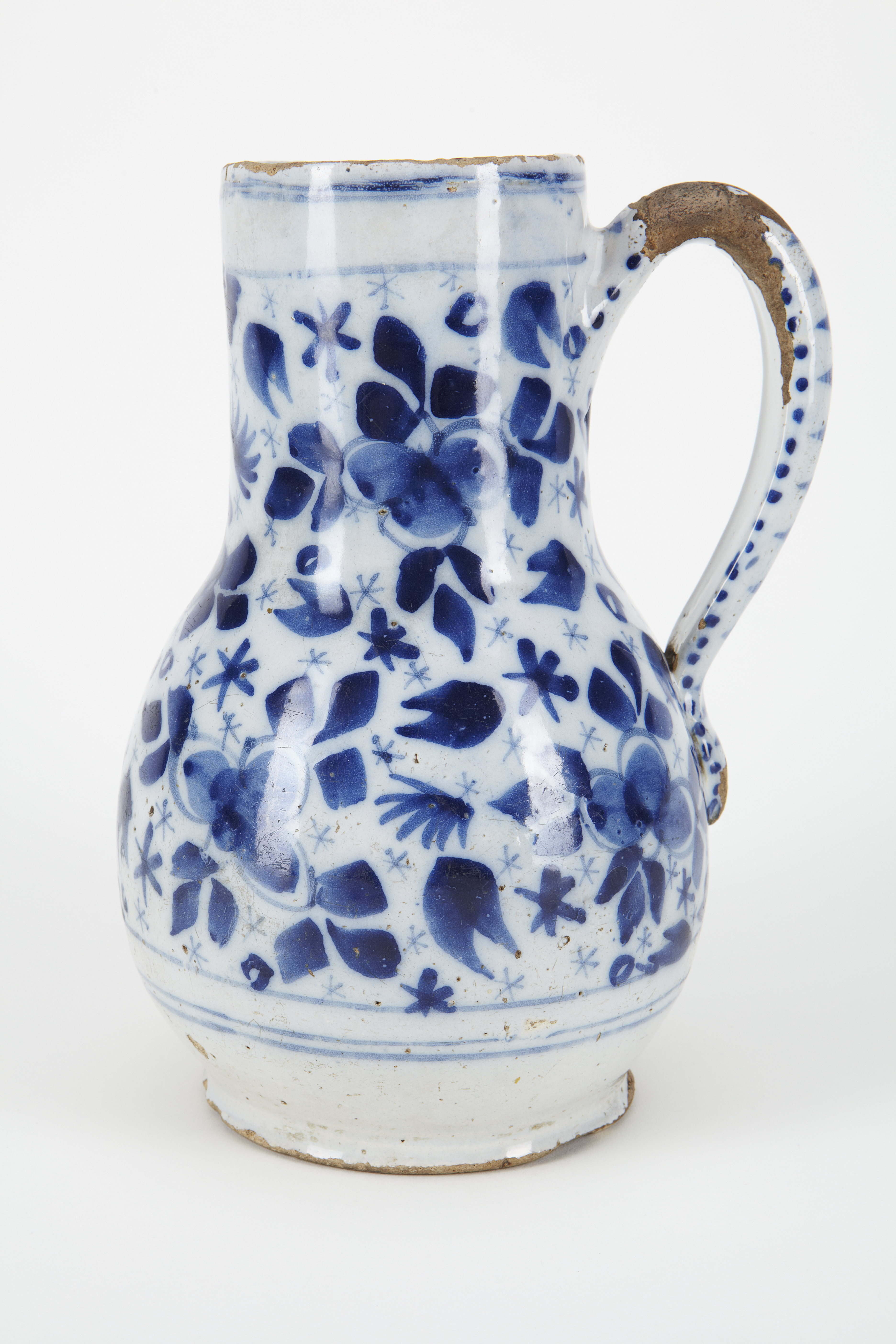 KANNA. Vulstig, med cylinderformig överdel samt på något utsvängd låg fot. Hänkel bågformig, med flackstavig utsida och platt insida. Dekor: I blått på tennglasyr. Godset blekt rödgult. På utsidan ett tätt, något oregelbundet mönster av blommor och blad, mellan dessa större och mindre stjärnor; mönstret upptill och nedtill begränsad av en rand. Runt mynningen och nederdelen två ränder. På hänkelns utsida en rad tvärgående ränder, utmed kanterna en rad prickar. På bottnens utsida en märkning. Höjd 21 cm, diameter 13,5 cm