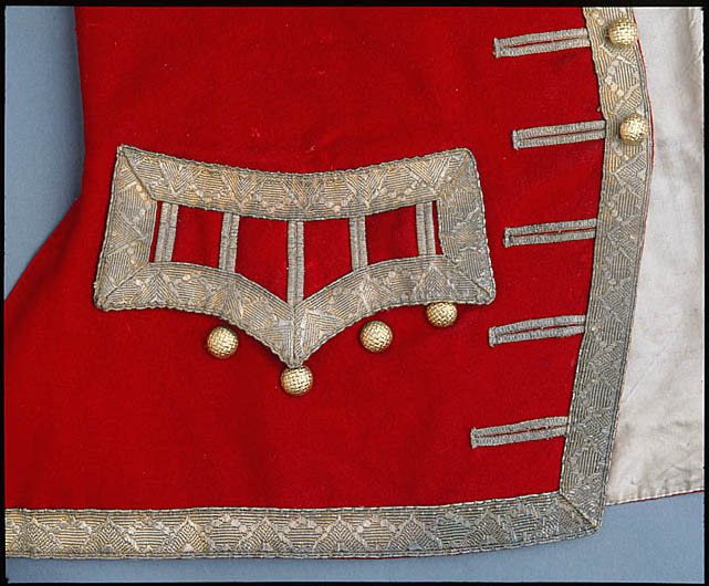 Kroppsnära svagt utställd väst i rött kläde med guldgaloner längs kanterna och runt ficklocken. Dekorativa guldkantade knapphål längs framkanten på båda framstyckena och runda metallknappar. Västen är skuren i fyra stycken med sprund i sidorna och mitt bak. Klädet har öppna kanter mot ärmhål, framkanten, sprundkanterna och nedtill. Endast halsringningen har invikt kant som dessutom är förstärkt baktill. Längs framkanten och längs halsringningen fram sitter guldgaloner 2,4 cm breda. Knapphålen börjar under dessa. Galonerna är i ripsbindning med silkesvarp och inslag av guldlan? Galonerna sitter även längs nederkanten på framstycket. Fickorna har trekantiga öppningar och överlappande ficklock. Ficklocken är svagt kronformade med böjd överkant och galoner runt lockets alla sidor. Fem markerade knapphål sitter på locket, de har aldrig öppnats utan är en prydnad. Under ficklocken sitter på vardera sida 4 knappar, märken syns efter den femte. Detta är samma sorts knapp som mitt fram. Västen knäpps med 11 förgyllda metallknappar som börjar 3,5 cm från halsen och återkommer med 5 cm mellanrum. Knapphålen är guldkantade och 5 cm långa, de är inte helt uppsprättade eftersom knapparna är små. Knapphålen har mer ett dekorativtsyfte än praktiskt. Det är 14 st knapphål på vardera sida, (endast 11 sprättade) Framkanten öppnar sig vid sistaknappen och vid nederkanten är västen öppen 12 cm, även då den är knäppt.