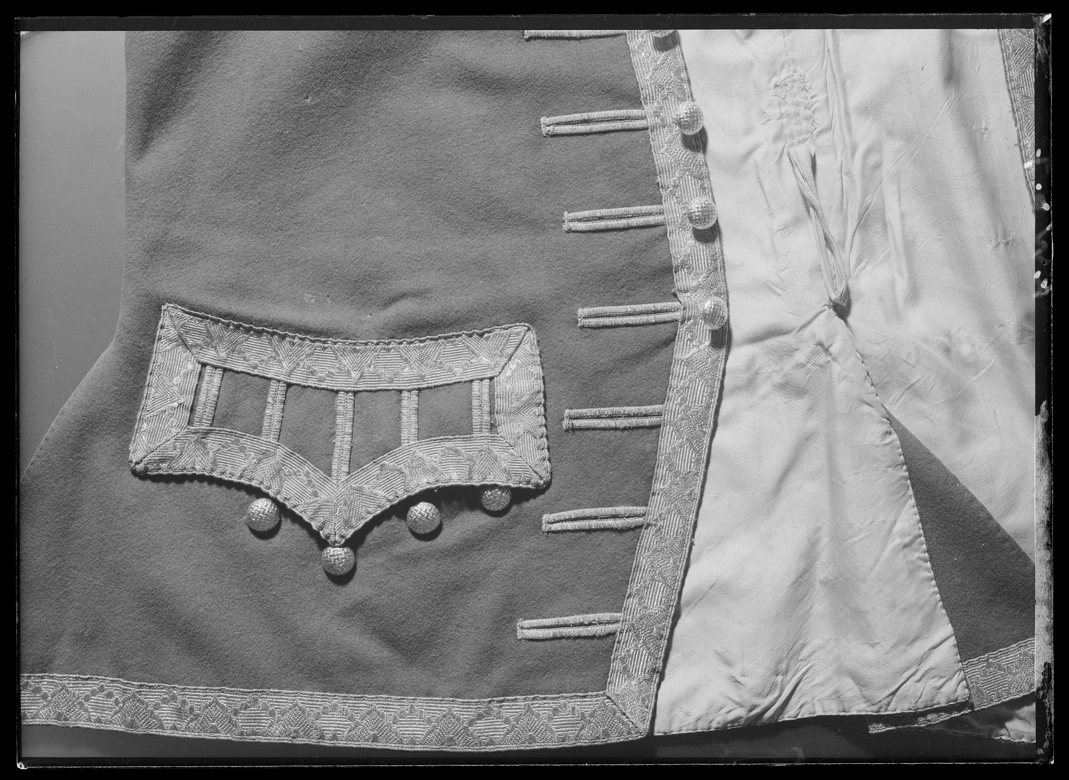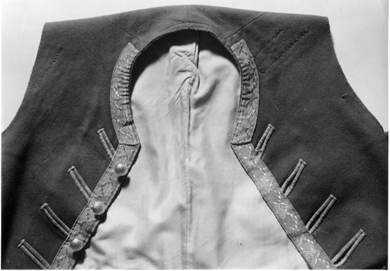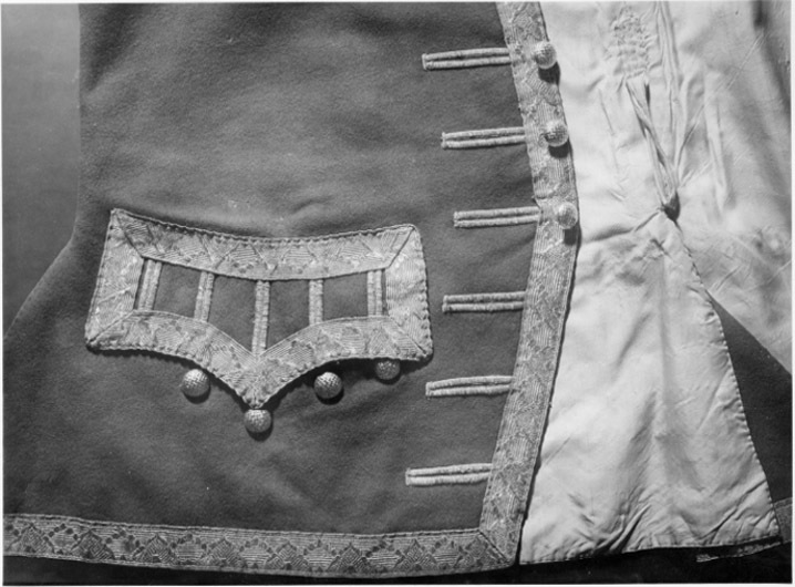 Väst till Gustav III:s franska jaktdräkt använd vid den första hovjakten i Versailles 1771-05-15.