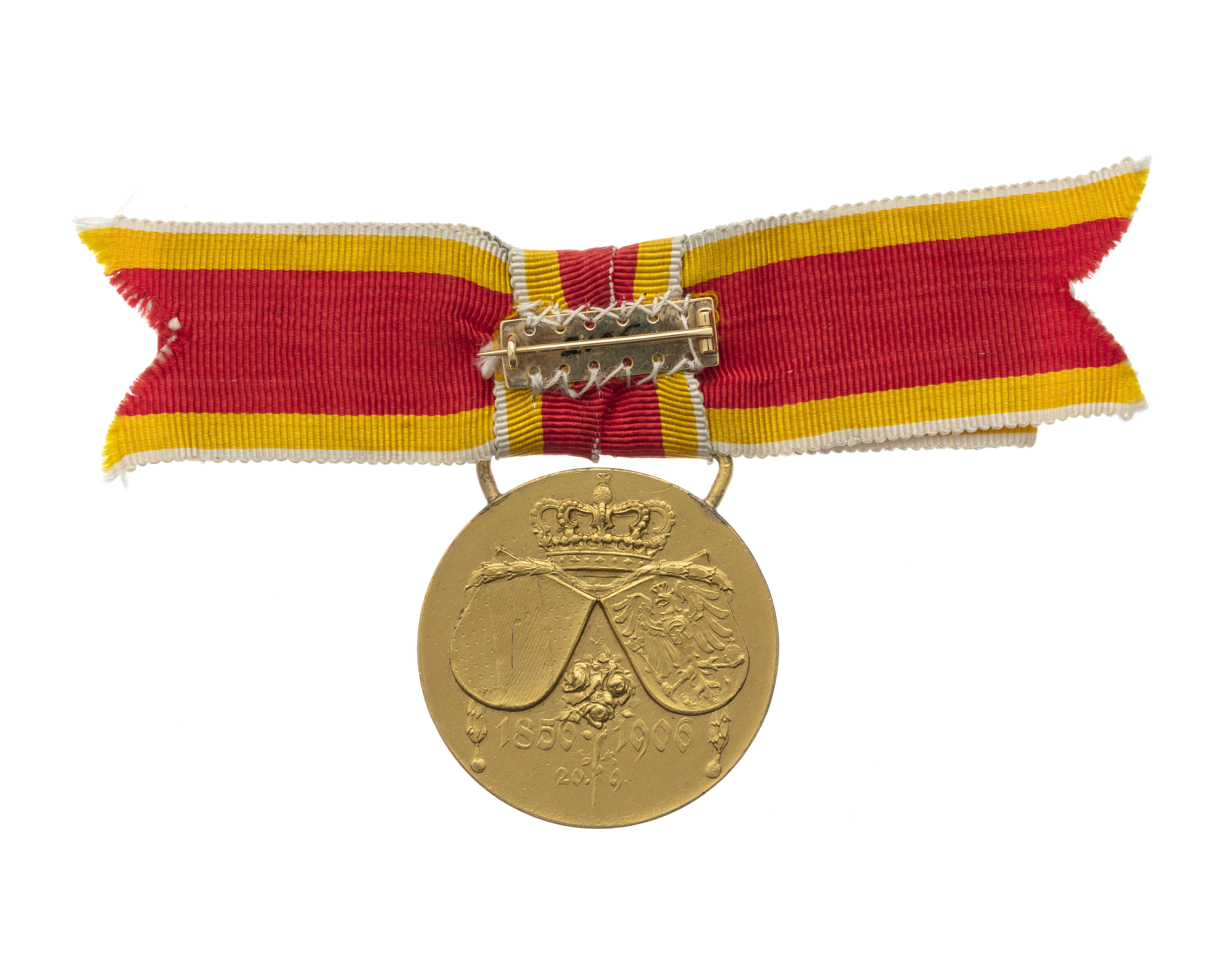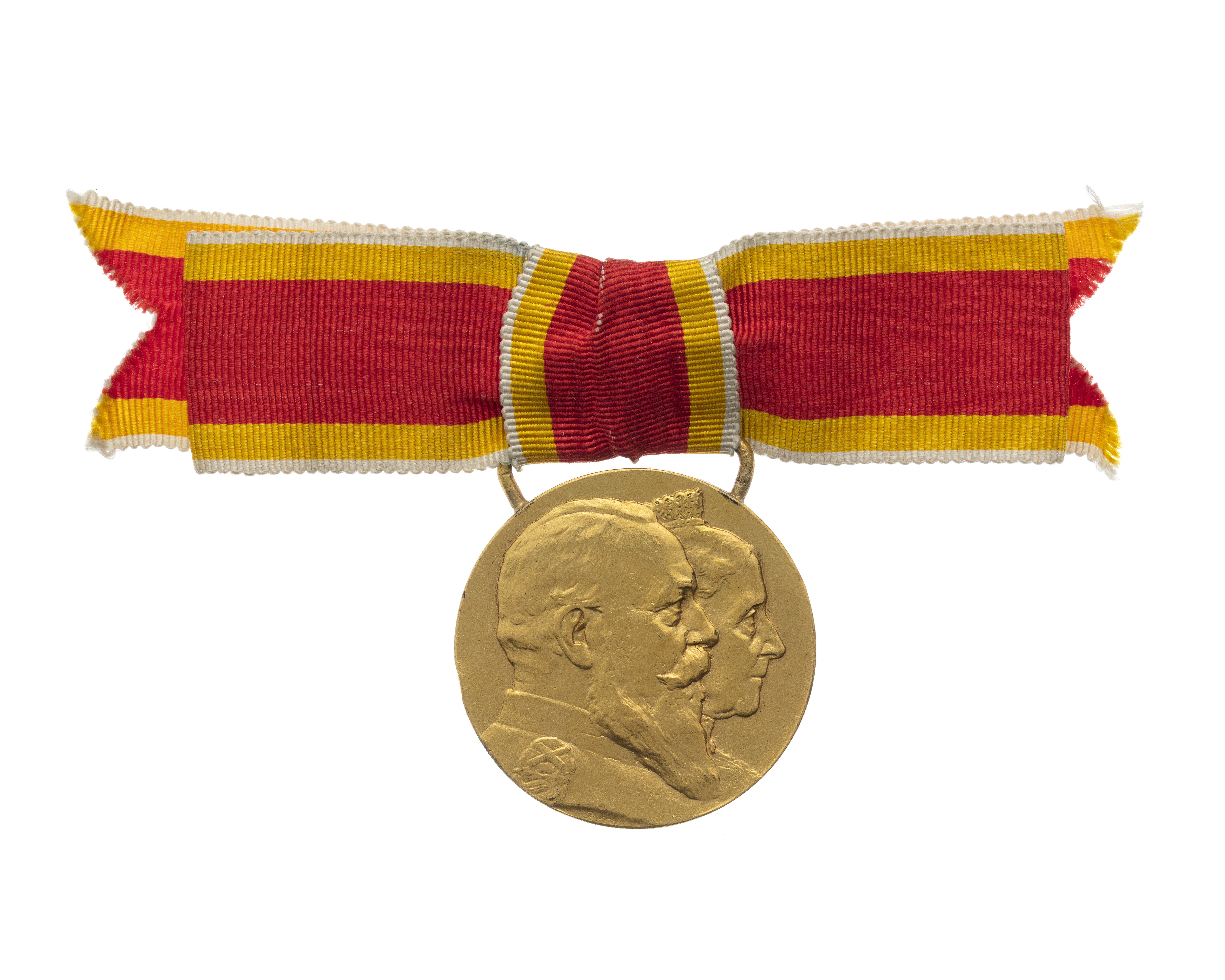 Rosett av rött sidenmoaréband med 4 mm breda gula kantränder och 1 mm breda vita kanter. På baksidan fastsytt säkerhetsnål med rektangulär platta.