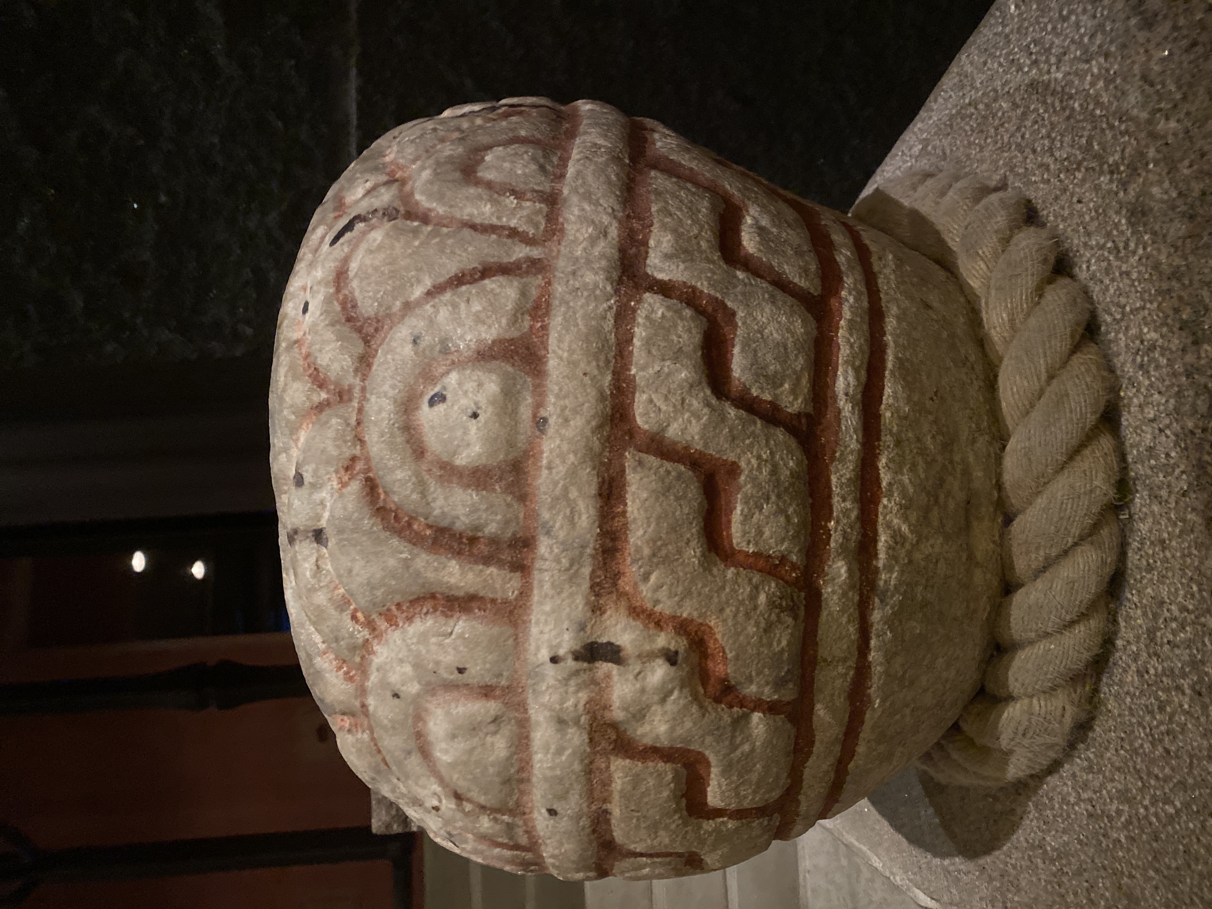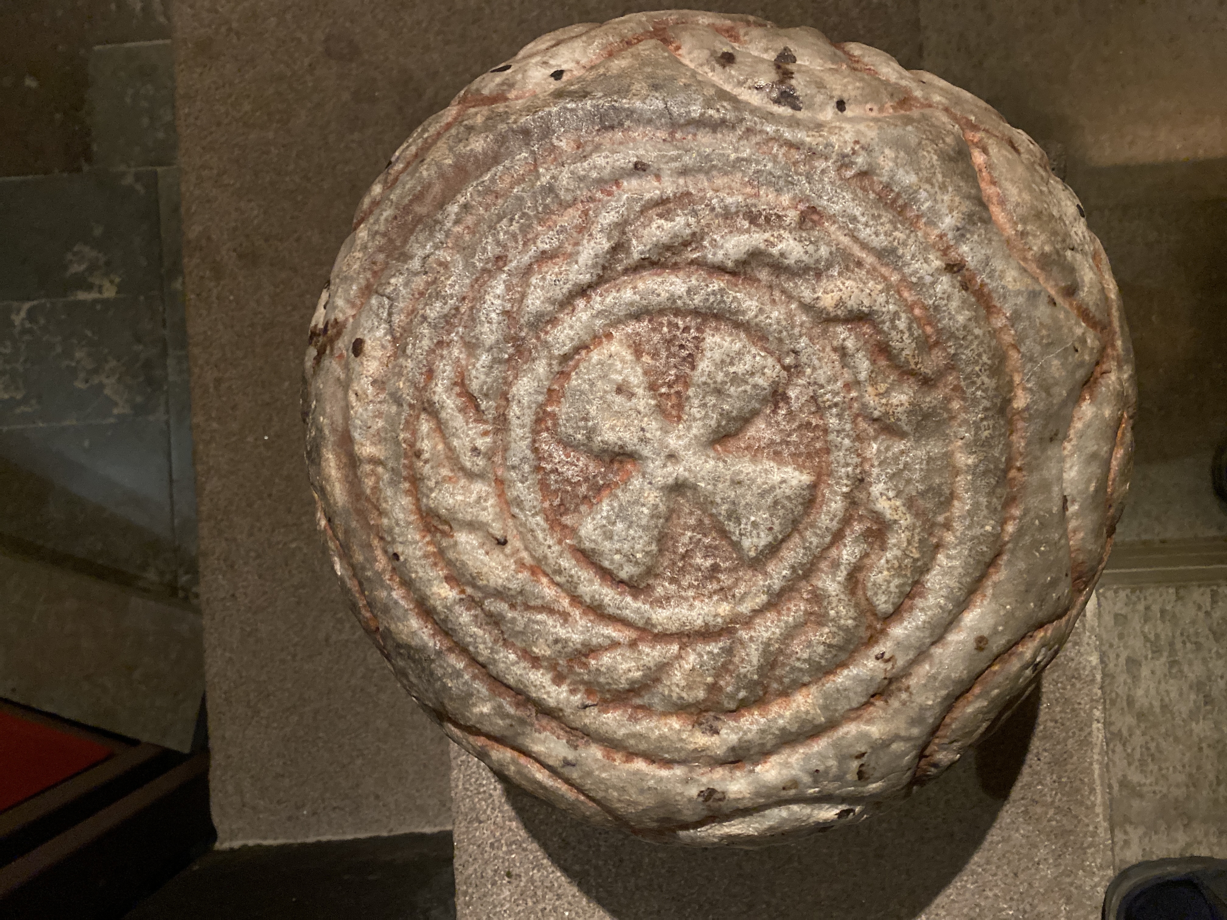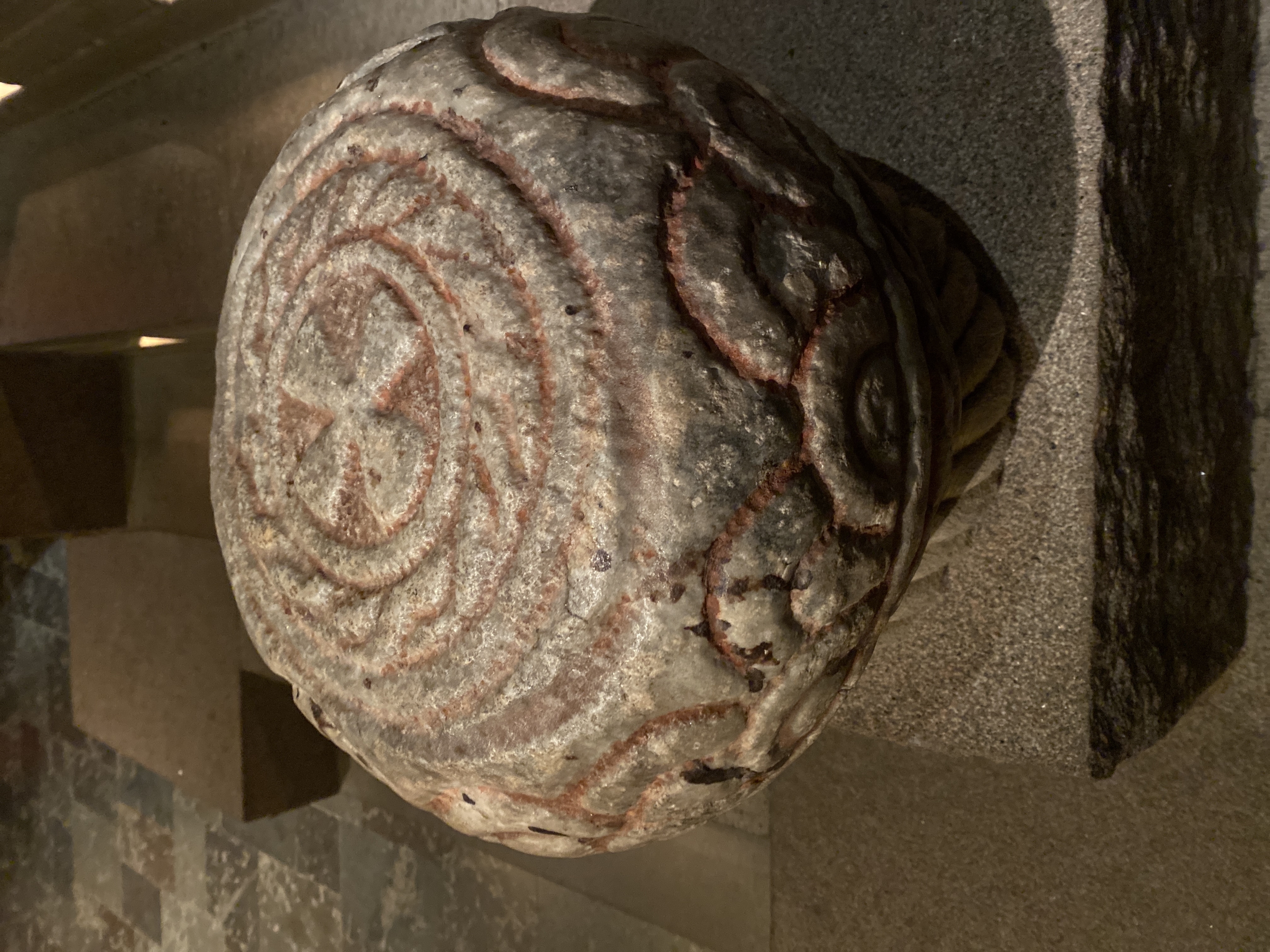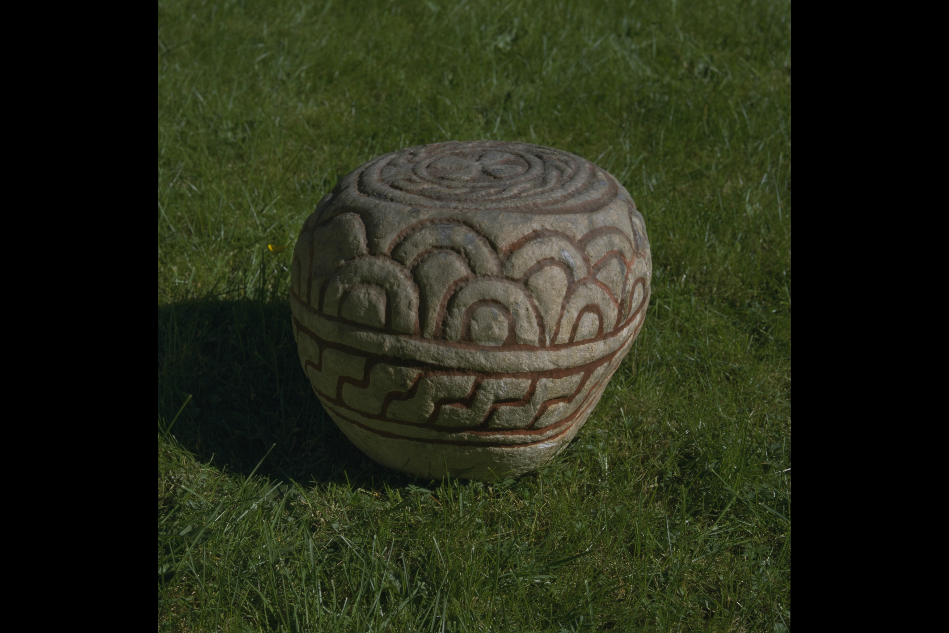 Troligt gravklot med dekor av repstavsband och fiskfjällsliknande bård på sidan. Upptill likarmat kors med repstavsbård
