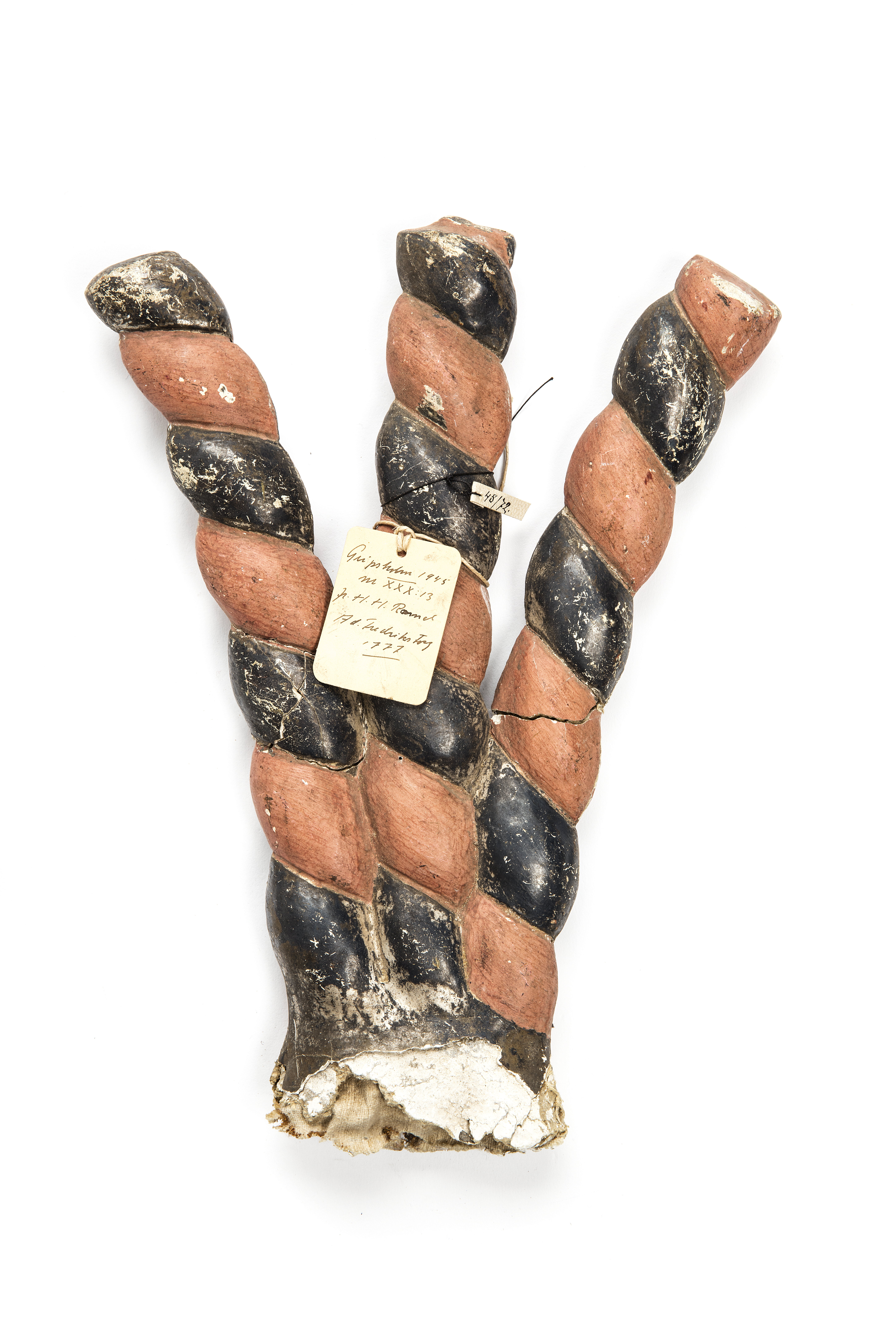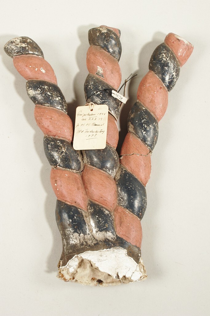 Av papier maché, bestående av tre upprättstående flätor i silver och rött, (jfr. tornérprogram).