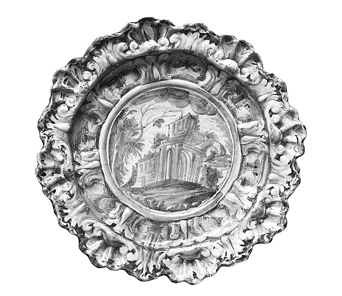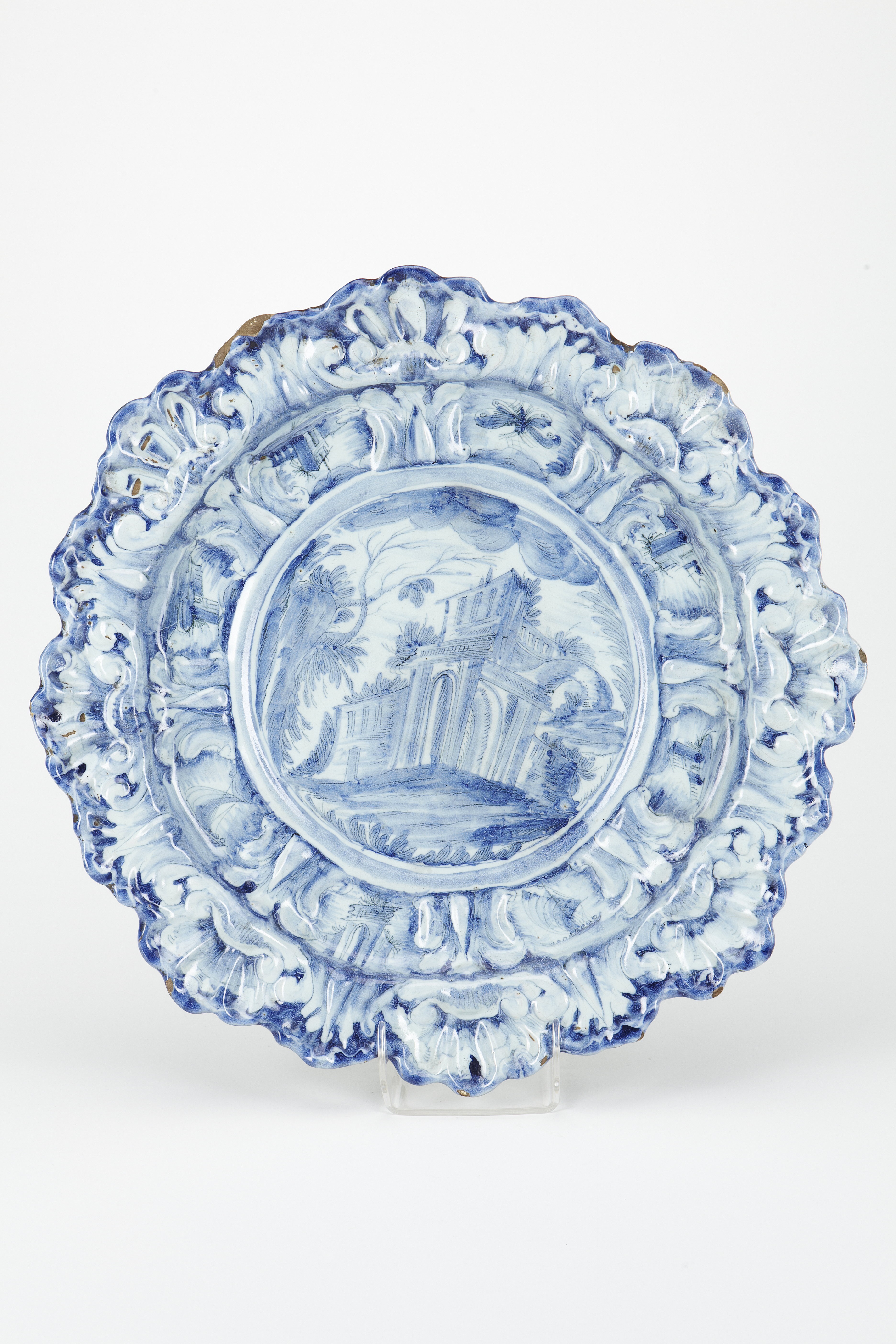 TILLÄGG: Stort praktfullt fat bemålat i blå monokrom med bräm som formats i snäckrelief. Mellan brämets formationer har fatets dekorerats med motiv av berg, moln, insekter, ruiner, båtar och bladverk. Motiv som typiska för "tapezzeria" repertoiren i Savona. En mönsterrepertoir delvis inspirerad av kinesiskt porslin, framförallt gällande växtelement och klippformationer. Profilerad kep och fatets spegel är dekorerat med ett landskap: ett antikt tempel som omges av träd. I förgrunden klippformationer. Fatets undersida är märkt med staden Savonas vapen. Brämens undersida är dekorerat med blomstermönster i blått. Detta fat kan knytas till gruppen "parata or pompa" som hade en dekorativ funktion vid festmiddagar och banketter. I en italiensk privatsamling finns ett fat med samma märkning och liknande dekoration på brämets fram- och undersida.