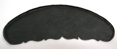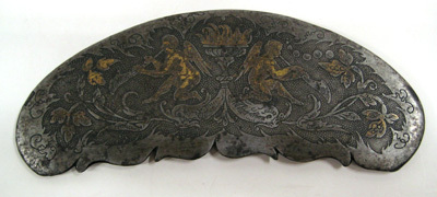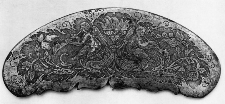 Beslag till sadelknapp. Sadeln sannolikt en av de fem köpta i Augsburg 1541 för Gustav Vasas räkning (29551). Drivet stål med etsad och förgylld dekor. Halvmånformig plåt, övre kanten rundad den nedre symmetriskt konturerad. Närmast heltäckande etsad dekor föreställande mot prickig bakgrund två från varandra vända änglar blåsandes i horn. Mellan dem urna med eld och under dem två delfiner ur vars munnar en blomranka skjuter ut. Änglar, eld och blomblad har rester av förgyllning. Plåtens baksida svartbrun.