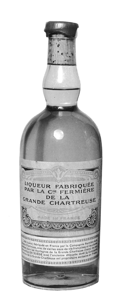 CHARTREUSE, C:IE Fermière de la Grande Chartreuse, två halvbuteljer Buteljer av färglöst glas. Nästan cylindriska, med kupigt indragen skuldra och spolformig hals, kring vars mynning en bandliknande utsvällning (s. k. stärkring); bottnen svagt skålig. Etiketter två, liggande rektangulära, den övre grågul, den nedre vit, på båda text i svart. Halsmynningen överdragen med brun hartsmassa. Höjd: 23,6 cm.; diameter: 7,5 cm. Anm: En av buteljerna med endast litet innehåll. Gåva till Wilhelmina von Hallwyl på julaftonen 1918, från hennes svärson förste kammarherren Carl Wilhelm Thure von Eckerman. Gåvan åtföljdes av ett poem, se N. d. 01.