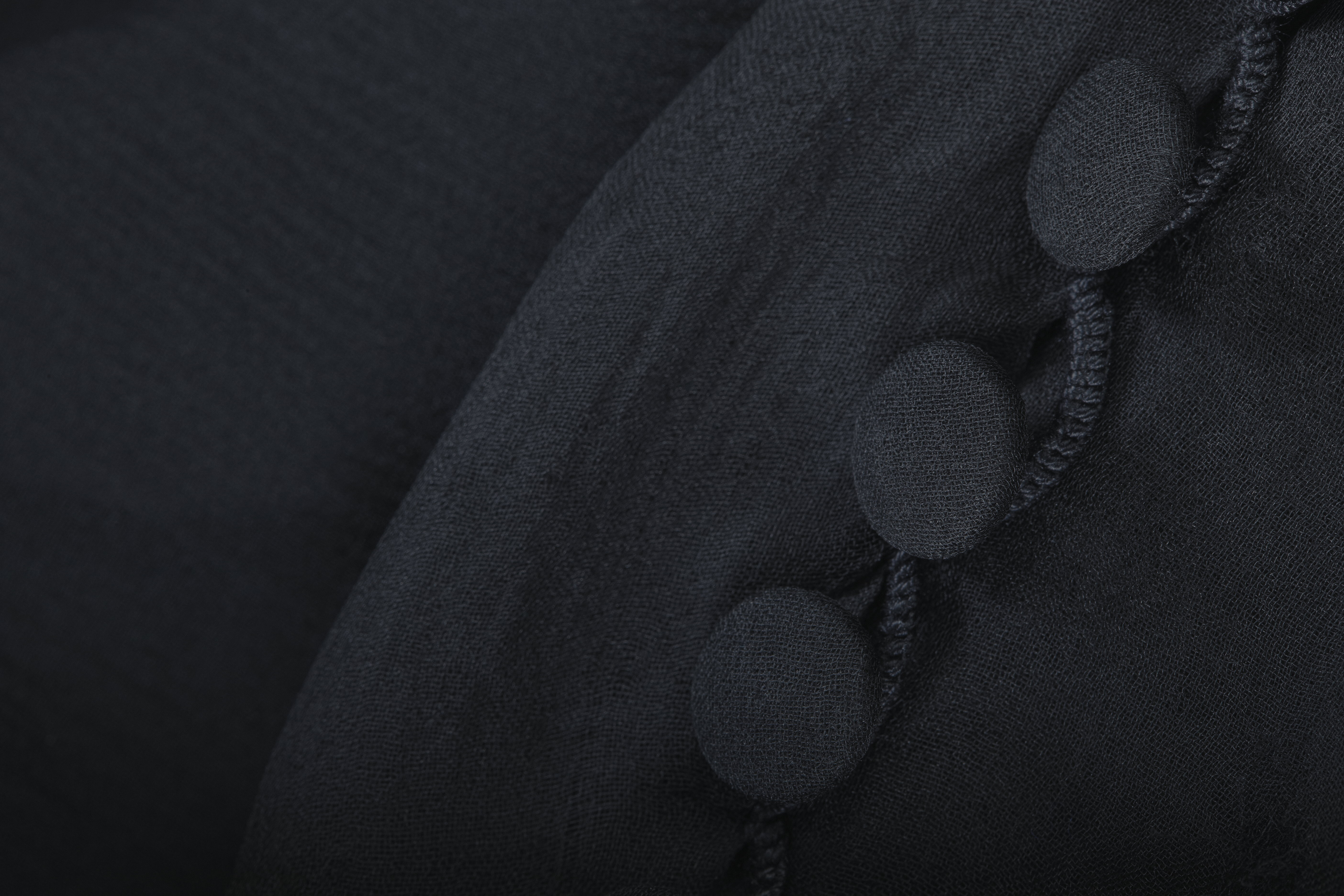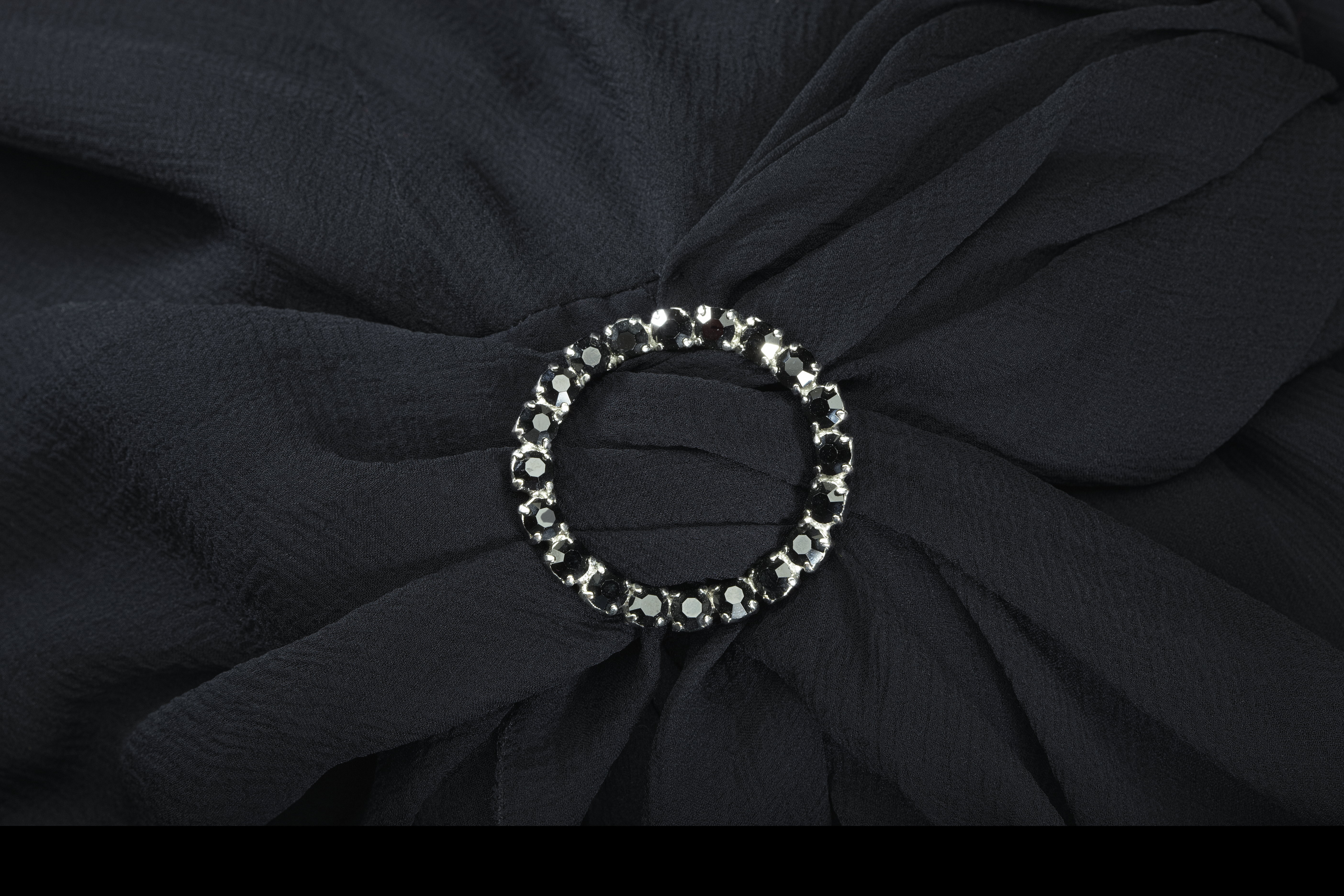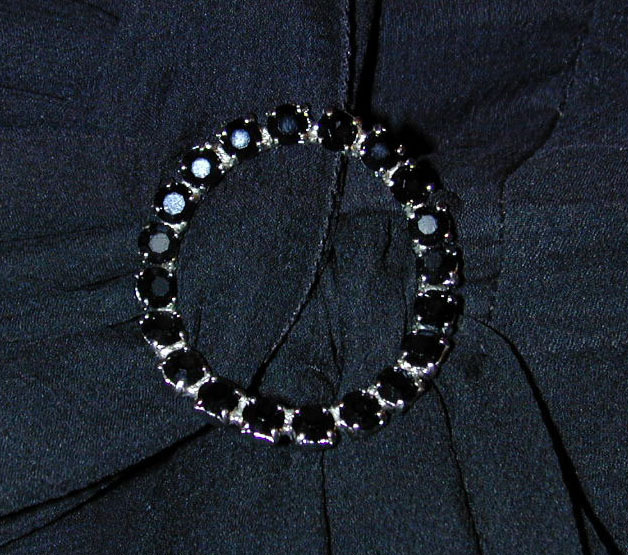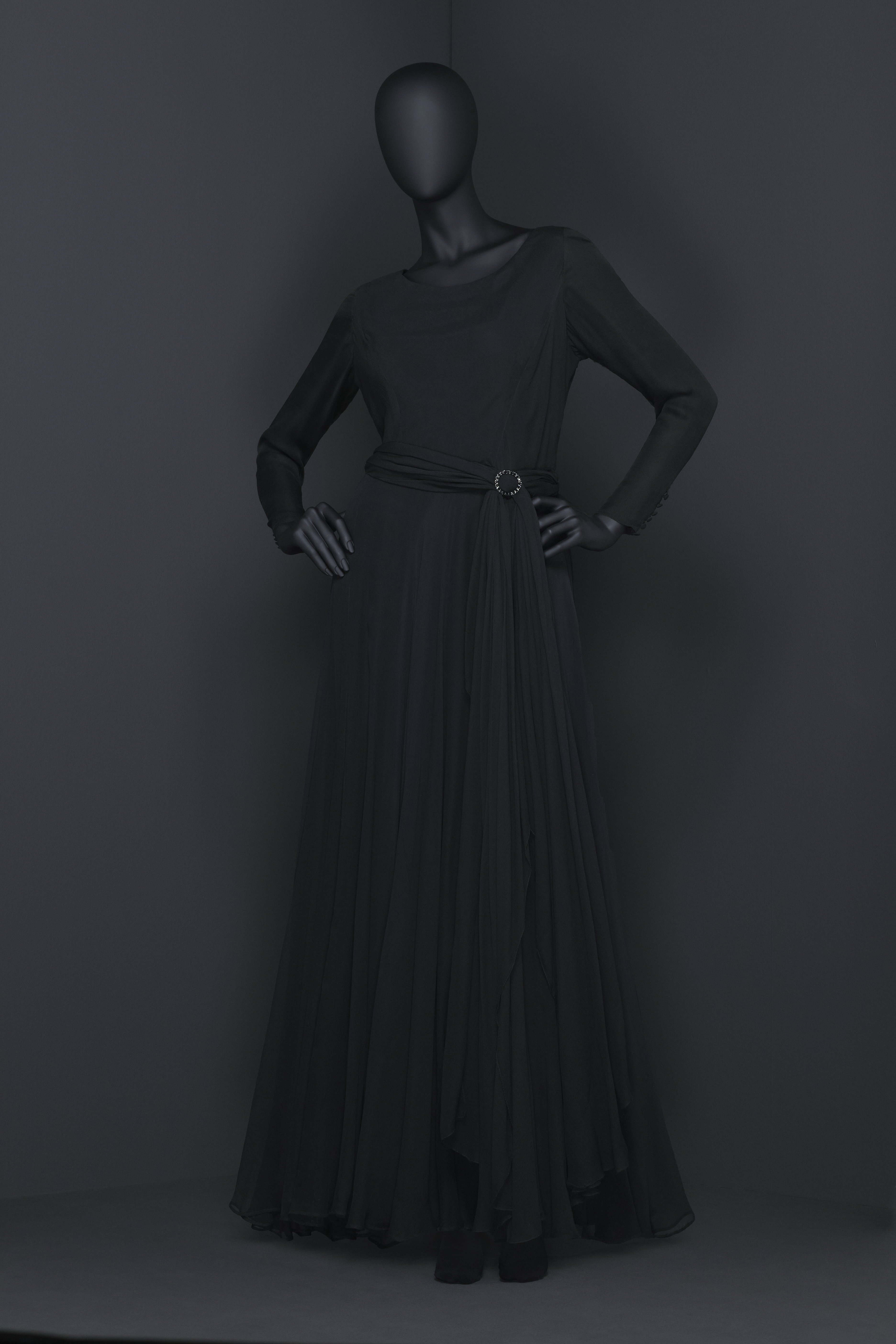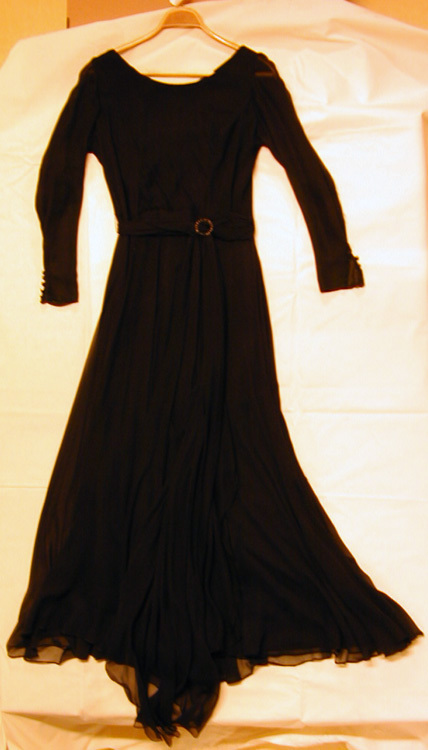 Skuren med livsöm. Båtringad. Hellång ärm. Bystsömmar från livsömmen till ärmsömmen. Vidringningen baktill fyra sprängveck. Blixtlås mitt bak i ryggen, längd 510 mm, märkt"GUSUM". Ärm med sprund och knäppning vid handleden. Knappar av klänningens tyg, d: 10 mm,vilka knäpps med öglor av svart silkessnodd. Runt livet band av veckad, svart organza, bredd 400 mm. Bandet fastsytt i midjans vänstrasida vid ett spänne. Bandet löper runt midjan på höger sida genom en trådhälla. Spännet,d: 36 mm, i vitmetall och slipade svarta gagatstenar. Kjol av sex våder,bredd 1850 mm. Ivänster sidsöm två kilar, längd 350 mm. Höger sidsöm utan kil. Mellanliggande sömmar fram och bak med vardera en kil. Fållbredd 3 mm. Innerkjol av svartsiden i fyra våder, längd 410 mm. Fållbredd 3 mm. Livet fodrat med ett tunt, svart siden.