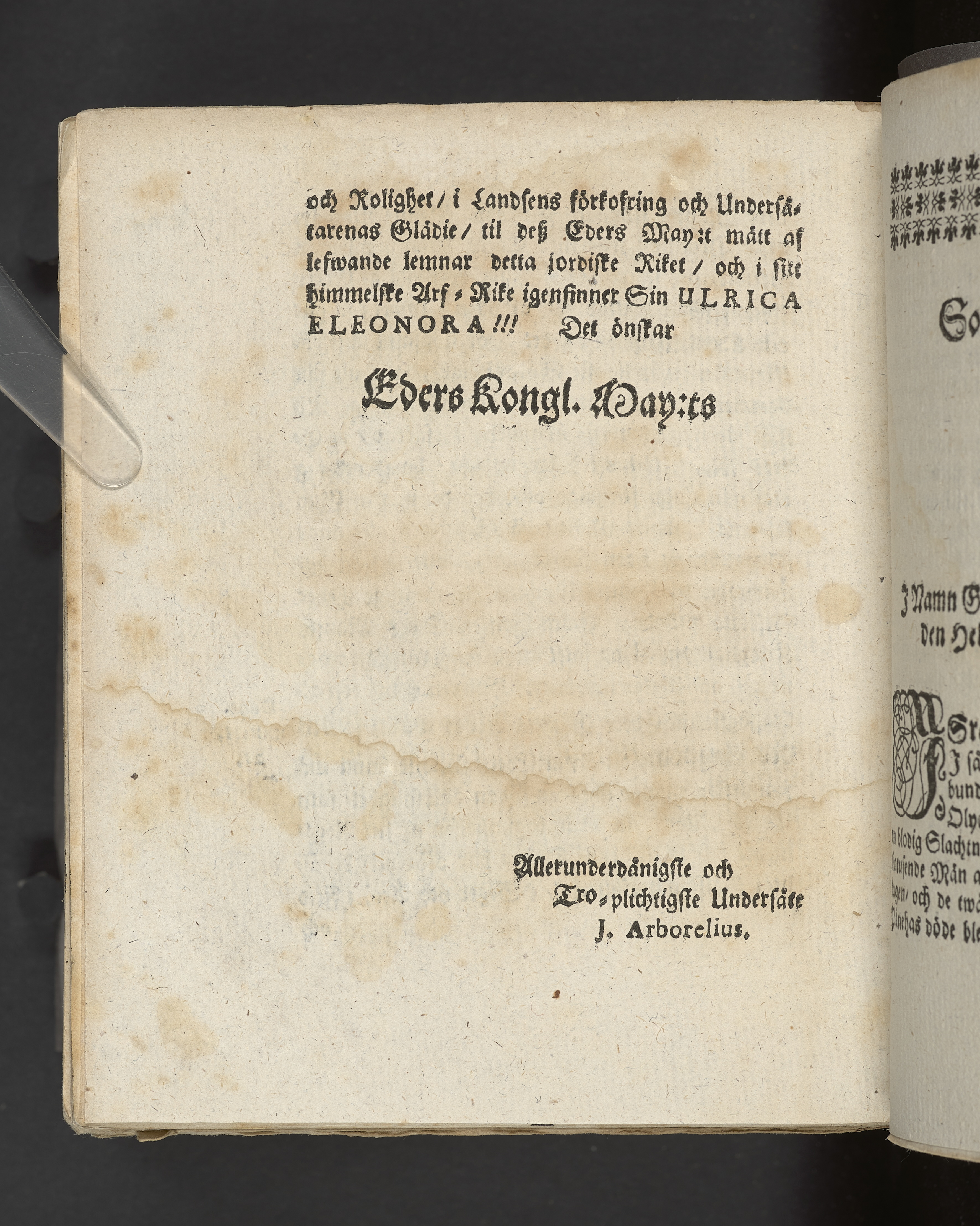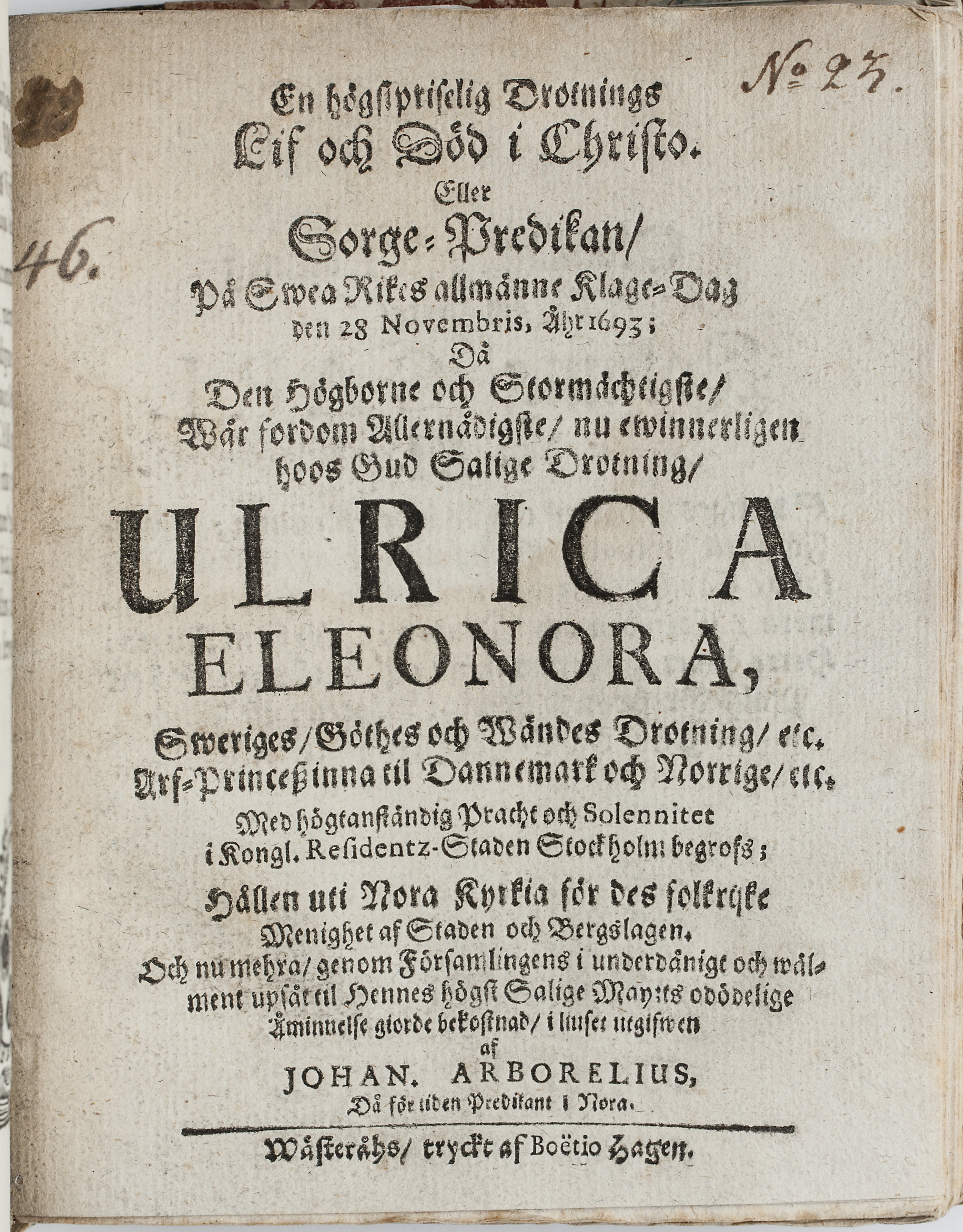 En högstpriselig drotnings lif och död i Christo. Eller sorge-predikan, på Swea rikes allmänne klage-dag den 28 novembris, åhr 1693; då ... Ulrica Eleonora, Sweriges, Göthes och Wändes drotning ... i kongl. residentz-staden Stockholm begrofs; hållen uti Nora kyrkia ... utgifwen af Johan. Arborelius ... Wästeråhs, tryckt af Boëtio Hagen.