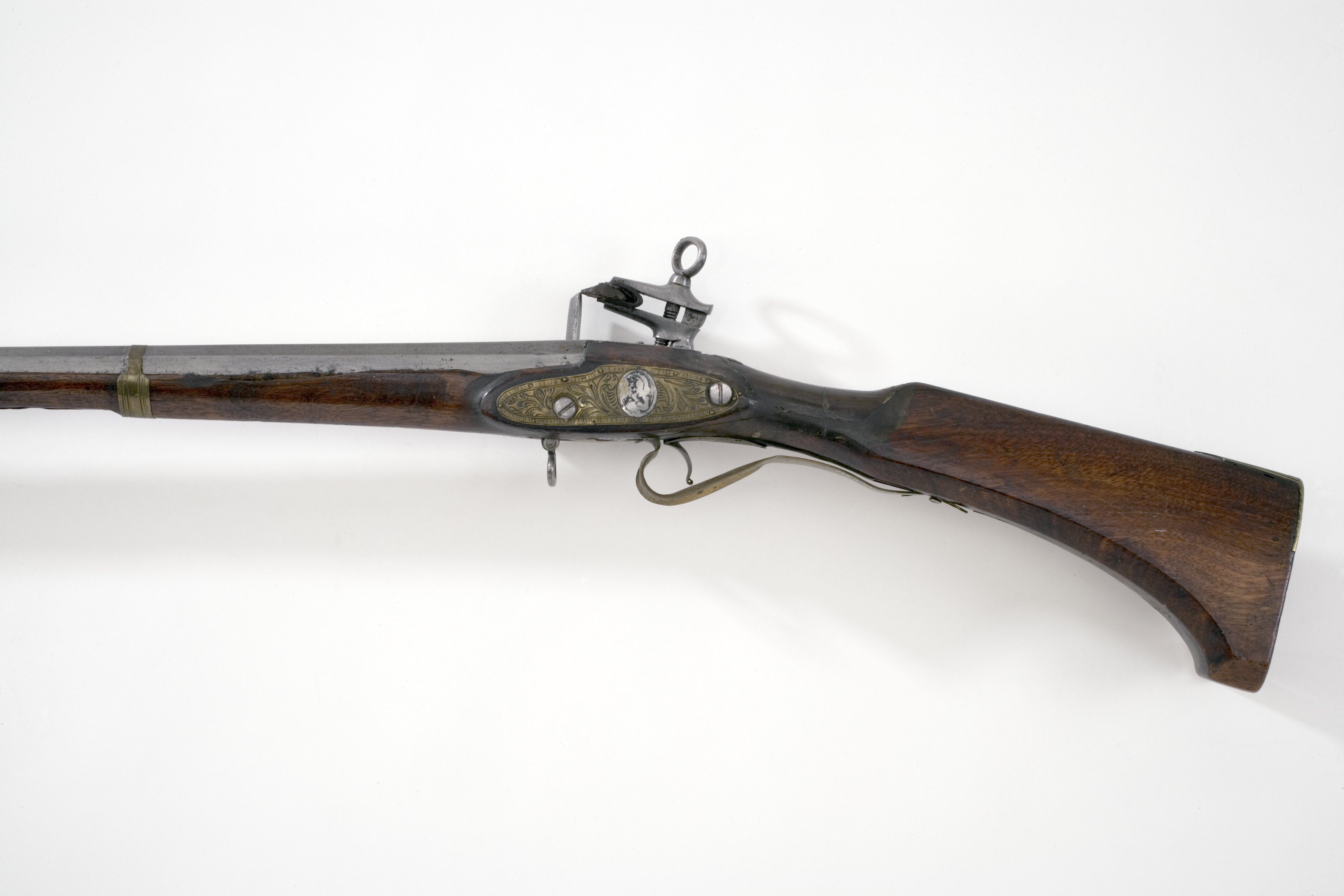 Rund, slätborrad pipa med kammare, kantig på ovansidan. Vid övergången en ring med punsad dekor. Svagt böjt svansskruvblad med rundad ände, delvis utplånad, punsad dekor. På pipans tre övre faser mässingsstämplar, på mittfasen en stämpel med öppen krona över "BVS // OMS" (S spegelvänt, LRK vägl.1921:318), därframför inslagen stämpeldekor i flykt med pipytan, tre pilliknande stämplar samt ett konsekrationskors, på sidofaserna två pilstämplar. Riktmedel: Korn av stål. Fästning: Pipan fäst med krysskruv underifrån samt tre pipband av mässing med linjedekor. Snapplås alla catalana, plant låsbleck. Hane med punsad dekor på käkarna, rektangulära, kraftiga käkar, käkskruv med ringformigt huvud. På hanstudeln punsad dekor i form av en naken, knästående, tjock människa. Rektangulär fängpanna med profilerad ytterkant. Vinkelrätt batteri med räfflad slagyta, välvd rygg-översida, på eldstålsryggen punsat ett löv samt signering: PIGRAV (AV ligatur). På skärmen framför batterifjädern punsad rankdekor. Utvändig slagfjäder som trycker på hanens häl. (Signeringen enl. 1921!). Fästning: Två låsskruvar. Böjd avtryckare med liten, upprullad ände. Ovalt avtryckarbleck. Helstock av mörkbrunt trä, kolv av katalansk typ med kantig undersida. Beslag av mässing, hälkappa med punsad dekor, bladformig flik på kolvänden, en skruv. Sidbleck med rankdekor, på mitten en oval av vitmetall (påslaget silver?) med till stor del utplånad dekor. Sid- och avtryckarblecken fästade med mässingsnubb. Varbygel med skålad bygel (skålningen utåtvänd). Kort främre arm med rombisk spets. Bakom varbygeln på kolvens undersida ett mässingsbleck i form av en orm, punsad dekor. Två rembyglar av stål, en framför varbygeln, en genom främre pipbandet.