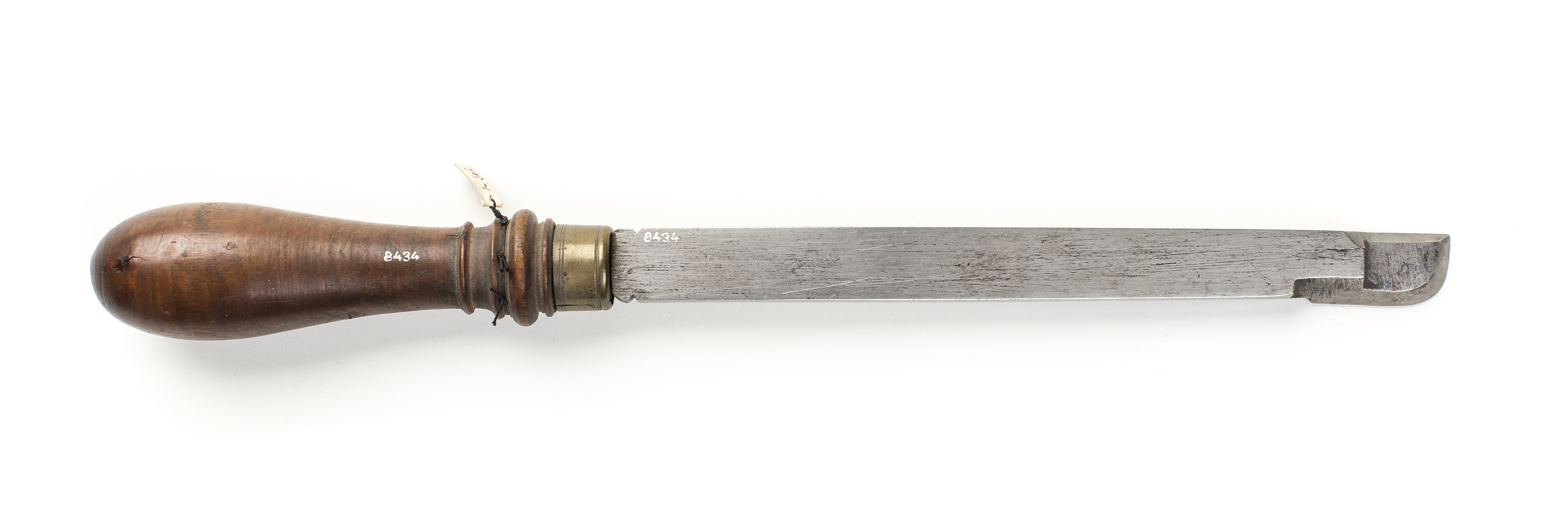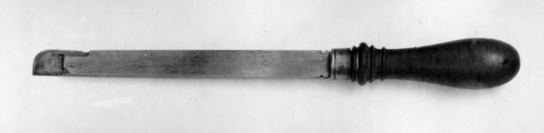 Profilstål med rak egg till höger. Framtill och till vänster raka eggar med rundat hörn emellan. Klinga med rektangulärt tvärsnitt, dekorerad med ett tvärstreck på sidorna vid skaftet. Svarvat, profilerat, kägelformigt skaft, dekorerat vid fästet med en större vulst, omgiven av två mindre vulster samt med en liten vulst kring skaftets smalaste del. Fästet skott med en mässingsring, dekorerad med fyra ringar. Mått: L 333, skaft L 128, största diam: 33,9, egg b: 18,2. Tureholm