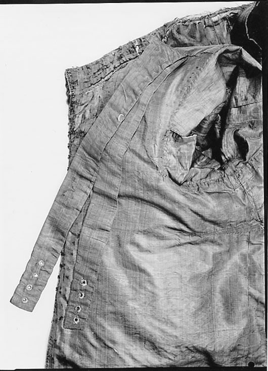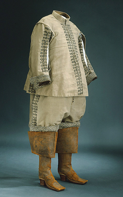 Dräkten består av jacka, byxor, strövlingar (kanoner) och skorosor. Materialet kallas i 1671 års inv. "grå Camlat hållandz", d.v.s. det är en brunaktig grå, eller olivfärgad yllerips eller kamlott. Dess vådbredd är ca 75,5 cm (utan stad med 17x9 á 10 tr/cm2). Varpen består av 2 otvinnade trådar som tvinnats samman åt höger. Inslaget består av 1 ljus och 1 mörk vänstertvinnad tråd av ylle. Staden är ej speciellt avgränsad, den består av 2 ljusare trådar i varpen. Jackan är skuren i endast 4 stycken, som sneddats ut i sidorna och sytts samman upptill. Dess höjd framtill, utan krage, är 68 cm, bak 74 cm. Jackans framkanter är i det allra närmaste raka, med obetydligt insvängt midjeparti. Utefter kanterna sitter på vänster sida 17 hyskor och på höger sida 16 hakar, den 5:e haken nedifrån är nämligen avbruten. Framtill, i sidorna och baktill har jackan ca 37 cm långa sprund. Sidsömmarna är endast hopsydda 11 cm. Ärmarna består av 2 svängda stycken, som dock försetts med kilar, så är t.ex. en 9 cm hög kil placerad omedelbart framför jackans sidsöm i underärmstycket, för att ge ärmen tillräcklig vidd. Jackans ståndkrage, som är försedd med styvnad, är 5 cm hög fram och 3,5 cm hög bak och knäppes med 4 knappar (varav den översta ej är ursprunglig) till motsvarande antal tränsar. De 3 originalknapparna i kragen är 1,2 cm i diameter (och sydda med ett nätverk av 4 och 4 svarta silkestrådar med vänstertvinnad silverlan samt 4 och 4 ljusa grå silkestrådar med högertvinnad guldlan. På toppen sitter liksom en liten tofs av grått och svart silke). Tränsarna på kragens vänstra sida är 4,3-4,6 cm långa och gjorda som en trind fläta med vita åt höger silverlansomspunna och gula åt höger guldlansomspunna trådar. Man har sytt samman jackan på följande sätt. Bakstyckenas axelsömmar har lagts ovanpå framstyckenas, höger ryggstycke har lagts över det vänstra mitt i ryggen. Vid ärmarnas bakre söm har överärmstycket lagts ovanpå underärmstycket. De främre ärmsömmarna, som ursprungligen varit öppna har vid något tillfälle sytts ihop, men år 1955 sprättades tråckelstygnen här bort. Runt ärmhålen går en smal passpoal (3 mm bred) av tyget. Jackan är fodrad med gråbrun moiré (50x22 tr/cm2) med ca 65 cm vådbredd (utan stad). Varpen har varannan tråd brun, varannan tråd grå. Inslaget är brunt. Alla trådar är av otvinnat silke. Stad: 0,85 cm (8 gula, 8 rosa, 8 gula, 8 rosa, 8 gula och 1 tjockare grå tråd). I tygets mitt syns vecket efter moirébehandlingen. För att ge större elasticitet åt plagget har moiréfodret försetts med horisontella kilar i rygg- och framstyckena ca 8 cm nedanför ärmhålet. Jackan har även mellanfoder av lärft (ca 20x20 tr/cm2). Mitt i axelsömmen, 5,5 cm från kragsömmen, sitter moiréklädda hängslen. Deras längd är 48 cm framåt och 50 resp. 51 bakåt. De är försedda med 4 tränsade hål nertill i varje ände. Moirétyget är lagt kring ett relativt styvt underlag och därpå nersytt med förstygn. Jackan har stora likheter med jackan till dräkt nr 3419 och har liksom denna vertikala garneringar. Båda är längs bägge framkanterna, utefter sid- och ryggsprunden samt längs ärmarnas sömmar på framsidan från axeln och 39 cm ned försedda med 6 cm breda (2,5 cm höga) snörmakerier. Dessa består av 2 större och 2 mindre knypplade rundlar med inträdda silverlan i ytterkanten på de större och i mitten spiraler av guld- och silverten. I kanterna sitter små tofsar av grå ulltråd som sticker ut genom spiraler av svart silke tvinnat med silverlan. Ärmarna är dessutom på insidan nertill garnerade med en 5,5 cm bred knypplad guld- och silverspets med inslag av svart. Denna är egentligen sammankomponerad av smalare knypplade spetsar, som sytts samman med svart silke. Där botten är glesare har 3 och 3 parallella jämnlöpande lanomspunna trådar lagts såsom brider. Med litet mellanrum sitter små tofslika rundlar, d.v.s. en spiral av guldten och en tråd av svart silke tvinnat med metallen omsluta en liten tofs av svart silke och grått ullgarn. Spetsens rapport är7 cm. Analysresultat, spets av hopflätade trådar av förgyllt silver legerat med koppar,huvudbeståndsdelar: Silver xxx Guld xx Koppar xxx Zink x