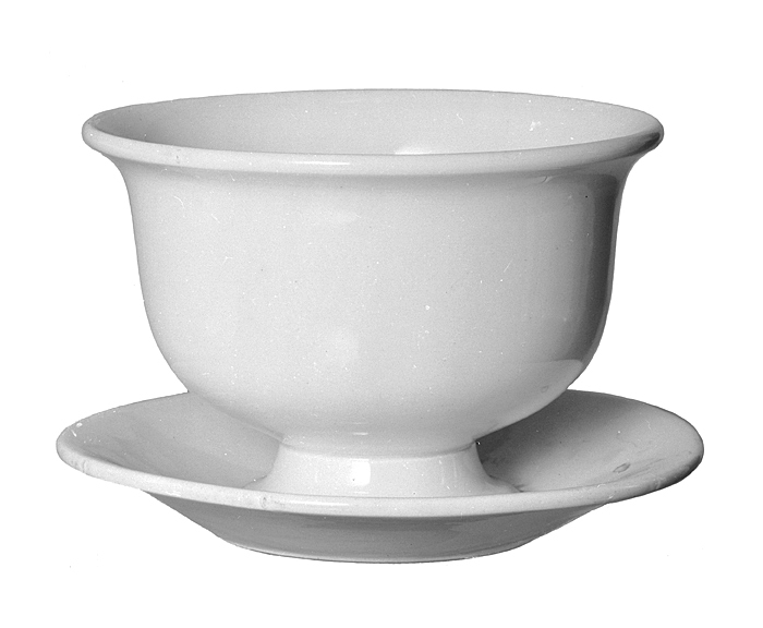 SÅSSKÅLAR, två stycken, med fastsittande fat av porslin. Omvänt klockformiga, på insvängd låg hals; fat med utsvängd bräddkant och djupt insänkt botten samt på låg fotkant. Mått: H:10,6; D: 14,9 och 15,2 cm. Fat: D: 16,7 och 17 cm.