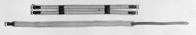 Sadelgjord i två delar av ljus halvgrov väv. Bukgjord i grövre ljus väv med fyra läderfästa metallspännen. En röd och två blå ränder längs hela. Övergjord i grövre ljus väv med läderfäst metallspänne och läderrem. En röd och två blå ränder längs hela.