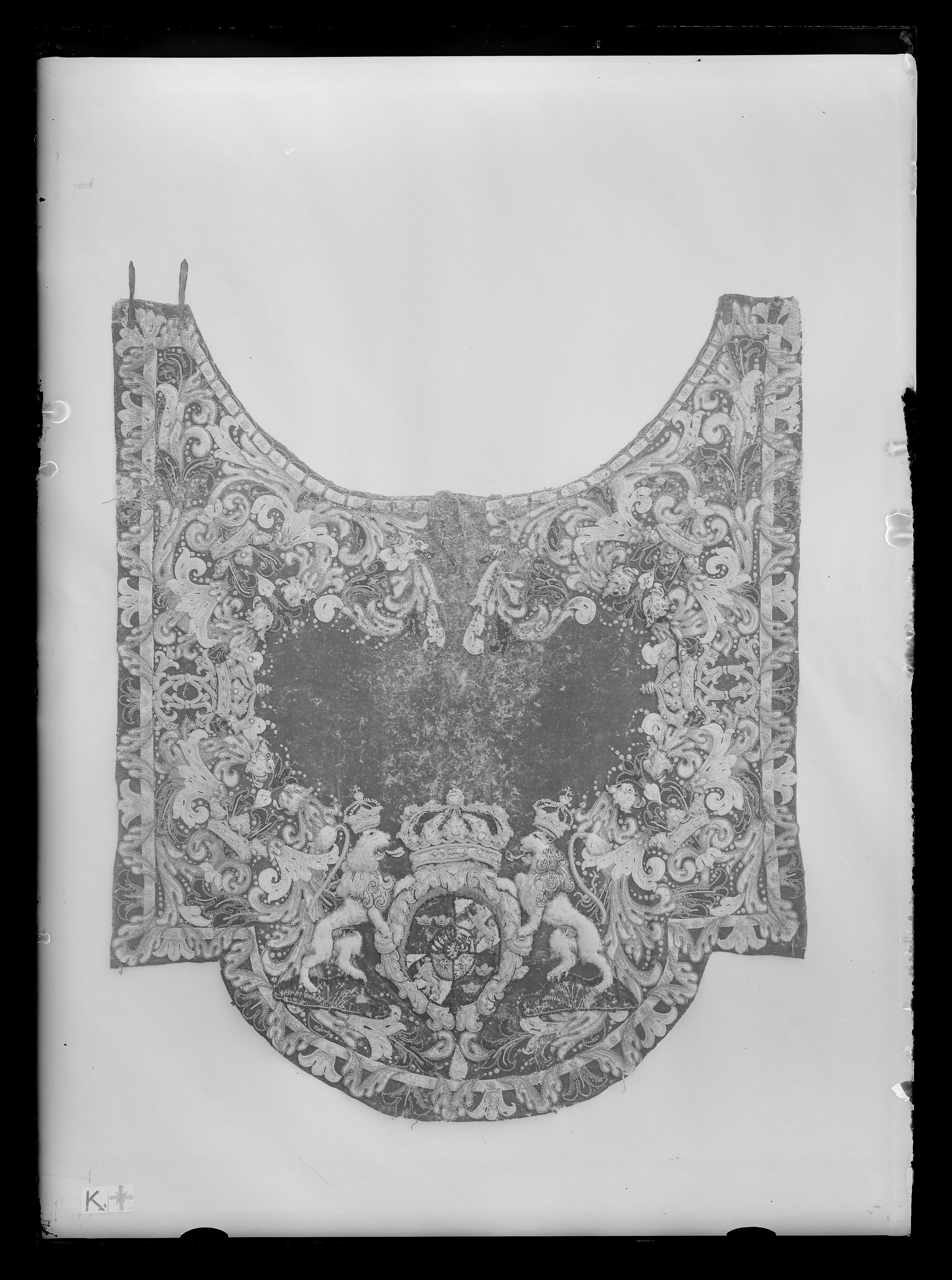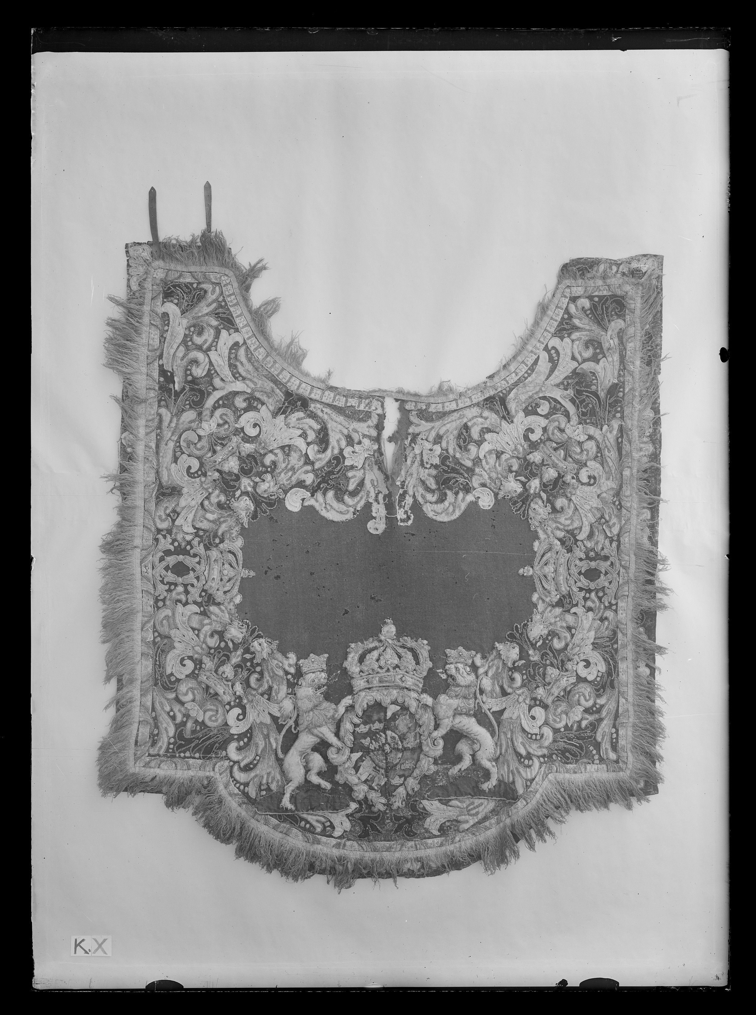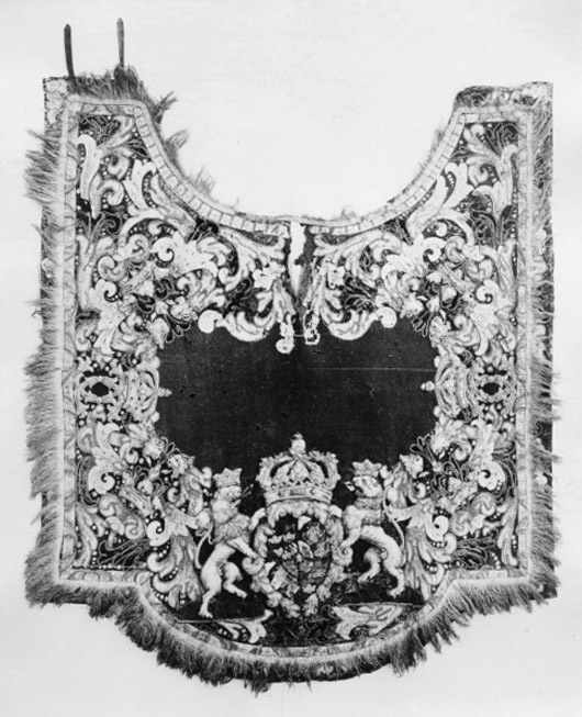 Täcke av blått kläde med applikationer av kläde i flera färger, huvudsakligen gult ochvitt. Samma typ som nr 4061 men skiljer sig från detta i följande avseenden: Bredd framtill: 1505 mm. Riksvapnets mått: 750x530 mm. De sköldhållande lejonen står på smågrästuvor av grönt kläde med obetydliga märken efter ullgarnsbroderier. De små gula lejoneni vapenskölden är sydda av ullgarn i schattersöm. Vänstra framstycket har två remmar avbrunt läder, 230x22 mm, placerade 80 mm innanför framkanten. Högra framstycket har tvåbruna lädertränsar, 40x26 mm, med spännen av vitmetall, 28x20 mm. Tränsarna sitter 70 mminnanför framkanten. På baksidan sitter fem tränsar, liksom på nr 4061. Märkt "G.12." med svart tusch 85 mmnedanför inskärningen. Två hällor av brunt läder, 230x35 mm, placerade ungefär i täcketsmitt, ca 540 mm från respektive långsida. Två svansremmar av brunt läder, den ena fastsyddi fodret ca 270 mm ovanför bakre fliken och är 320x8 mm. Den översta sitter fastknuten ifodret 310 mm ovanför den nedre och är 500x8 mm. Den nedre remmen har från början varitlängre.