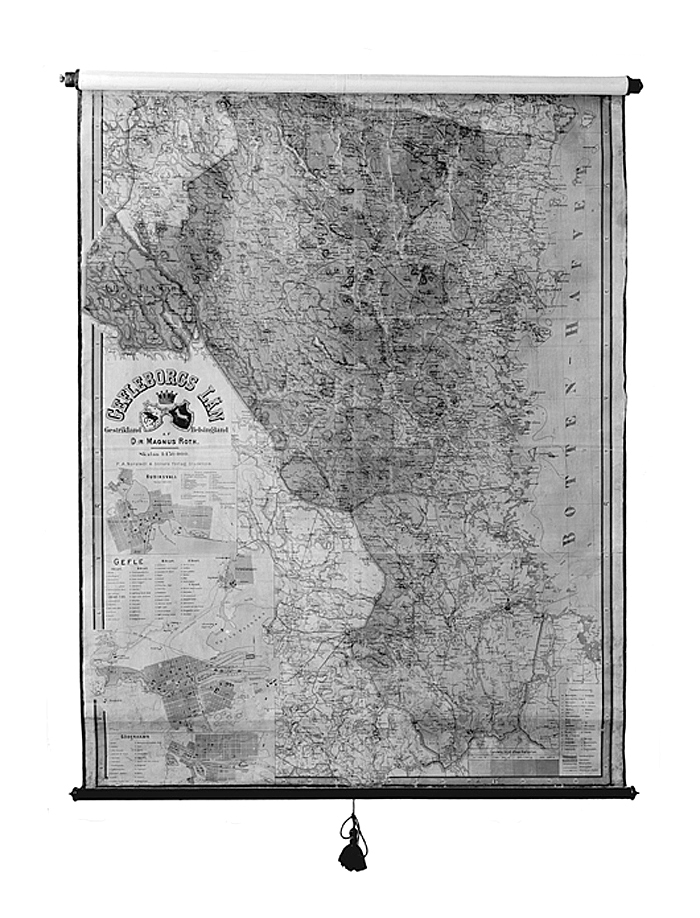 Karta över Gävleborgs län (Gästrikland, Hälsingland). På ljust brungult papper, uppfodrad på vit bomullsväv samt fernissad. I litografiskt färgtryck. Länet i mörkt gult med namn i svart, tingslagsgränser med respektive namn i rött samt sjöar och vattendrag i ljust grönblått. Kartan upptagande städer, köpingar, byar, kyrkor m. m. Längst till höger Bottenhavet; i övre vänstra hörnet och upptill i ljust en del av Jämtland. I nedre vänstra hörnet planer över städerna Hudiksvall, Gävle och Söderhamn jämte numrerade förklaringar; däröver GÄVLEBORGS LÄN i båge samt därunder Gästriklands och Hälsinglands vapen i lutande konturerade sköldar under hertiglig krona; till vänster därom: Gästrikland, till höger: Hälsingland; nedanför vapen "Af D:r MAGNUS ROTH. Skalan 1:150000. P. A. Norstedt & Söners Förlag, Stockholm. Graverad och tryckt vid Gen. Stab.Lit. Anst." I nedre högra hörnet i stående rektangulärt fält teckenförklaring samt till vänster därom färgvalörtabell på landets höjd över havsytan. Ovanför kartan en tillskarvad del av ljusbrunt papper, uppfodrad på bomullsväv som den förut nämnda . Montering: Upptill en mekanisk rulle av trä, i vars ena ända en platt tapp, i den andra en rund; ändan med den platta tappen skodd med en mässingsholk; nedtill en rundstavig träkäpp med profilerade ändknappar, svartbetsad och polerad, i mitten ett mörkgrönt yllesnöre med stor tofs Tillhört inventarierna på Wilh. H. Kempes kontor, inrymt i Schinkelska huset, dåvarande adress Kornhamnstorg 2 (f. d. Lilla Nygatan 29, nuvarande Kornhamnstorg 4), Stockholm, 1843 - 1883; därefter på firman Wilh. H. Kempes (innehavare Walther von Hallwyl och Johanna Kempe, f. Wallis) kontor, Blasieholmstorg II, 1884 - 30 September 1896 och Hamngatan 4, I Oktober 1896 - 1909; sedermera på Walther von Hallwyls privata kontor 1909 - 1921 samt slutligen på Wilhelmina von Hallwyls f. Kempe, kontor där från sistnämnda år t. o. m. 1930.