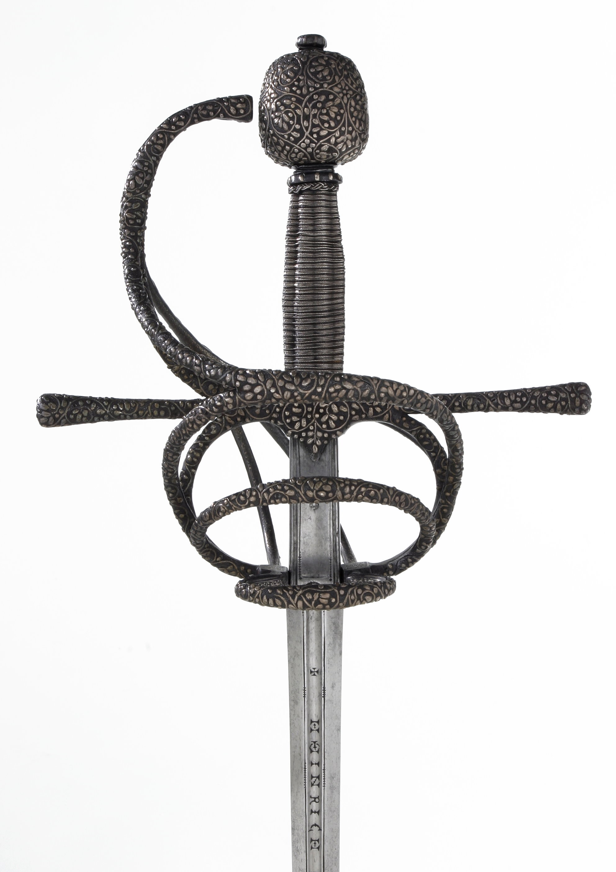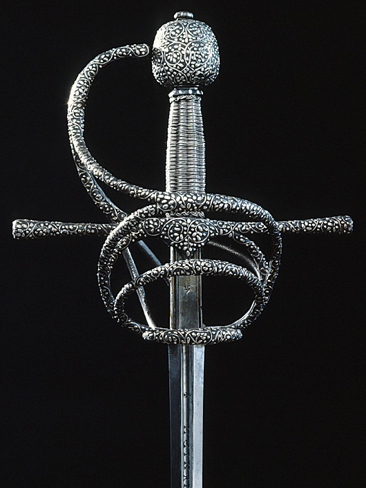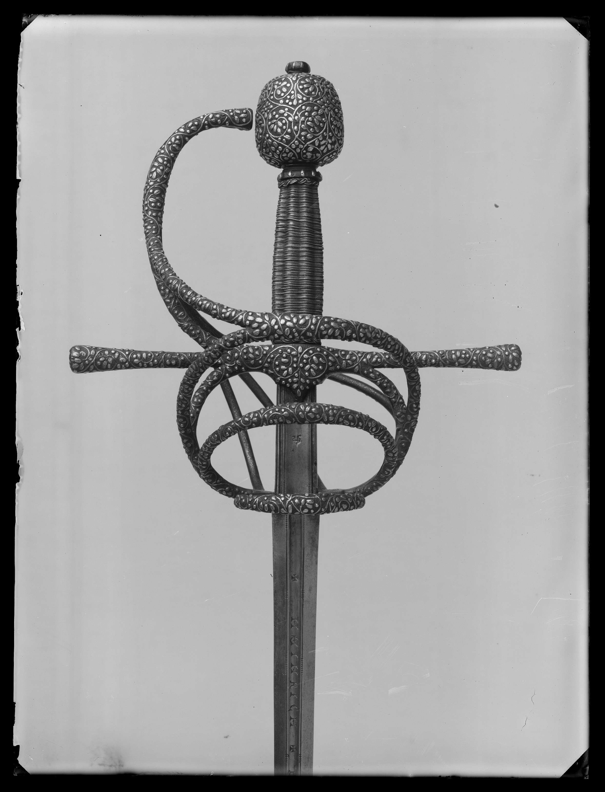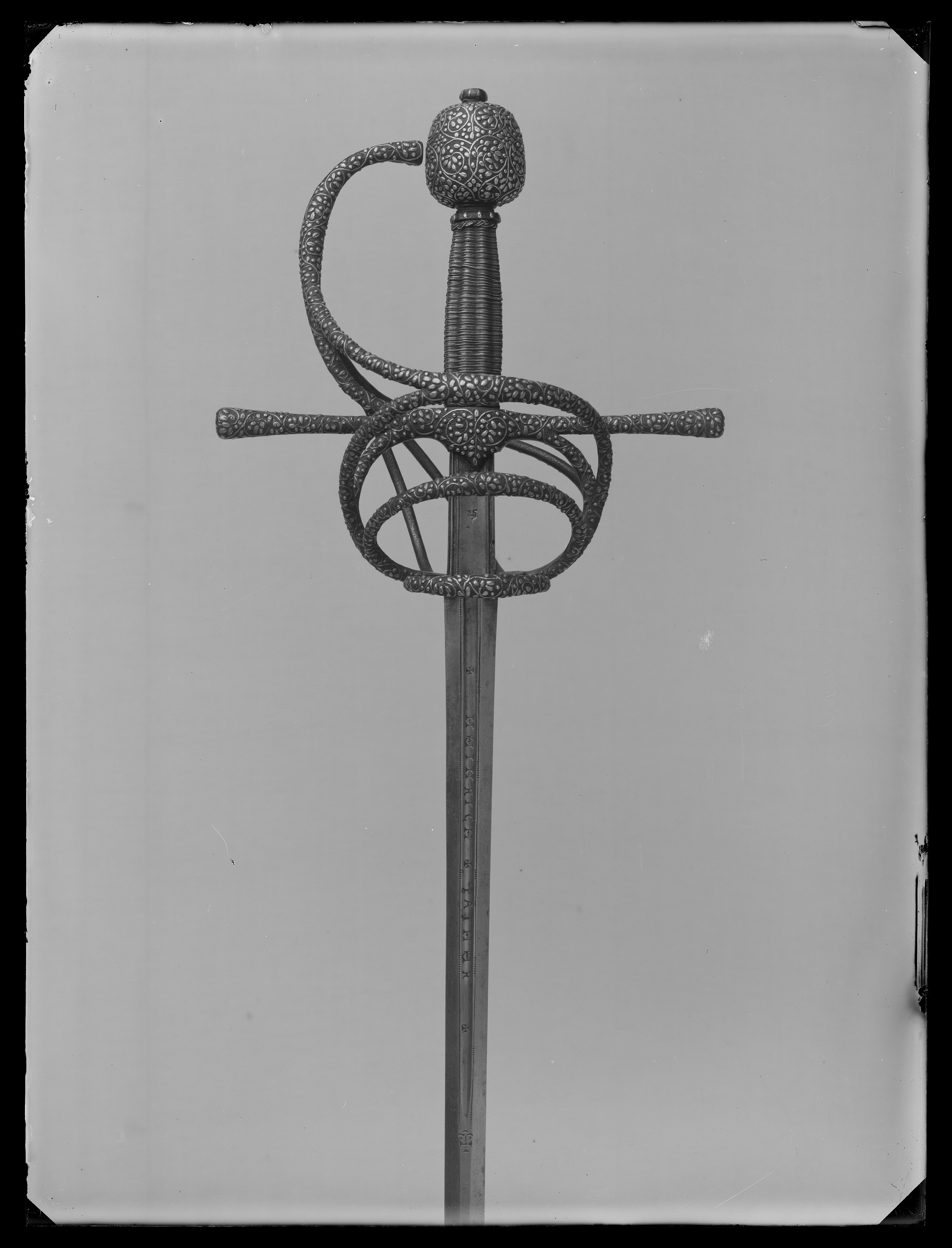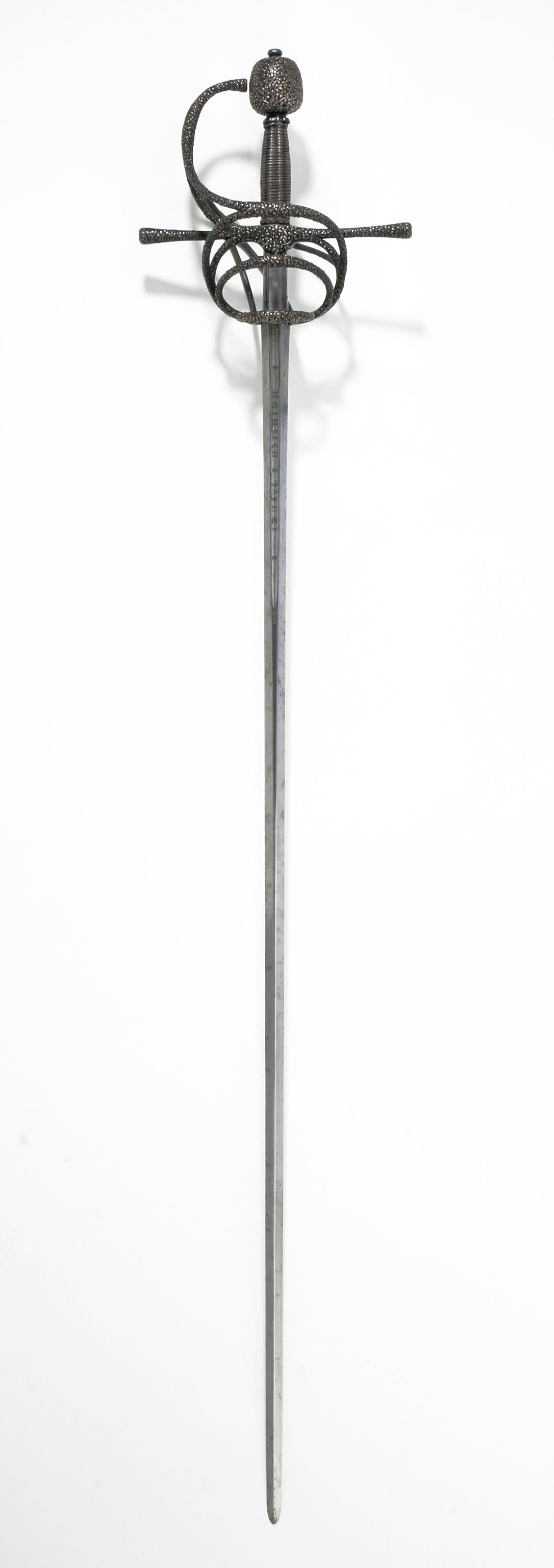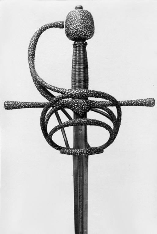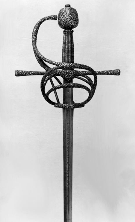 Bygelfäste av svärtat stål med yttäckande ornering av påslaget silver i form av täta, smala bladrankor, på de inre sidorna av båda sidobyglarna och utsidans byglar samt insidans spänger återkommer samma ornering, ehuru här i mindre kraftigt utförande. Knapp förhållandevis stor, nötformig med runt tvärsnitt. Samtliga byglar och spänger likaså med runt tvärsnitt. Handbygel bågformig, upptill nästan anslutande till knappen i en spets. Pareranordningen i övrigt bestående av: - på ut-och insidan en sidobygel, utgående något ovanför handbygelns mitt, den yttre övergående vid krysset i en från fingerbyglarnas nederdel uppåtsvängd bygel. - nedanför denna en mindre bygel av samma typ. - vid fingerbyglarnas nedre ändar en tvärställd, mindre bygel. - den inre sidobygeln förgrenar sig i höjd med parerstängerna i tre nedre sidospänger, de två främre på vardera sidan om klingan anslutande till fingerbyglarnas nederdel. Kavel med längsgående räfflor, lindad med tvinnad, mycket tunn silvertråd. Klinga rak, lång, sexsidigt slipad och med en 60 mm lång ricasso. Starka delen på båda sidor med en ca 230 mm lång hålkäl, vari punsat med antikvaversaler: "HEINRICH PATHER". På vardera sidan av ricasson smedsstämpel i form av en hästsko.