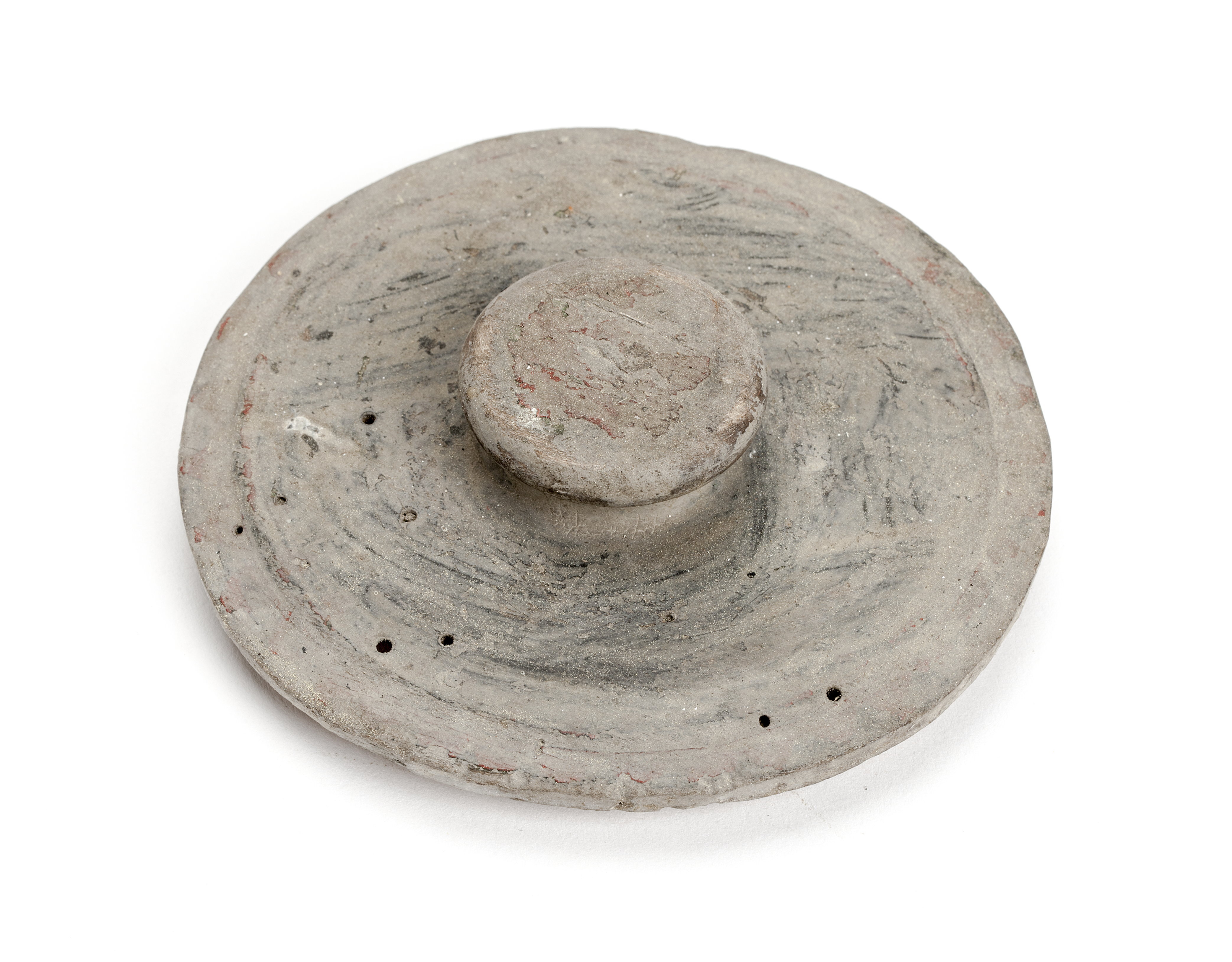 Gråmålat med underliggande röd och svart färg.