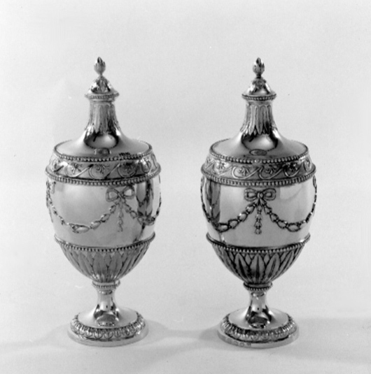 Urna av förgyllt silver med äggformig corpus, spetsen nedåt. Rund fot med bladstav runt kanten, starkt avsmalnande uppåt. På corpus nedre del en bred bladfris mellan pärlstavar. I mitten ett brett fält med 4 bandrosetter och bladfestoner emellan. Däröver en löpande hundfris med palmettspetsar mellan pärlstavar. Starkt avsmalnande bladprydd hals, Litet lock (H: 27 mm) med knopp, dekor i form av blad och pärlstav. På foten inristat "23 1/2" (avser lod) och 4 stämplar: 1) Smith och Sharps fyrpassformade stämpel med DS RS, 2) Londons krönta leopardhuvud, 3) Londons lejon, 4) årsbokstaven b.