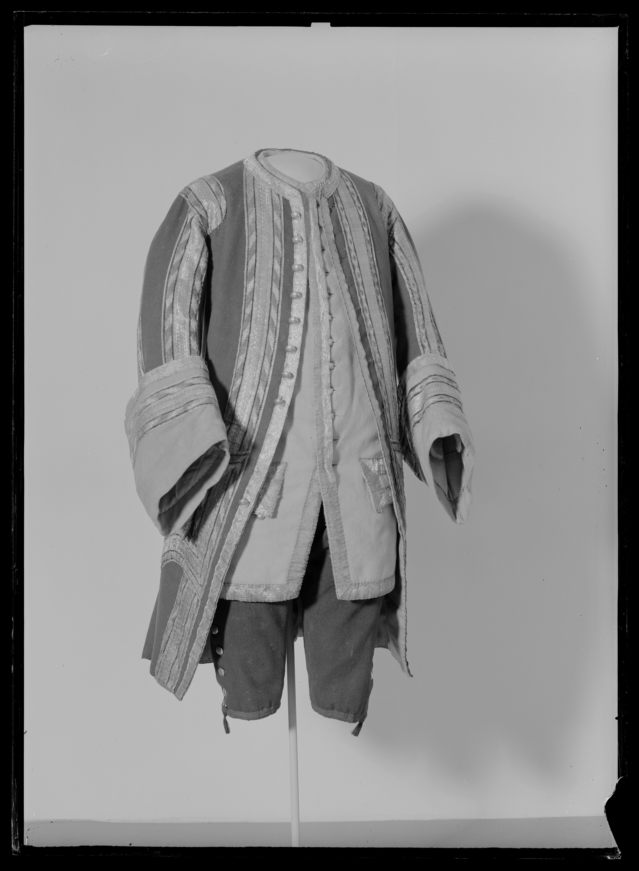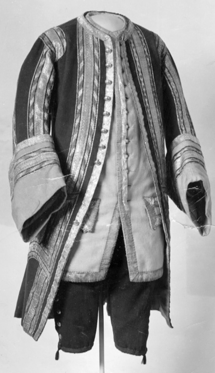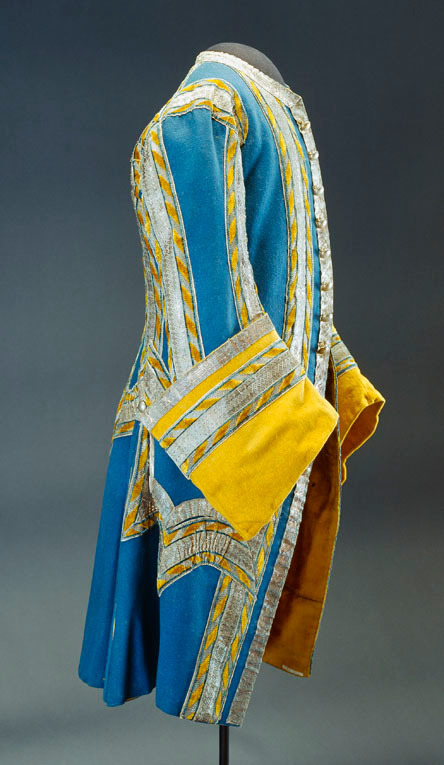 Livrock/Justaucorps av mellanblått kläde fodrad med gul rask. Ärmuppslag av gult kläde. Framstyckena med ficklock neddragna i spets. Ficköppningar saknas. Sprund mitt bak och veckade skört i sidorna. Samtliga sömmar, halsringning, framkant, ficklockens kanter och uppslagens övre kanter har fastsydda galoner. Galonerna är dels vävda silvergaloner och dels galoner med invävt mönster i blått och gult silke kombinerat med silver. Vänstra sidans galoner med invävda romber och den högra sidans galoner med sneda streck. Höger framkant med 9 st (ursprungligen sannolikt 12 st) försilvrade knappar