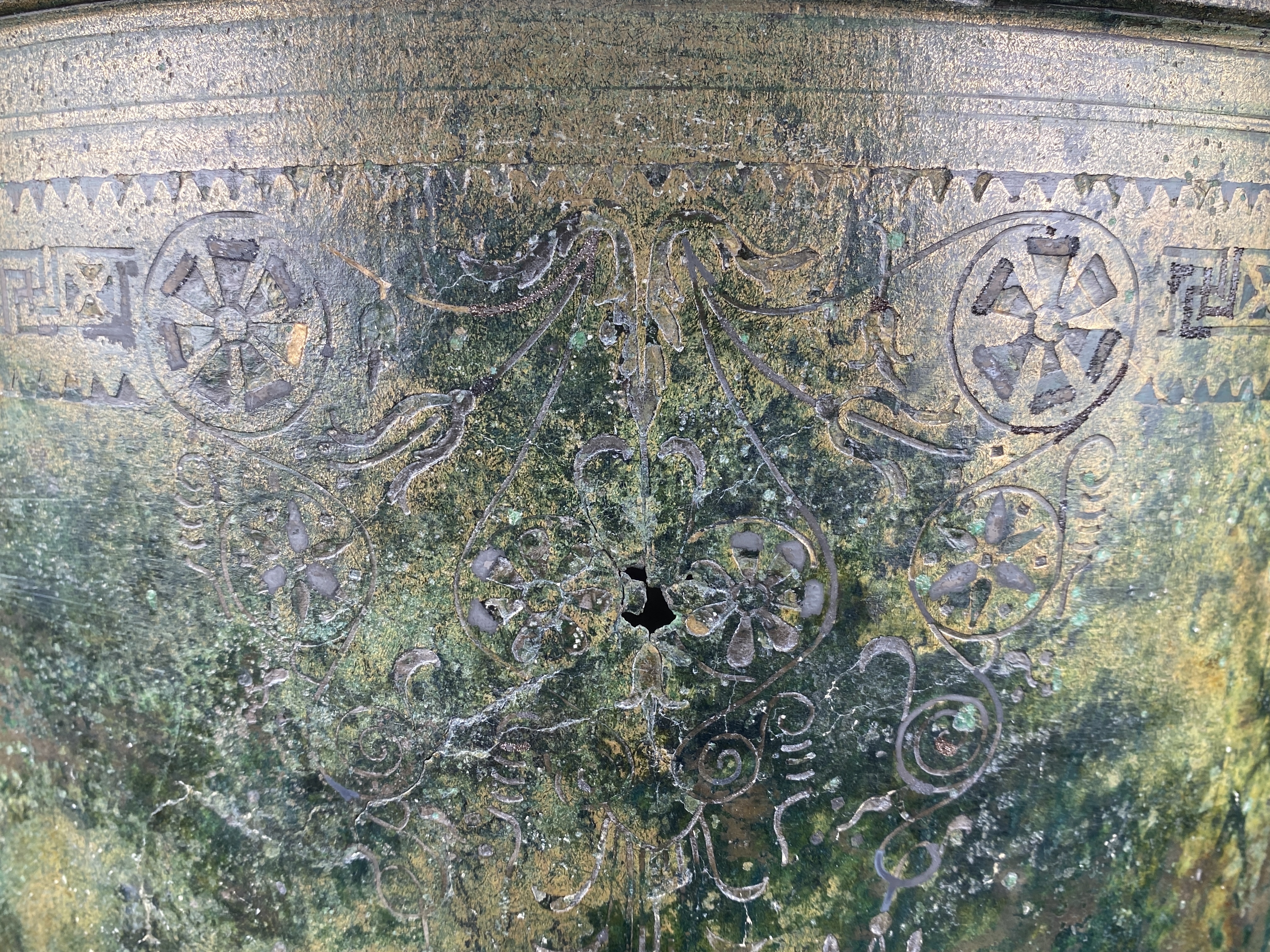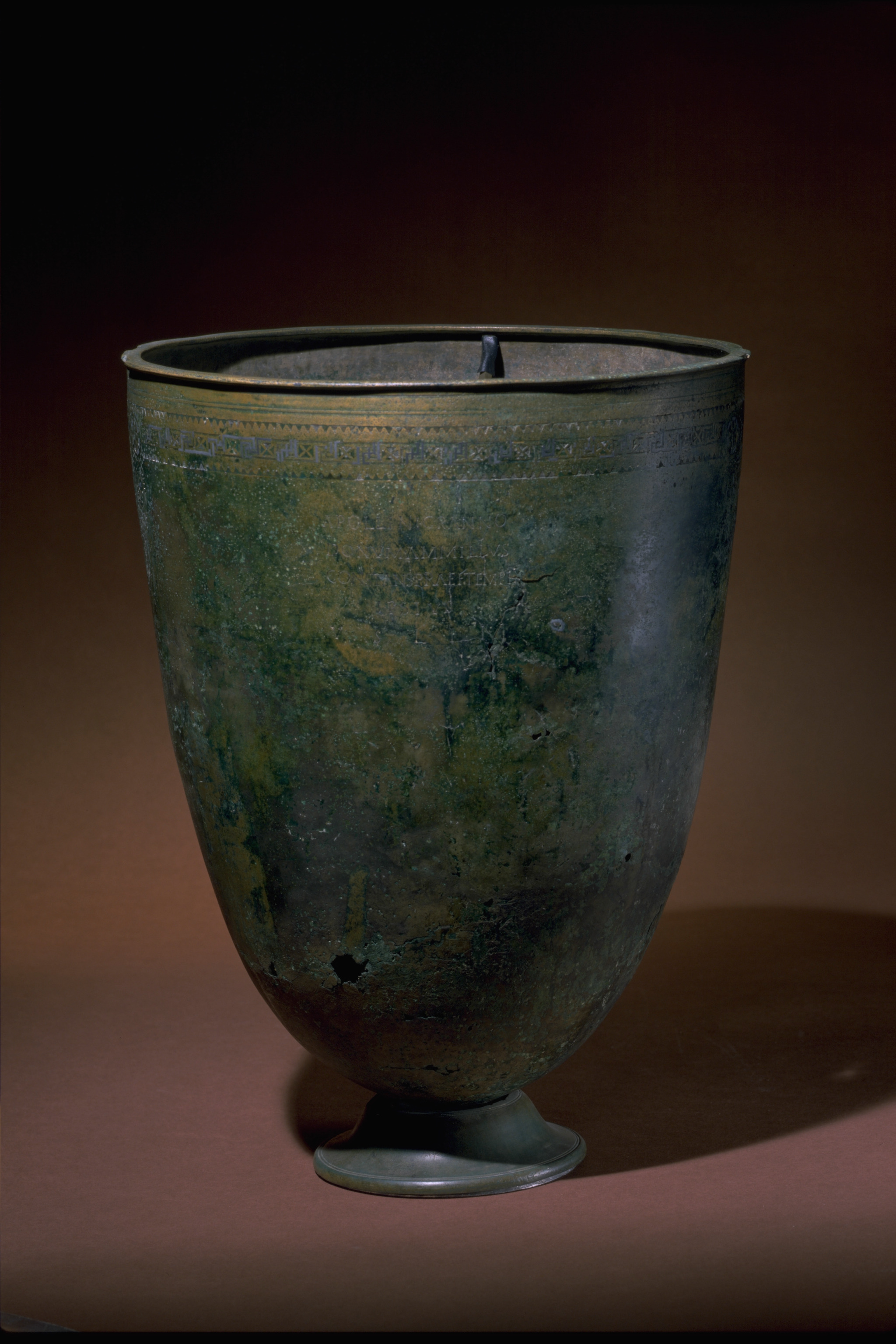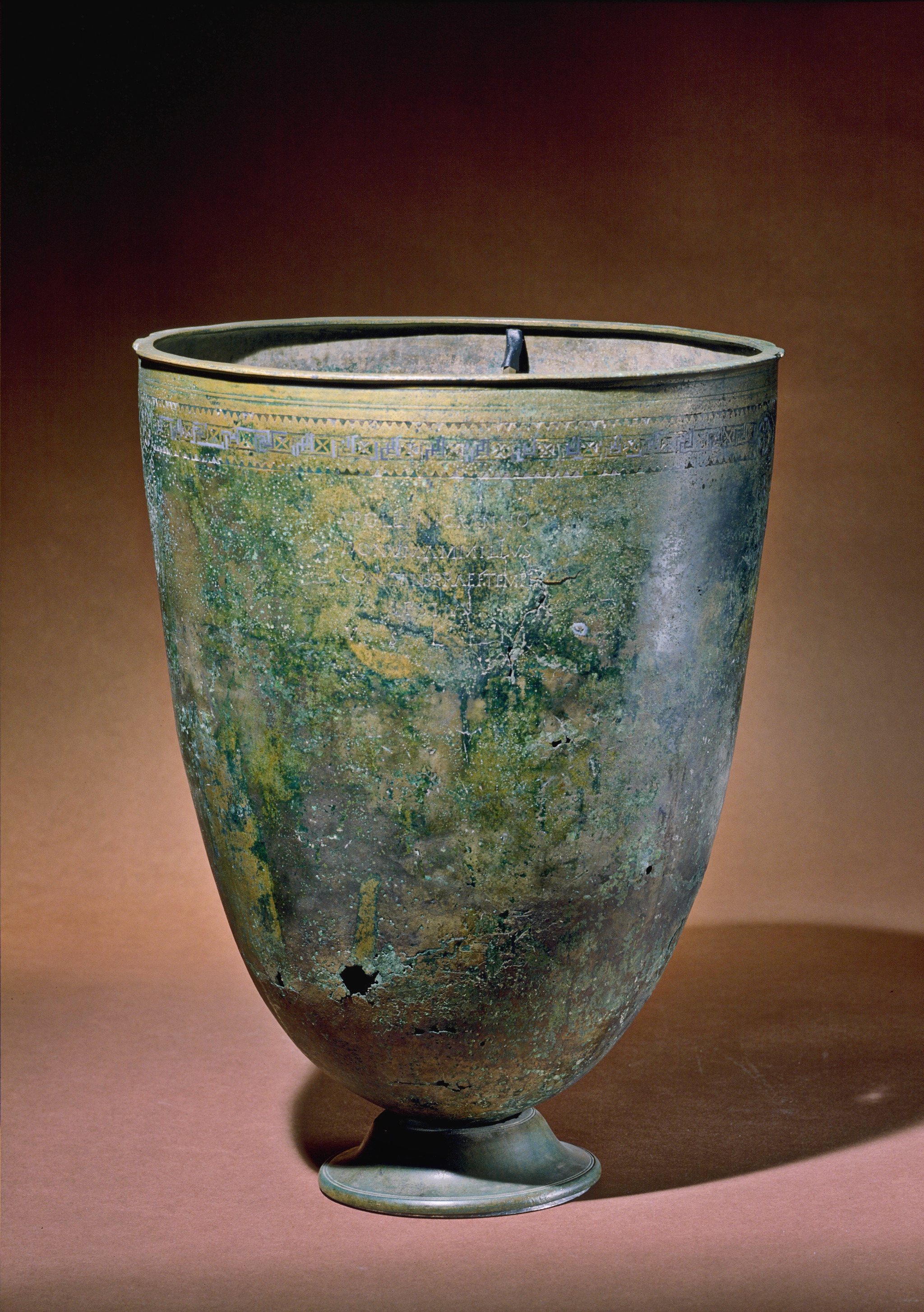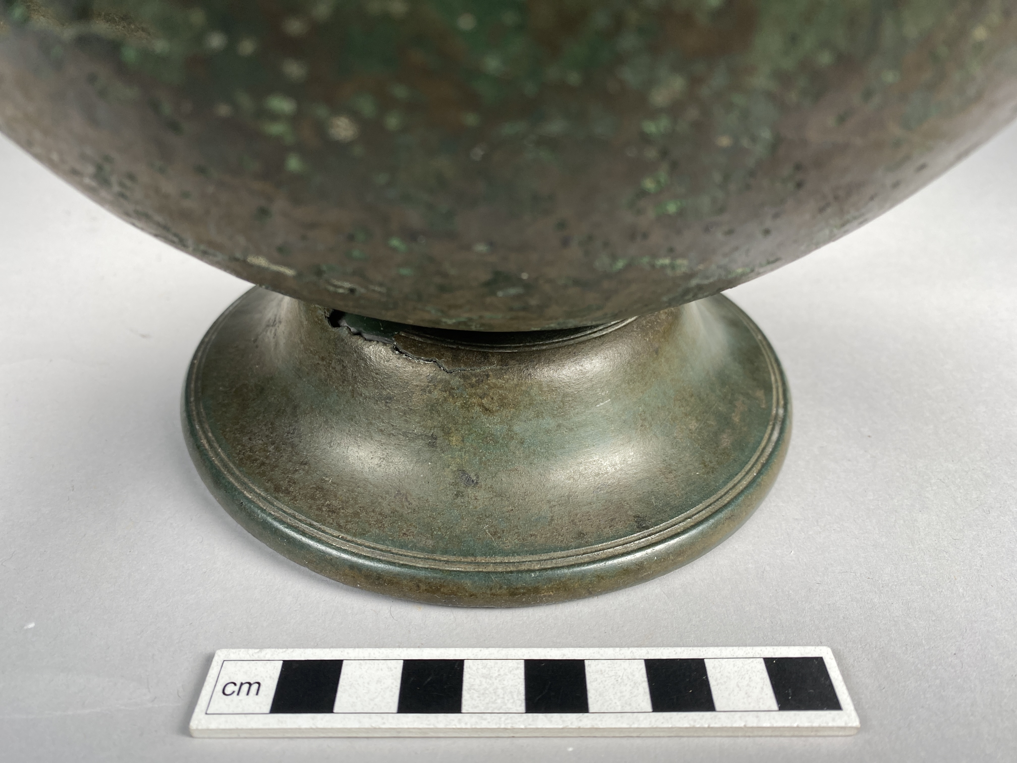 Vas av kopparlegering med inskriften APOLLINI GRANNO DONVM AMMILIVS CONSTANS PRAEF TEMPLI IPSIVS VSLLM (”Åt Apollo Grannus gav hans tempelföreståndare Ammilius Constans denna gåva”). Rik dekor med meanderband, bård med trianglar och växtornamentik. Inläggningar av annan metall/harts?. Romersk import eller plundring?