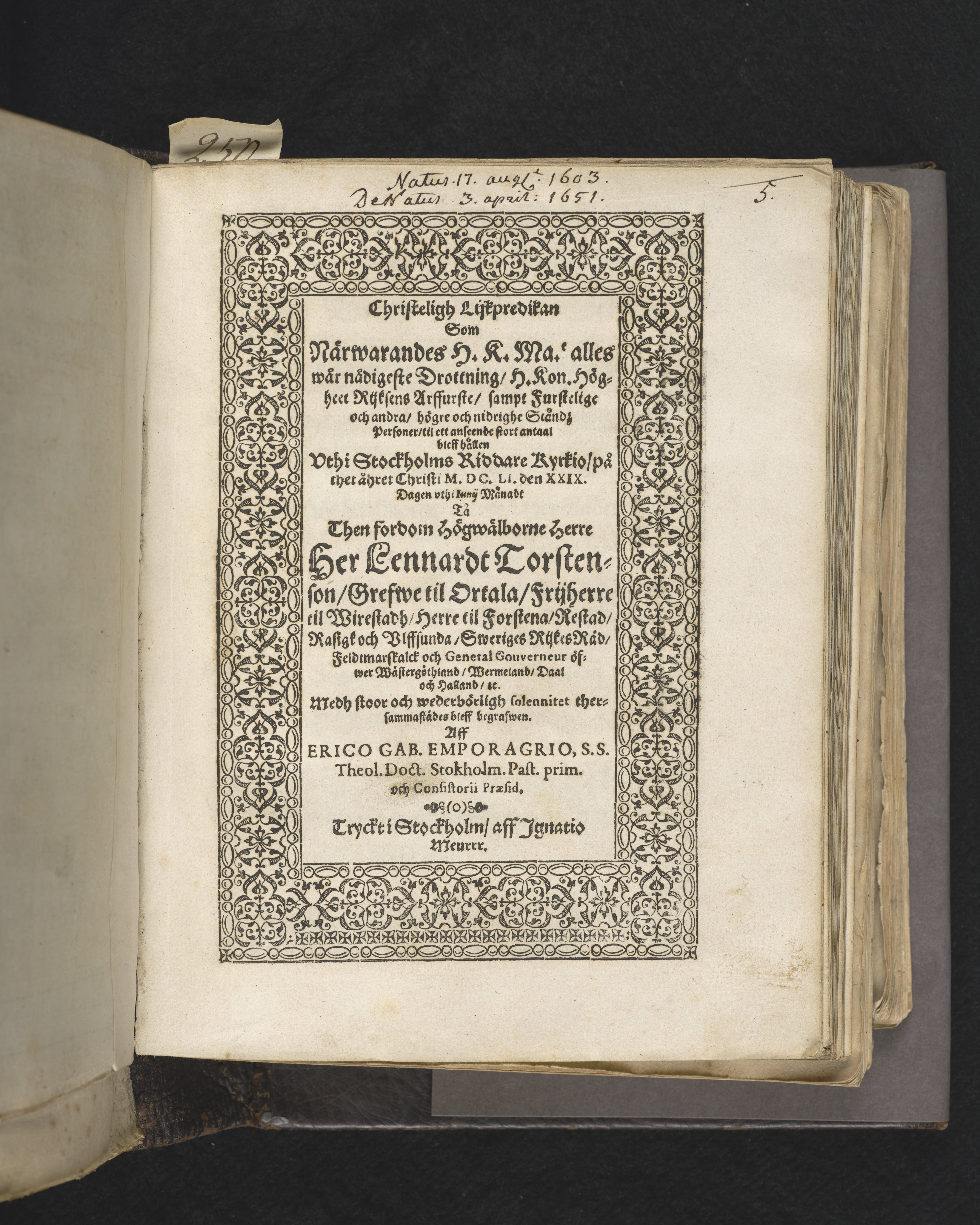 Christeligh lijkpredikan ... hållen vthi Stockholms riddare kyrkio på thet åhret Christi MDCLI. den XXIX. dagen vthi Iunij månadt tå then fordom högwälborne herre Her Lennardt Torstenson ... bleff begrafwen. Aff Erico Gab. Emporagrio ... Tryckt i Stockholm, aff Ignatio Meurer.
