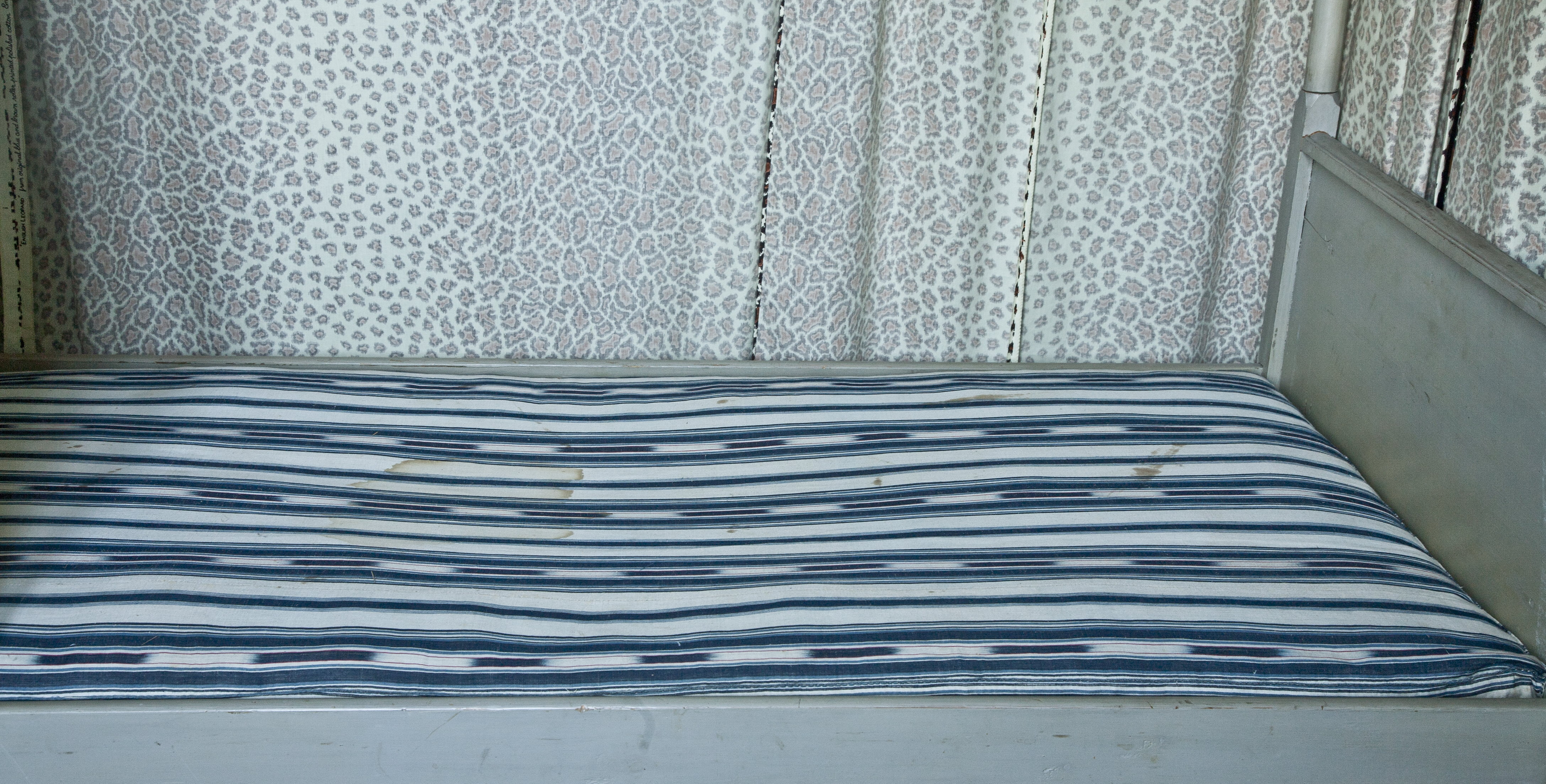 Tagelmadrass med var av blå, röd och vitrandigt linne. De blå ränderna är flammiga. Märkt: "2 2".