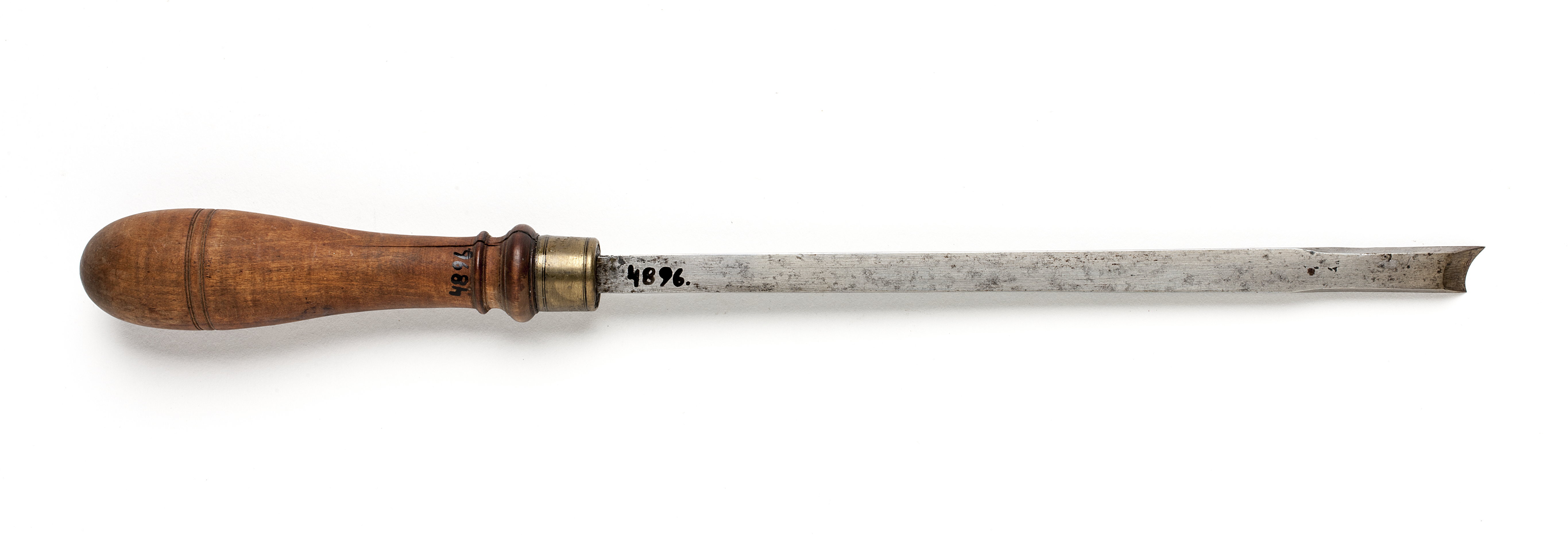 Klinga med rektangulär genomskärning. Konkav egg, sned åt vänster. Svarvat skaft av päronträ med två vulster nedtill ("skoklostertyp"). Mässingsring. Stämpel i skaftets ände vid fästet: "88" med stansar nr 5375.