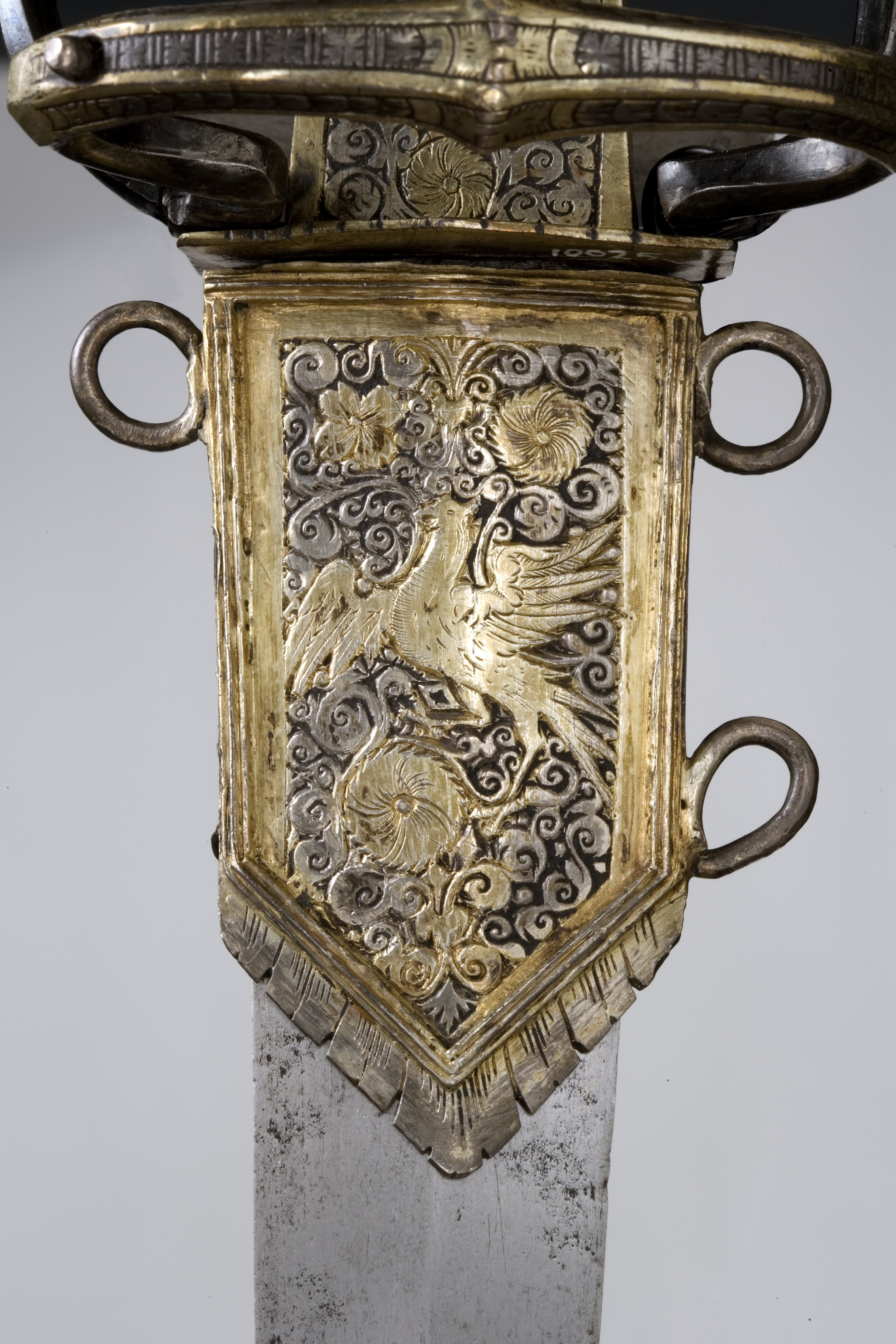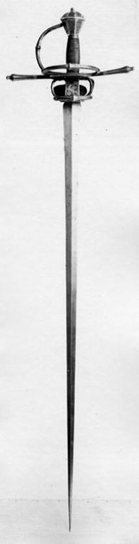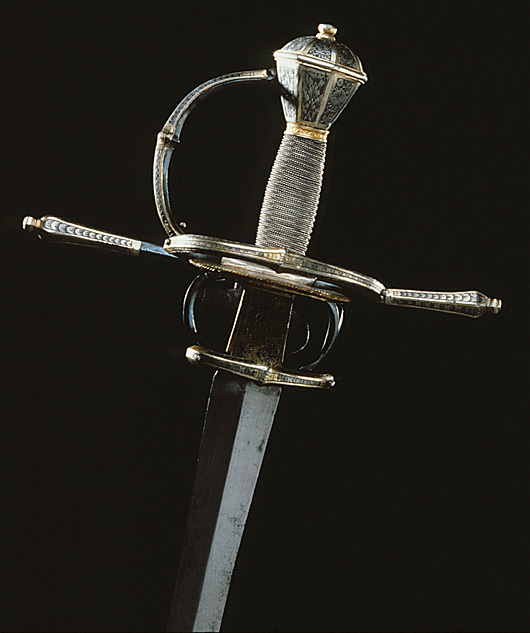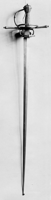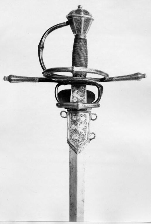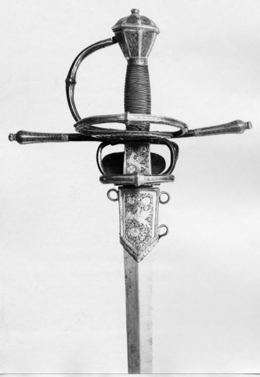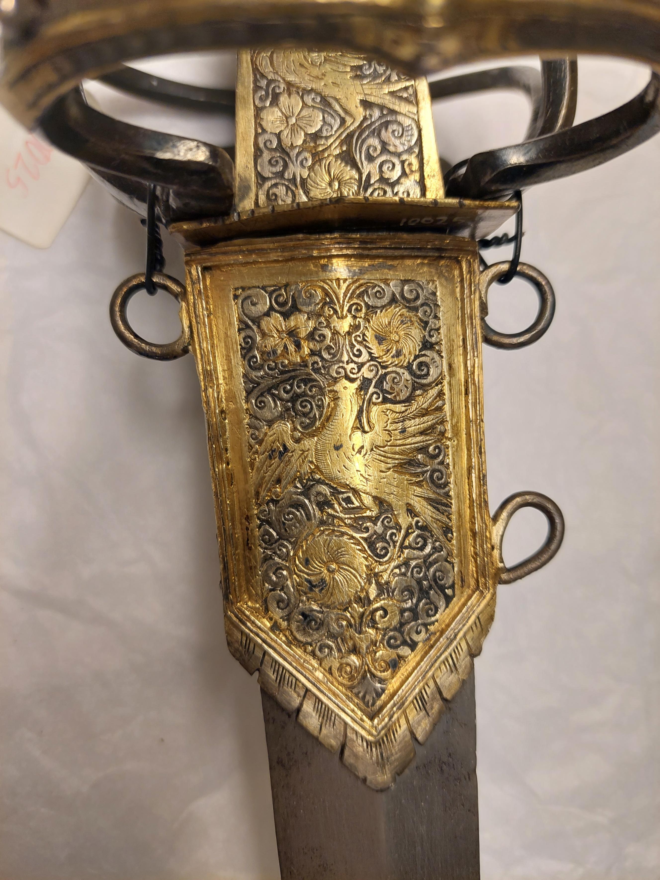 Fäste med stomme av stål, beklätt med förgylld silverplåt, ornerad med graverat ytmönster av varierande typ. Knapp åttsidig, omvänt päronformig med en slät, konvex list kring övre hälften, de åtta sidornas fält åtskilda meddelst raka, vertikala, släta lister. Fälten med ytornering av blom-och bladmotiv mot svärtad botten.Handbygel öppen, sexsidig, överdelen tryckt intill knappens framsida. De tre yttre sidorna belagda med förgylld silverplåt, ornerad med längsgående bårder, de två på sidorna med bladliknande ornament, den i mitten med stiliserade blommor. Pareranordningen i övrigt bestående av: Raka, långa, sexsidiga parerstänger med vidgade ytterdelar, de senare beklädda med förgylld silverplåt som är ornerad som den på handbygeln (främre parerstångens förgyllda silverbeslag saknas?). På utsidan en rakt utstående, stor kryssbygel, vars mittparti är beklätt med förgylld silverplåt, likaledes ornerad som handbygeln. Innanför kryssbygeln en oval parerplåt, beklädd med förgylld silverplåt och ornerad på insidan med blom-och bladrankor och den Kurländske hertigen Gotthard von Kettlers vapen, som det var utformat efter 1576. På utsidan inom blad-och blomrankor en pelikan huggande sitt bröst med näbben och med sitt blod närande sin unge, som här återgivits framför bröstet. På basen av parerplåtens utsida en silverstämpel i form av ett halvt hjorthorn (Mitau Beschau, LRK vägl. 1921:436). Höga fingerbyglar av mörkt blånerat stål, på utsidan förenade med en tvärbygel. På insidan nedanför krysset i samma metall en uppåtböjd, oval parerplåt, som upptill är ansluten till en inre kryssbygel, denna förenad med krysset medelst en uppåtböjd tumbygel. Kavellindning av omväxlande slät och tvinnad silvertråd. Klinga rak, tvåeggad, jämnt avsmalnande från basen till udden (vars yttre spets är avbruten), slipad med mötande, jämnbreda skär och med en ca 43 mm lång ricasso, som är överklädd med en hylsa av förgyllt silver, vars utsida är ornerad med en fågel med bakåtvänt huvud mot en bakgrund av blom- och bladmönster. Den punsade dekoren saknas (jfr 10024). Tillbehör: Munbleck till balja, h: 81 mm av förgyllt silver, på utsidan med graverad och snidad blom-och bladdekor med en fågel i mitten, allt inom en slät ram och vulstformig, räfflad kant. Bleckets nedre kant vinkelformig och flikig. På ena kanten två, på den andra en rund hållare för koppelringar. Insidan slät med två stämplar upptill, sköldar med H R (ligatur) och hjorthorn (LRK vägl.1921:436-437, Rosenberg nr 7492).