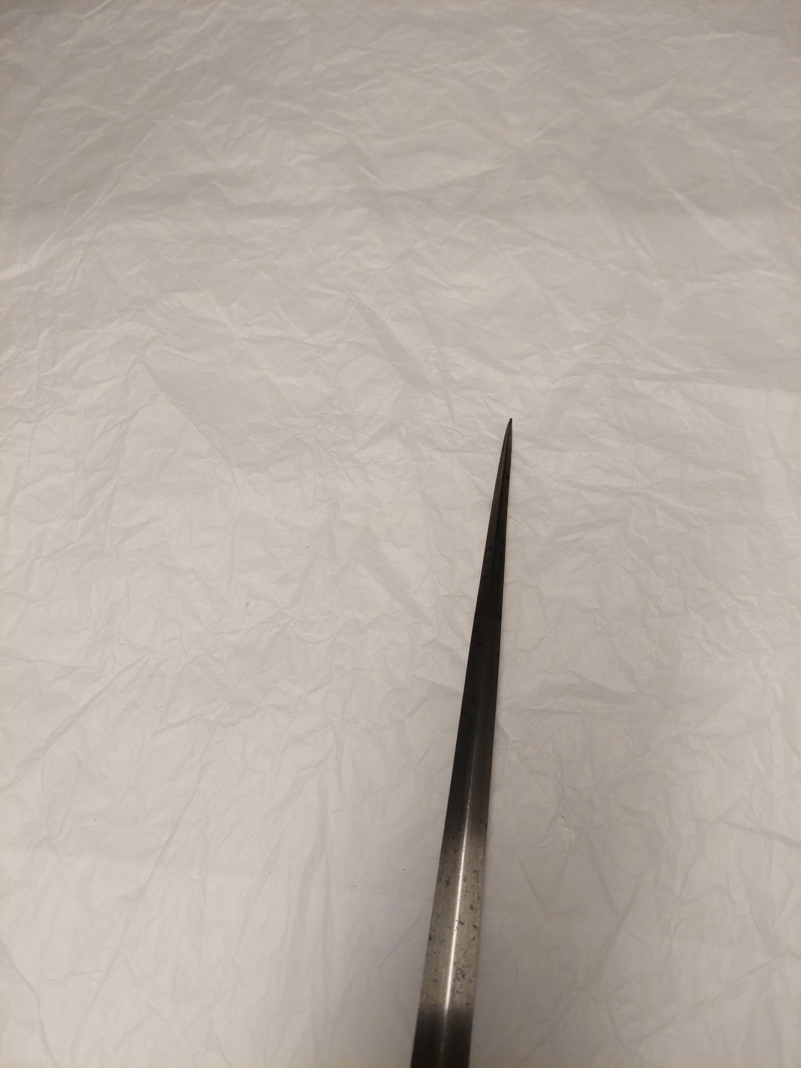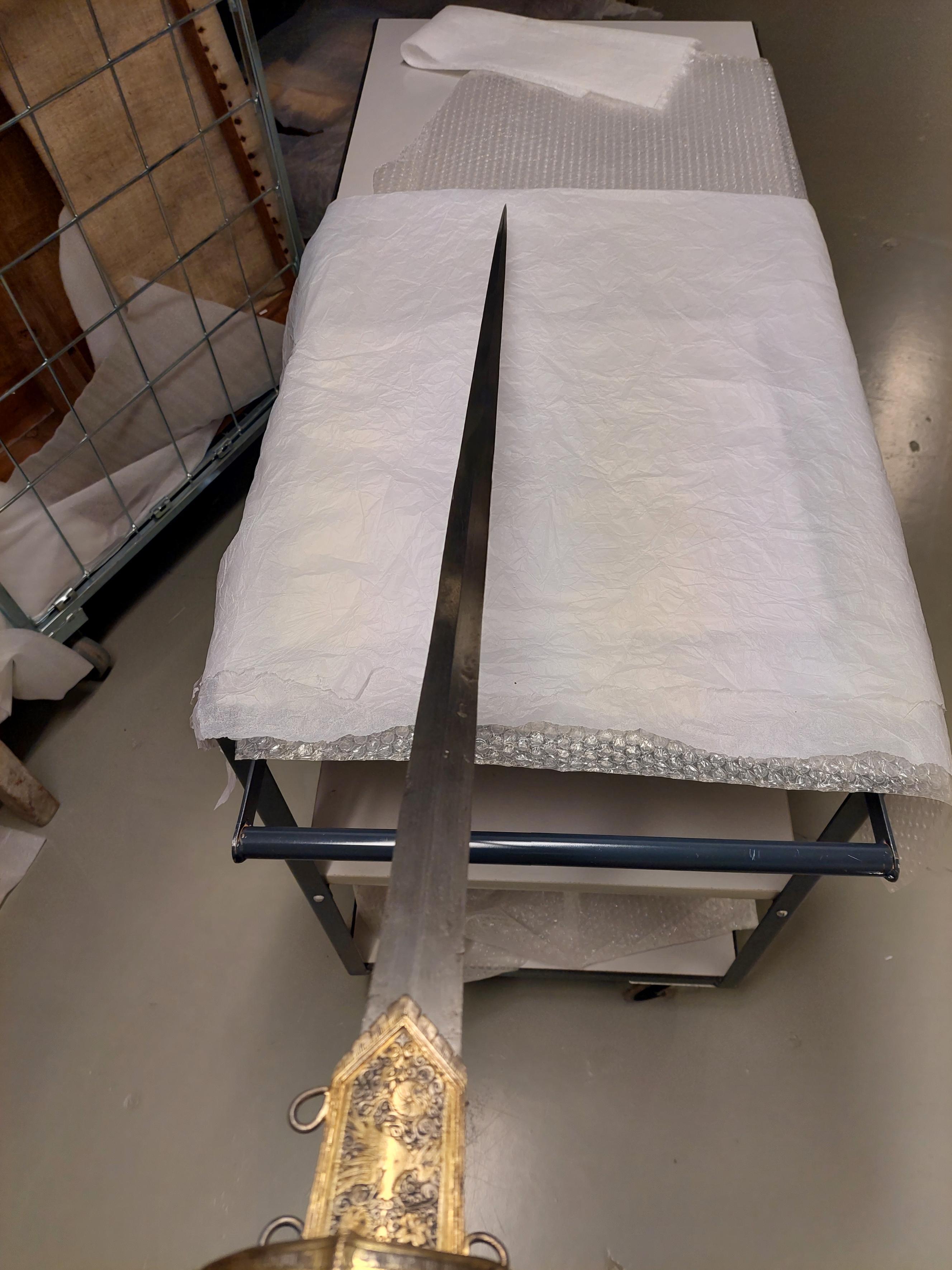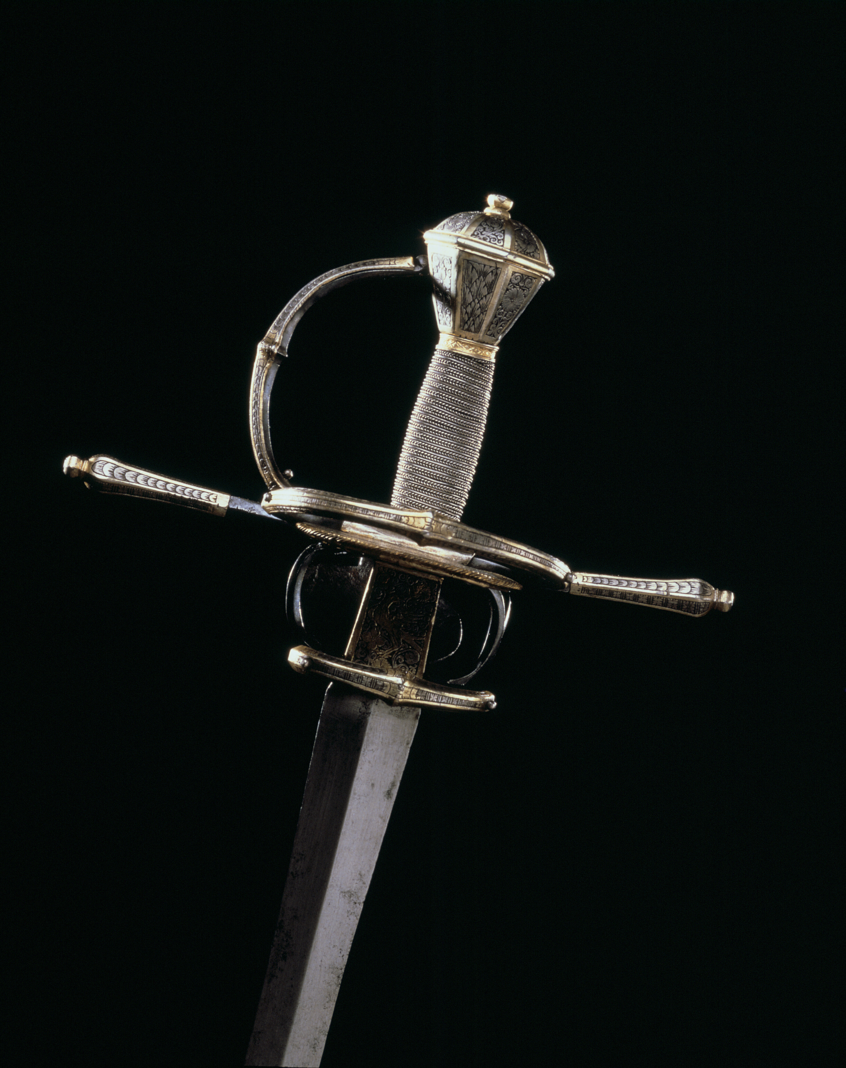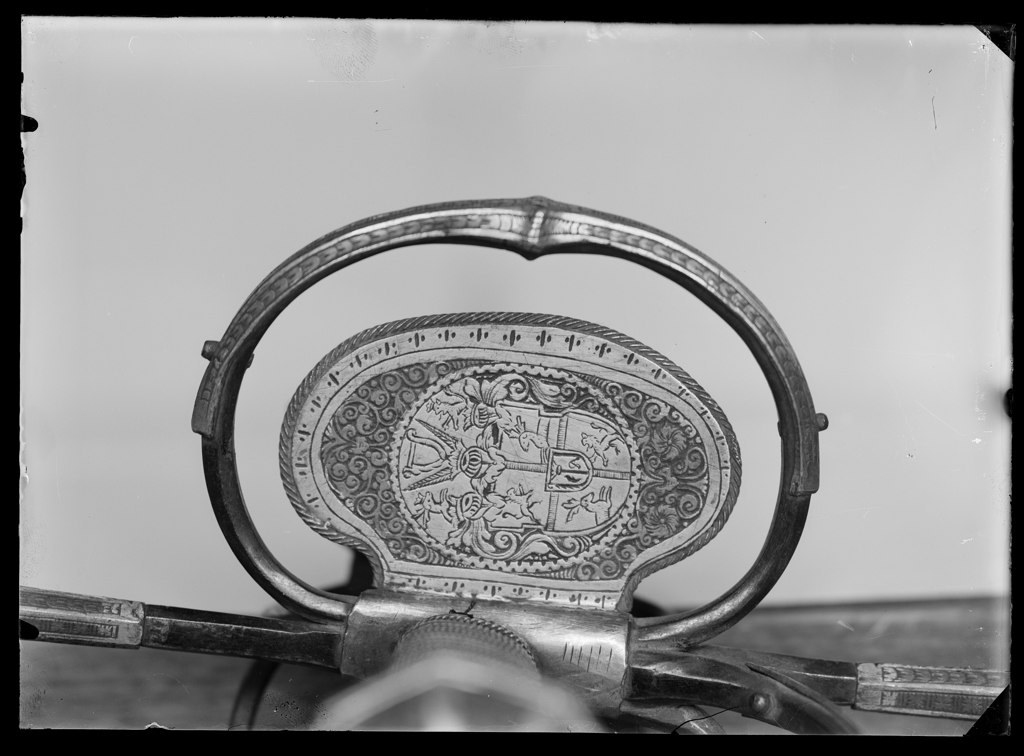 Fäste med stomme av stål, beklätt med förgylld silverplåt, ornerad med graverat ytmönster av varierande typ. Knapp åttsidig, omvänt päronformig med en slät, konvex list kring övre hälften, de åtta sidornas fält åtskilda meddelst raka, vertikala, släta lister. Fälten med ytornering av blom-och bladmotiv mot svärtad botten.Handbygel öppen, sexsidig, överdelen tryckt intill knappens framsida. De tre yttre sidorna belagda med förgylld silverplåt, ornerad med längsgående bårder, de två på sidorna med bladliknande ornament, den i mitten med stiliserade blommor. Pareranordningen i övrigt bestående av: Raka, långa, sexsidiga parerstänger med vidgade ytterdelar, de senare beklädda med förgylld silverplåt som är ornerad som den på handbygeln (främre parerstångens förgyllda silverbeslag saknas?). På utsidan en rakt utstående, stor kryssbygel, vars mittparti är beklätt med förgylld silverplåt, likaledes ornerad som handbygeln. Innanför kryssbygeln en oval parerplåt, beklädd med förgylld silverplåt och ornerad på insidan med blom-och bladrankor och den Kurländske hertigen Gotthard von Kettlers vapen, som det var utformat efter 1576. På utsidan inom blad-och blomrankor en pelikan huggande sitt bröst med näbben och med sitt blod närande sin unge, som här återgivits framför bröstet. På basen av parerplåtens utsida en silverstämpel i form av ett halvt hjorthorn (Mitau Beschau, LRK vägl. 1921:436). Höga fingerbyglar av mörkt blånerat stål, på utsidan förenade med en tvärbygel. På insidan nedanför krysset i samma metall en uppåtböjd, oval parerplåt, som upptill är ansluten till en inre kryssbygel, denna förenad med krysset medelst en uppåtböjd tumbygel. Kavellindning av omväxlande slät och tvinnad silvertråd. Klinga rak, tvåeggad, jämnt avsmalnande från basen till udden (vars yttre spets är avbruten), slipad med mötande, jämnbreda skär och med en ca 43 mm lång ricasso, som är överklädd med en hylsa av förgyllt silver, vars utsida är ornerad med en fågel med bakåtvänt huvud mot en bakgrund av blom- och bladmönster. Den punsade dekoren saknas (jfr 10024). Tillbehör: Munbleck till balja, h: 81 mm av förgyllt silver, på utsidan med graverad och snidad blom-och bladdekor med en fågel i mitten, allt inom en slät ram och vulstformig, räfflad kant. Bleckets nedre kant vinkelformig och flikig. På ena kanten två, på den andra en rund hållare för koppelringar. Insidan slät med två stämplar upptill, sköldar med H R (ligatur) och hjorthorn (LRK vägl.1921:436-437, Rosenberg nr 7492).