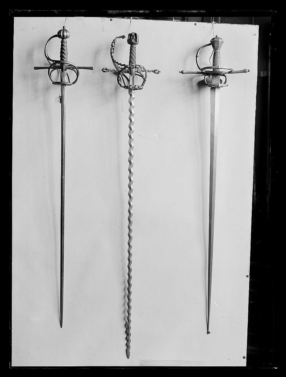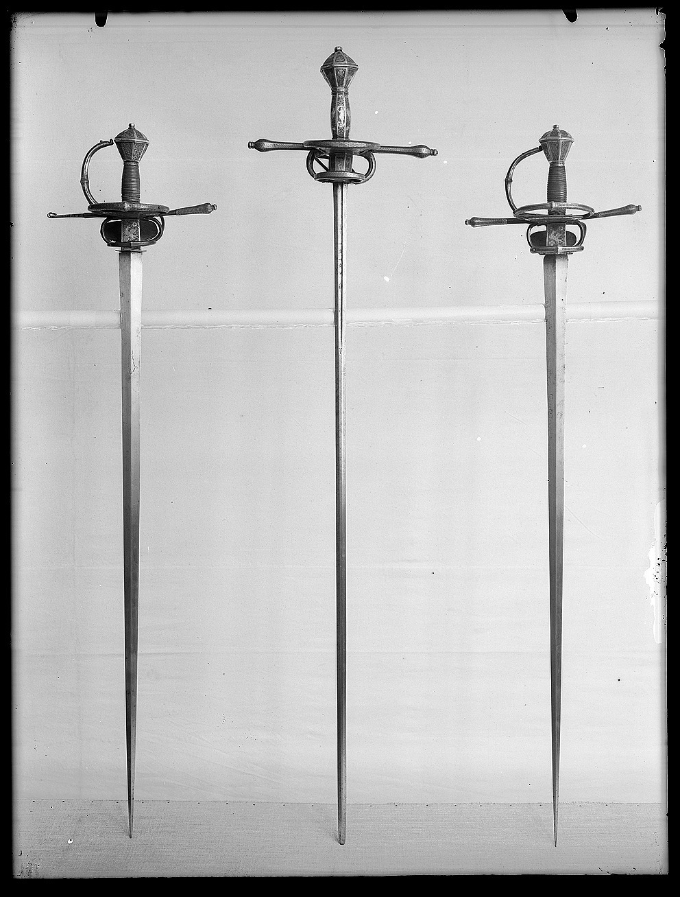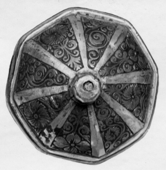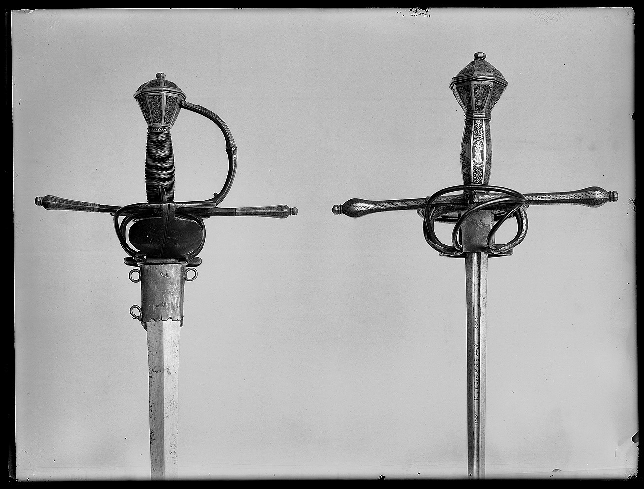 Fäste med stomme av stål, beklätt med förgylld silverplåt, ornerad med graverat ytmönster av varierande typ. Knapp åttsidig, omvänt päronformig med en slät, konvex list kring övre hälften, de åtta sidornas fält åtskilda meddelst raka, vertikala, släta lister. Fälten med ytornering av blom-och bladmotiv mot svärtad botten.Handbygel öppen, sexsidig, överdelen tryckt intill knappens framsida. De tre yttre sidorna belagda med förgylld silverplåt, ornerad med längsgående bårder, de två på sidorna med bladliknande ornament, den i mitten med stiliserade blommor. Pareranordningen i övrigt bestående av: Raka, långa, sexsidiga parerstänger med vidgade ytterdelar, de senare beklädda med förgylld silverplåt som är ornerad som den på handbygeln (främre parerstångens förgyllda silverbeslag saknas?). På utsidan en rakt utstående, stor kryssbygel, vars mittparti är beklätt med förgylld silverplåt, likaledes ornerad som handbygeln. Innanför kryssbygeln en oval parerplåt, beklädd med förgylld silverplåt och ornerad på insidan med blom-och bladrankor och den Kurländske hertigen Gotthard von Kettlers vapen, som det var utformat efter 1576. På utsidan inom blad-och blomrankor en pelikan huggande sitt bröst med näbben och med sitt blod närande sin unge, som här återgivits framför bröstet. På basen av parerplåtens utsida en silverstämpel i form av ett halvt hjorthorn (Mitau Beschau, LRK vägl. 1921:436). Höga fingerbyglar av mörkt blånerat stål, på utsidan förenade med en tvärbygel. På insidan nedanför krysset i samma metall en uppåtböjd, oval parerplåt, som upptill är ansluten till en inre kryssbygel, denna förenad med krysset medelst en uppåtböjd tumbygel. Kavellindning av omväxlande slät och tvinnad silvertråd. Klinga rak, tvåeggad, jämnt avsmalnande från basen till udden (vars yttre spets är avbruten), slipad med mötande, jämnbreda skär och med en ca 43 mm lång ricasso, som är överklädd med en hylsa av förgyllt silver, vars utsida är ornerad med en fågel med bakåtvänt huvud mot en bakgrund av blom- och bladmönster. Den punsade dekoren saknas (jfr 10024). Tillbehör: Munbleck till balja, h: 81 mm av förgyllt silver, på utsidan med graverad och snidad blom-och bladdekor med en fågel i mitten, allt inom en slät ram och vulstformig, räfflad kant. Bleckets nedre kant vinkelformig och flikig. På ena kanten två, på den andra en rund hållare för koppelringar. Insidan slät med två stämplar upptill, sköldar med H R (ligatur) och hjorthorn (LRK vägl.1921:436-437, Rosenberg nr 7492).