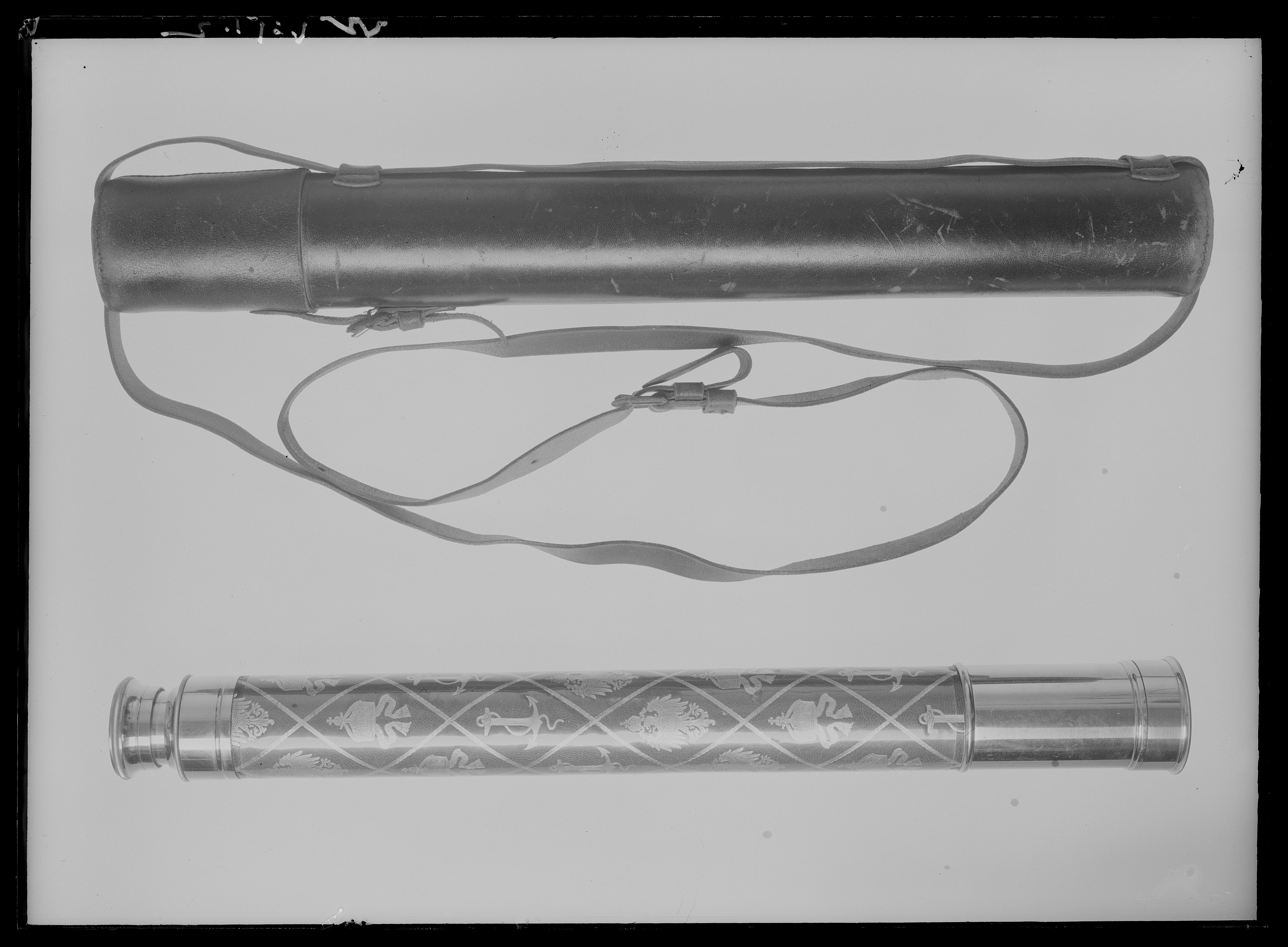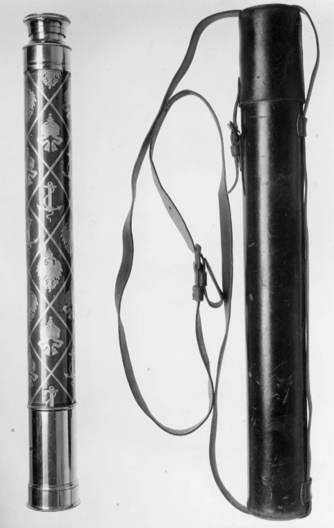 Rund stav klädd med rött ä„der, ornerat i guldtryck med nät bildande rombiska fält i vilka finns emblem: tysk kejsarkrona, tyska riksvapnet, ankare. Lädret täckt av genomskinlig celluloid. I ändarna beslag av förnicklad vitmetall som utgör delar av en tub, som kan dras ut. På den bakre utdragbara delen: "Voigtländer & Sohn, A.G. // Braunschweig", och siffran -5069. På den inskruvade delen ristad romersk siffra 14. Skyddshylsa på framänden av samma material.