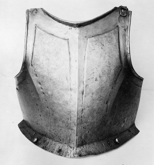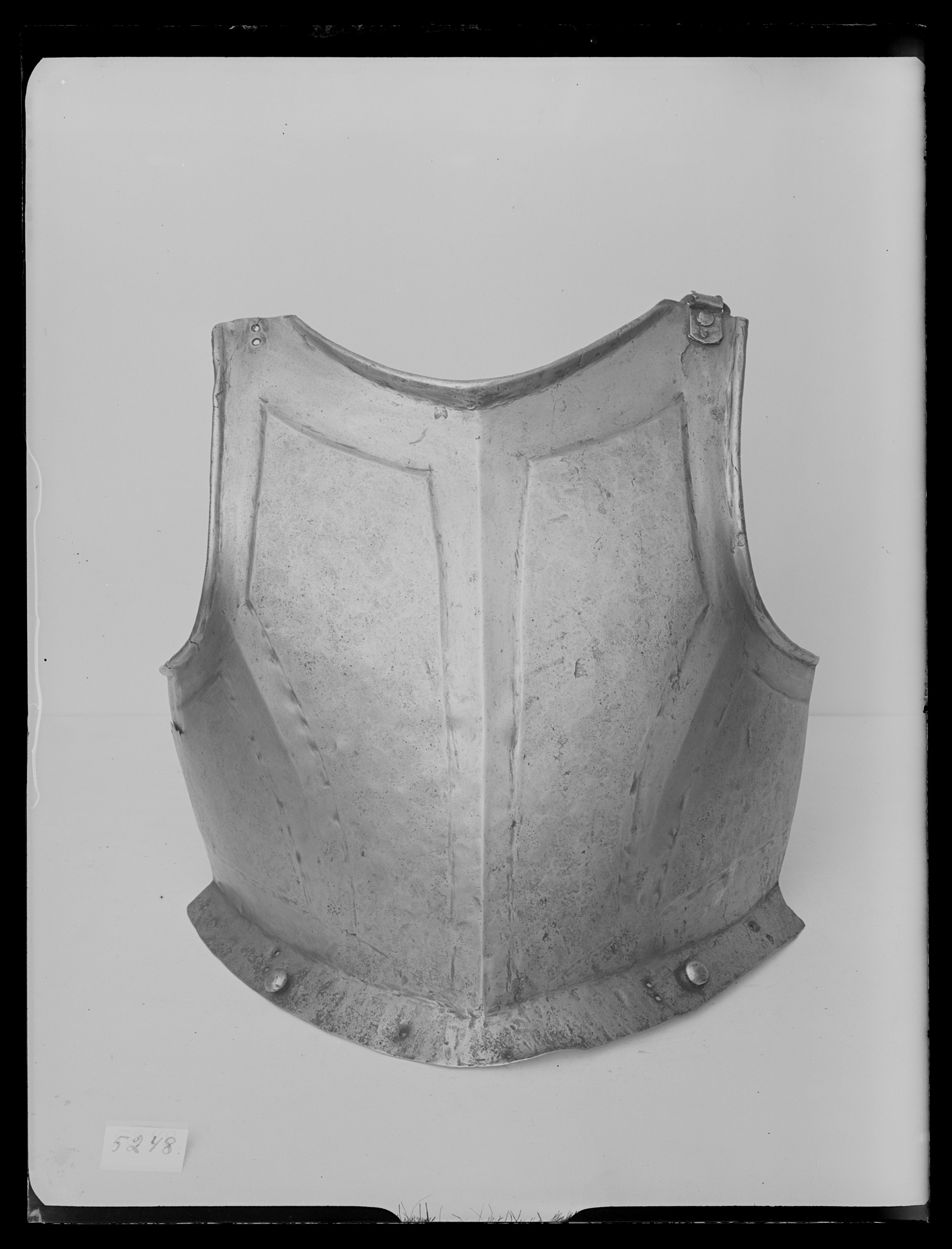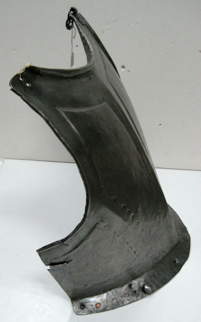 Av stål drivet i ett stycke, utsidan blank och insidan svärtad. Slagmärken på bägge sidor. Överdelen flack sedan nedåt ökande i bredd med snett utåtriktad krage, B 35 mm. Tydlig mittås från hals till krage. Rundade urtagningar för hals och armar. Vid halsen långsmal med invikt och tämligen hög kant, i mitten 15 mm. Under kanten en inslagen stämpel. Armarnas kant omvikt inåt och rundsmidd. Kragkanten rak. Försänkt slät bård längs armar, hals och mellan hals-krage samt snett mellan armhål-krage. Bården smalare runt armarna. Ursprungligen spännen vid axlarna, höger saknas. Spännet av stål, format likt två ovaler och med punsade linjer i ytterkant.