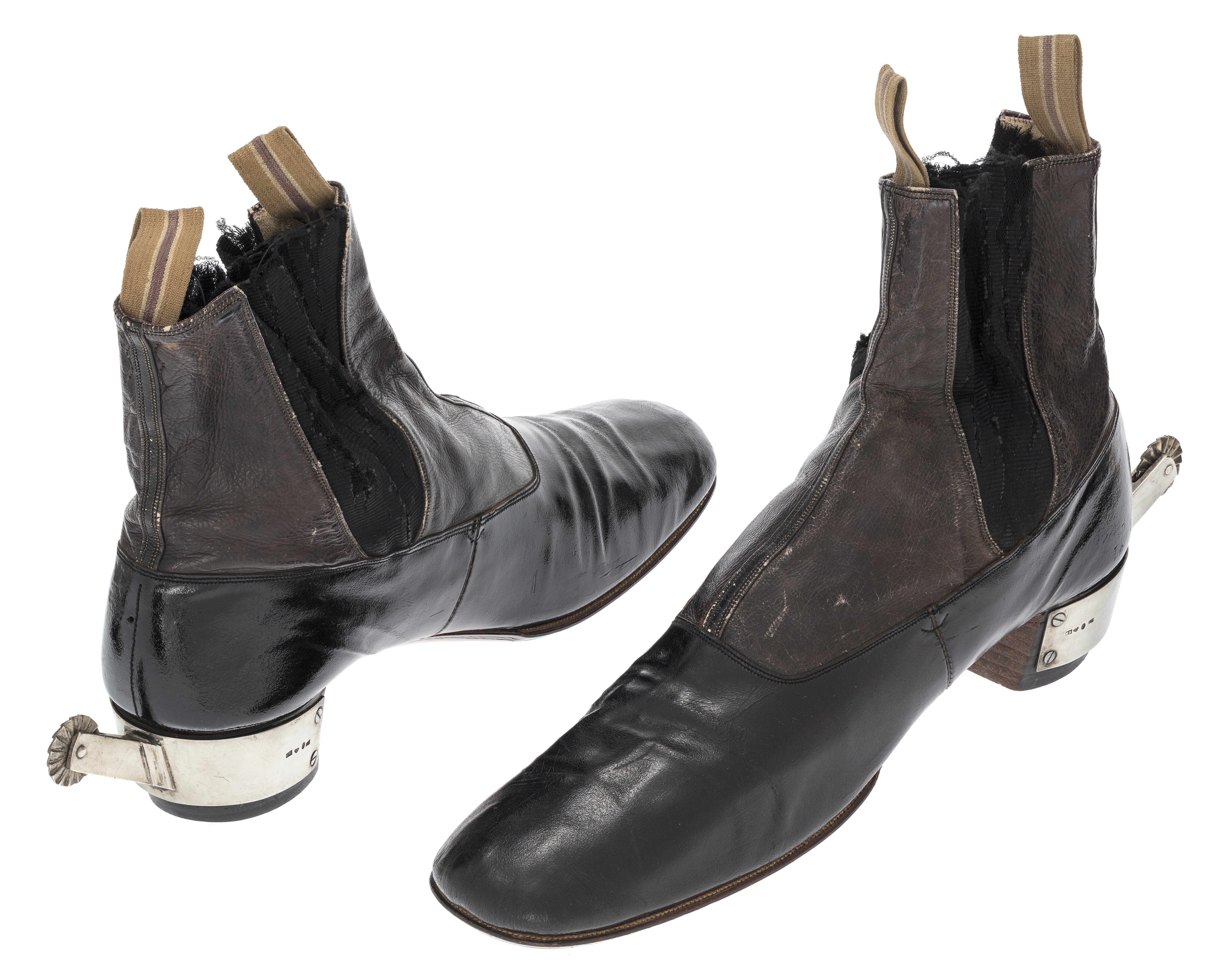 Stövlettens längd motsvarar idag storlek ca 42,5. Stövlett av tunt svart lackskinn skuren med reseft och bakkappa och svagt rundad tå. Skaftet är gjort av brunt getskinn med söm mitt fram och bak. Sidorna har infällda kilar av svart resår. Sulan är av ljusbrunt nötläder. På klacken sitter en silversporre med fyrkantig, rak hals och mångstrålig stålklinga. Sporrarna är tillverkade av Christian Hammer. ( se invnr 13312-13) Stövlett buren av Karl XV vid kröningen i Storkyrkan i Stockholm den 3 maj 1860.