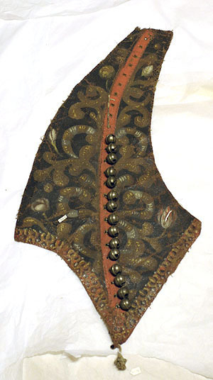 Slädtäcke av en oregelbunden form trekantig form. Av lärft bemålad svart med ett mönster av blommor och blad. I kanterna löper en röd bård bemålad med snäckliknande dekoration Mitt på slädtäcket sitter 15 små bjällror fästade på en röd rand som löper längs med mitten.