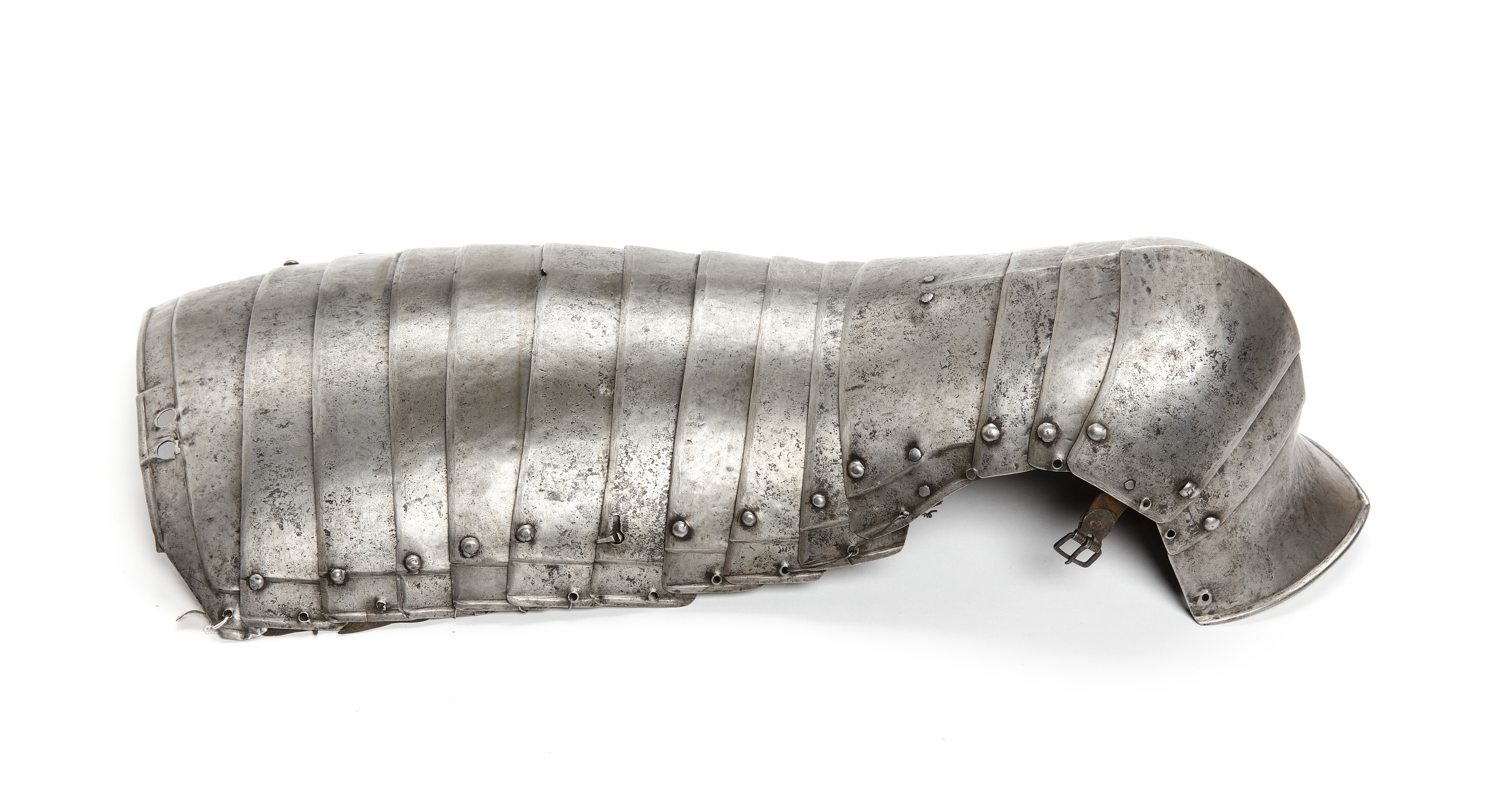 Vänster tassett till kyrassiärrustning i 16 delar, delbar mellan sjätte och sjunde lamellen. Översta lamellen svagt kupad för att passa mot harneskets utvik. Över och innerkant med försänkt bård samt i överkant, två hål för fästning i harnesk. något avtagen i övre inre hörnet. Nästföljande fem lameller med svagt fasade överkanter. Insidans ytterkanter med svagt veck och försänkt bård. Ytterkanten med svagt veck. Den sjätte lamellen uppifrån med inåt omvikt, rundsmidd mejslad kant. Vid innerkanten en vridnit och vid ytterkanten en svampformad nit för fästning i den nedre delen av tassetten. Den övre delen av tassetten bildar vad man kan kalla en kort tassett. Sjunde till tioende lamellerna med likadant utseende som de övre. Första till tioende lamellerna är nitade direkt i varandra i ytterkant i avlånga hål och i mitten och i innerkant sitter de på läderrem med nit. Spår av läder även i ytterkant. Knäled bestående av sex delar med mittås. Samtliga kanter svagt fasade, förutom nederkanten som är inåt omvikt och rundsmidd. Knäbuckla med bladformig, enkel mussla med inåt omvikt, rundsmidd kant. Delarna är nitade direkt varandra. Den sjätte lamellen med en läderrem för att fästa tassetten mot låret. BAksidan av knäbucklanmed rem och spänne för fästning mot knävecket. Ursprungligen har samtliga delar varit svärtade. Sekundärt upptagna hål längs ytterkanten.